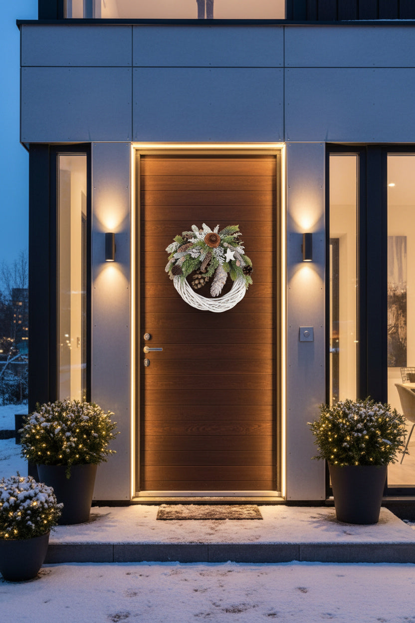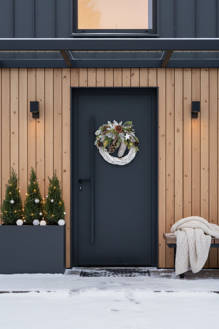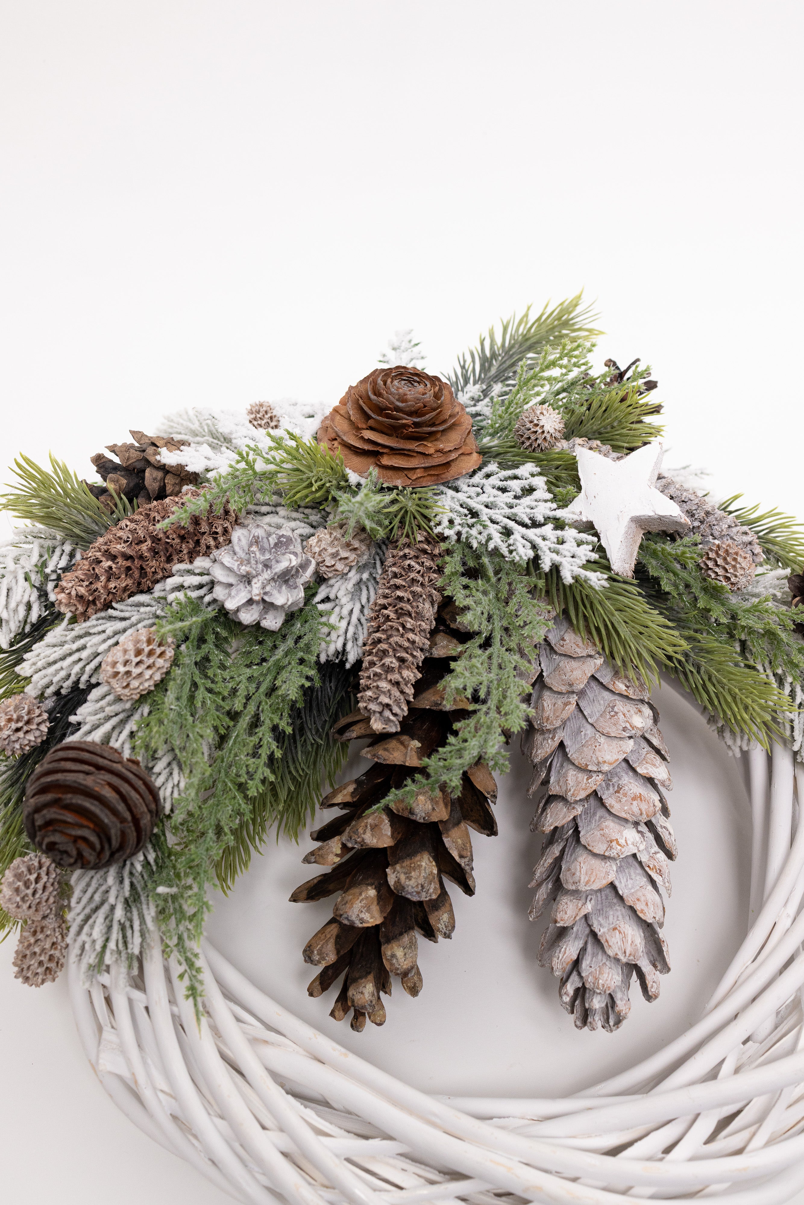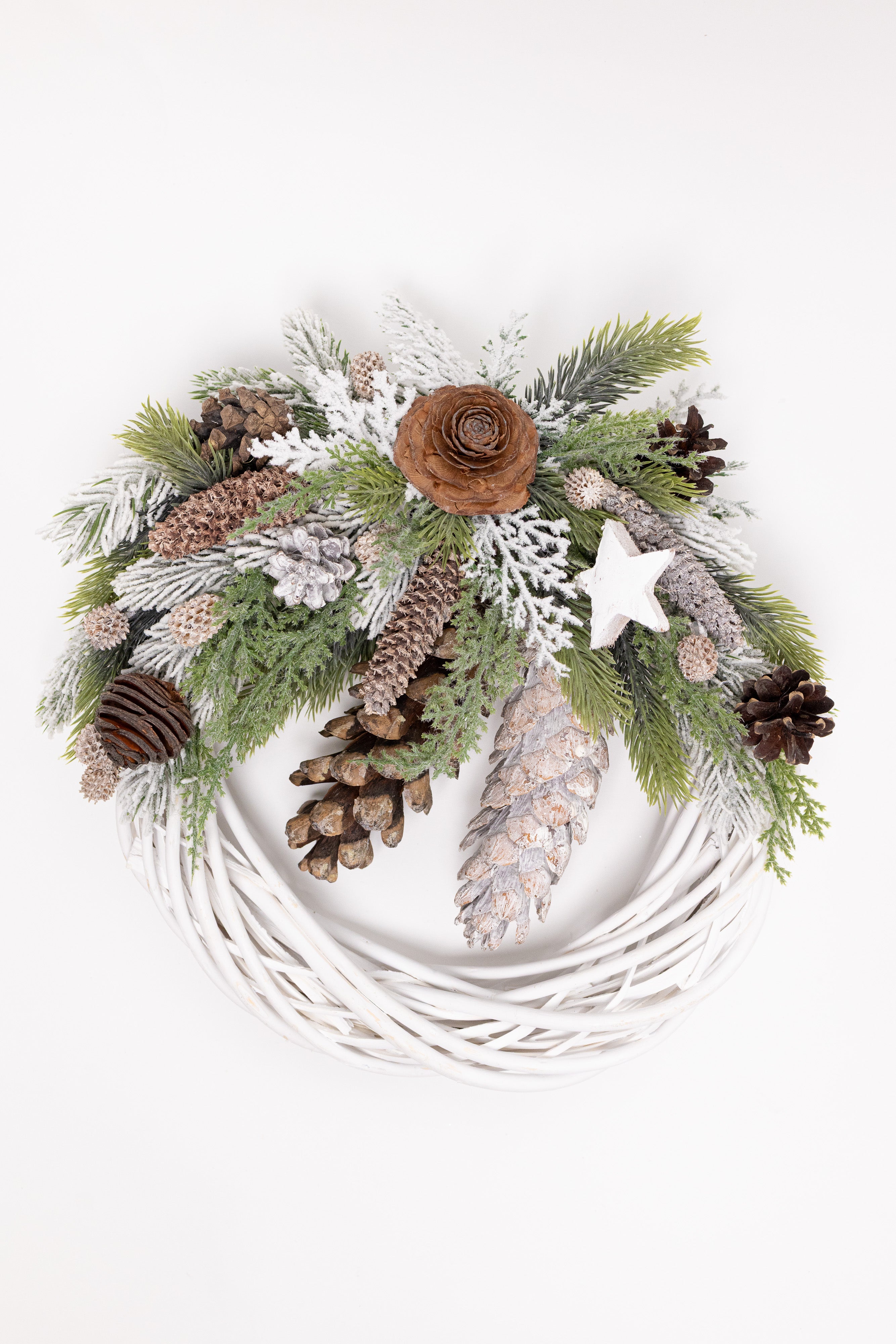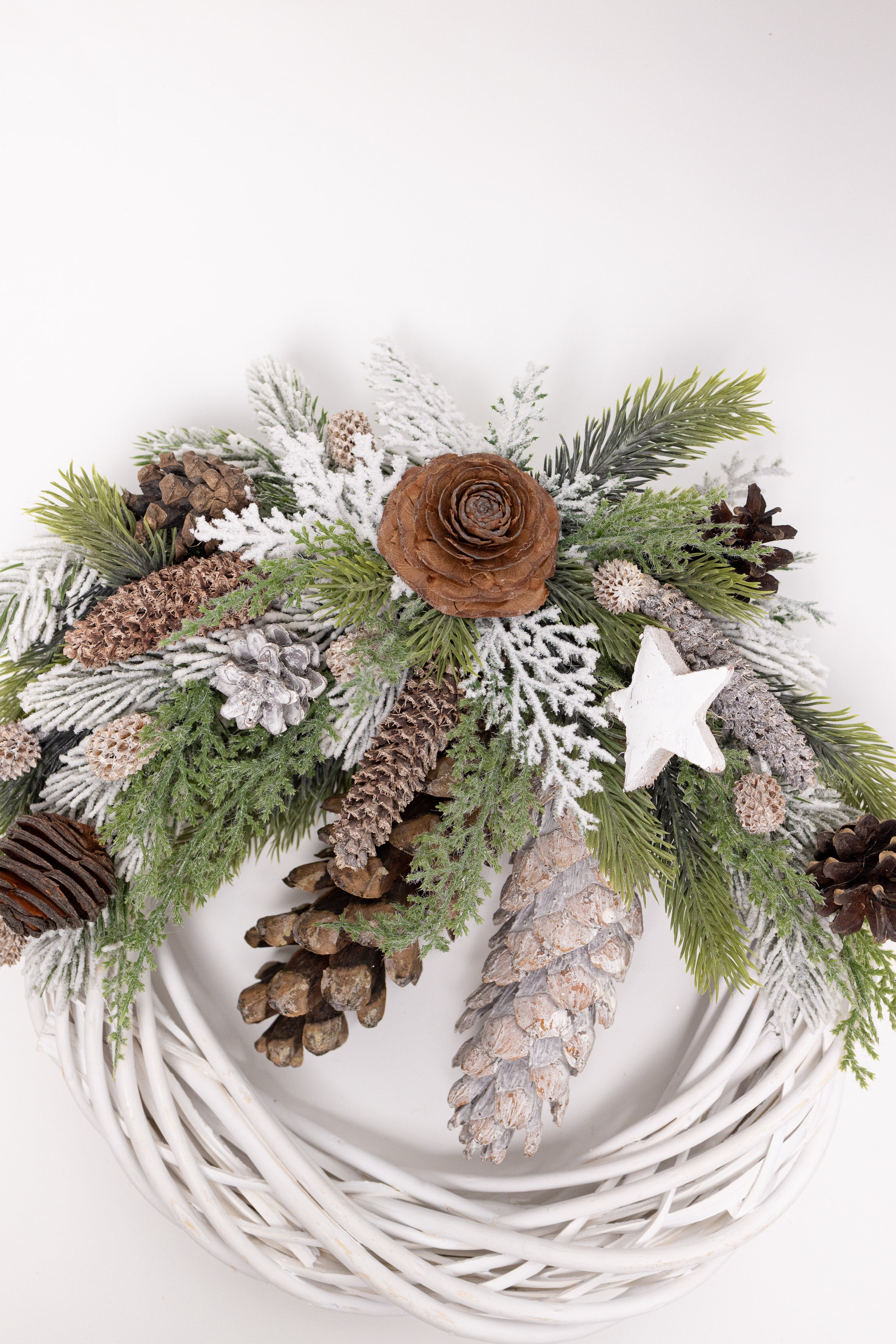 O decorațiune rustic-elegantă, lucrată manual pe o bază circulară din lemn natural împletit, finisată în alb mat. Aranjamentul asimetric impresionează prin bogăția de conuri naturale de diverse forme, ramuri de brad nins, tuia verde și o steluță din lemn albă. Un design cald și organic.