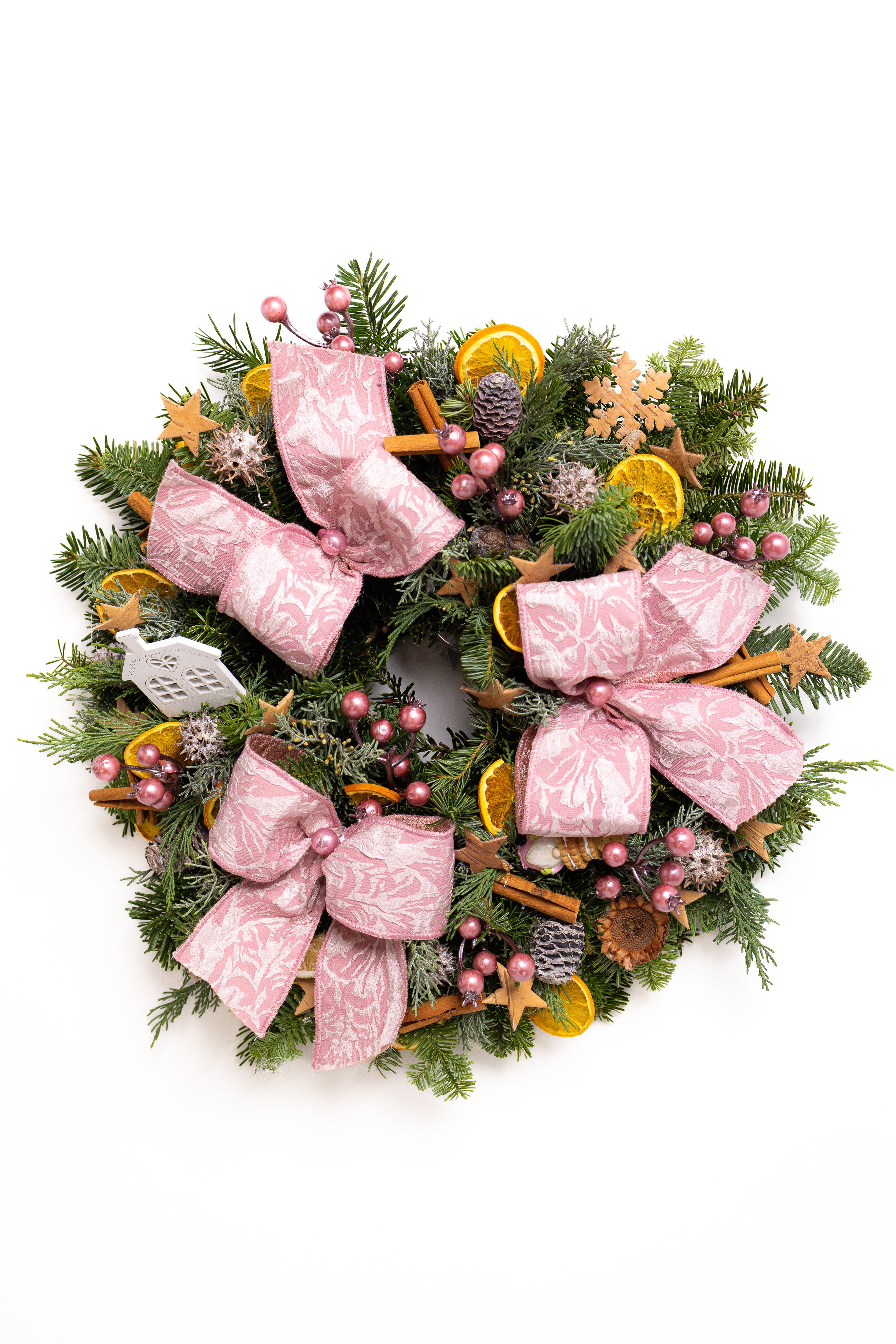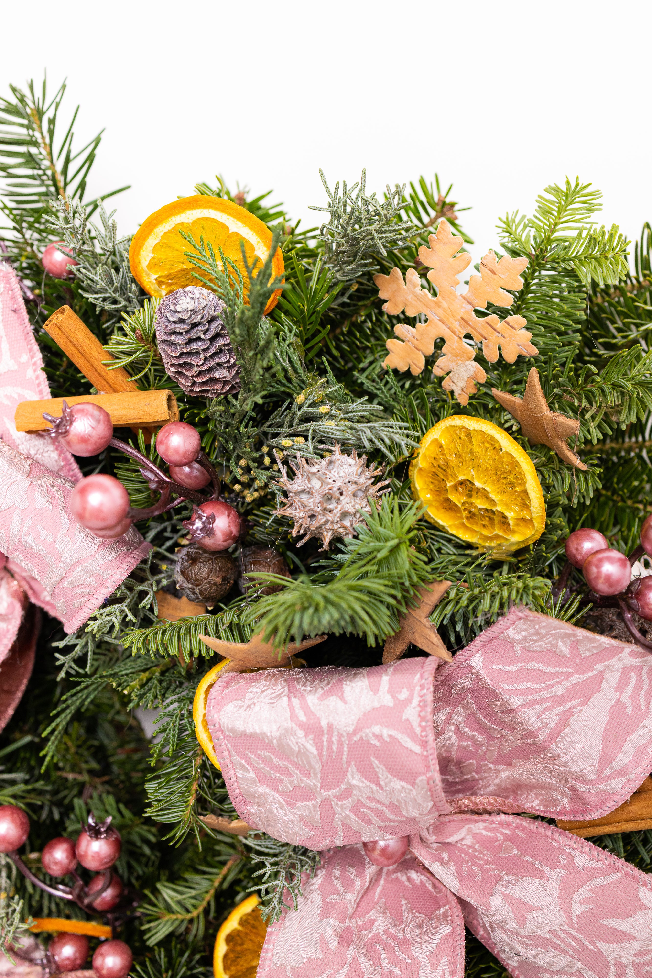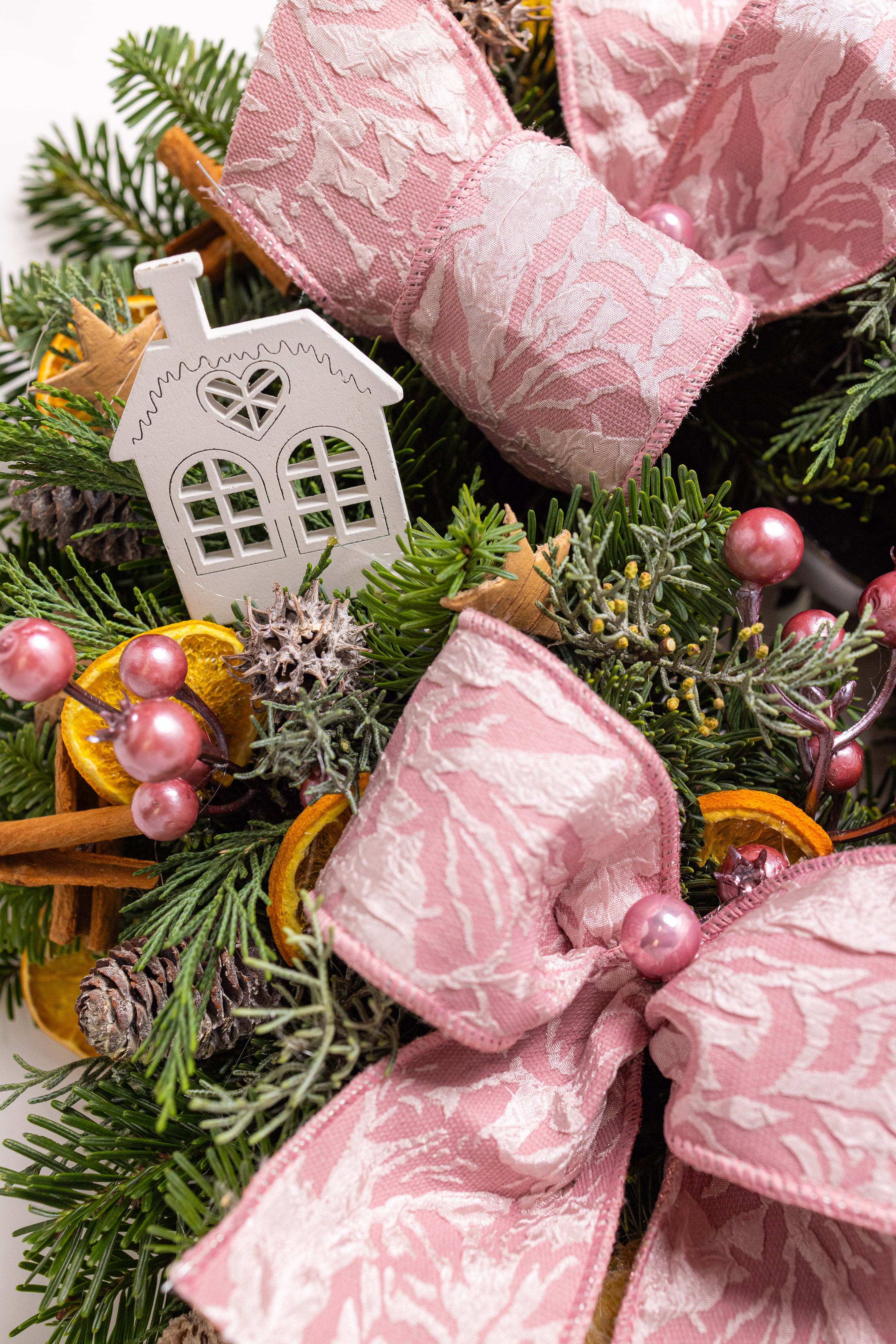 O coroniță plină de rafinament și delicatețe, lucrată manual dintr-un mix bogat de brad natural pentru un aspect luxuriant. Designul este pus în valoare de funde elegante roz cu model floral, căsuțe și steluțe din lemn, bobițe sidefate, scorțișoară și felii de portocală uscată.