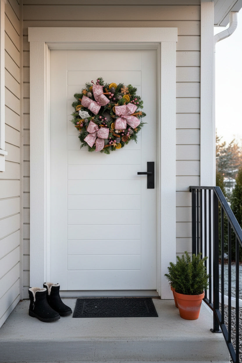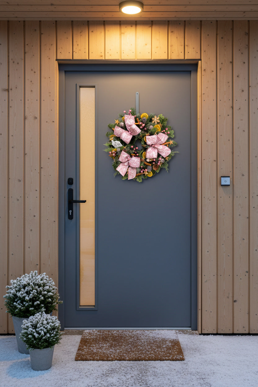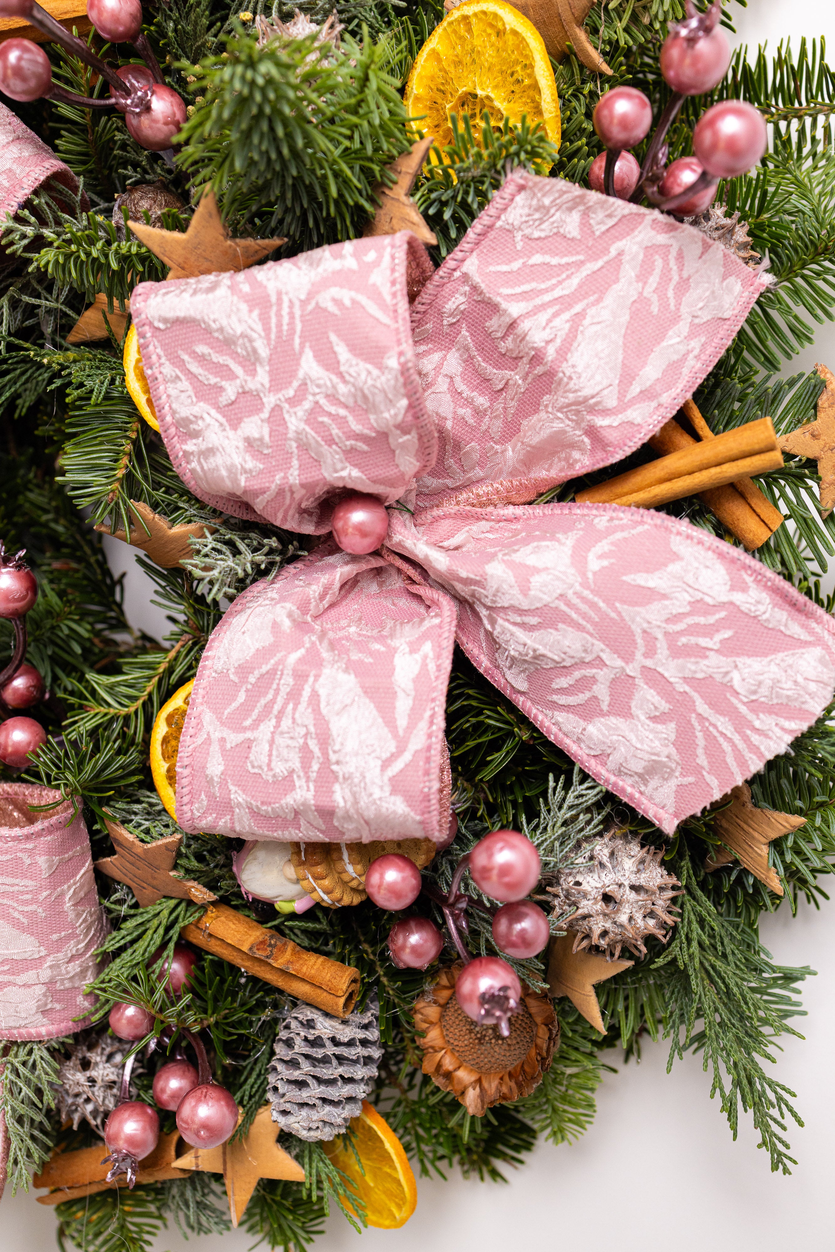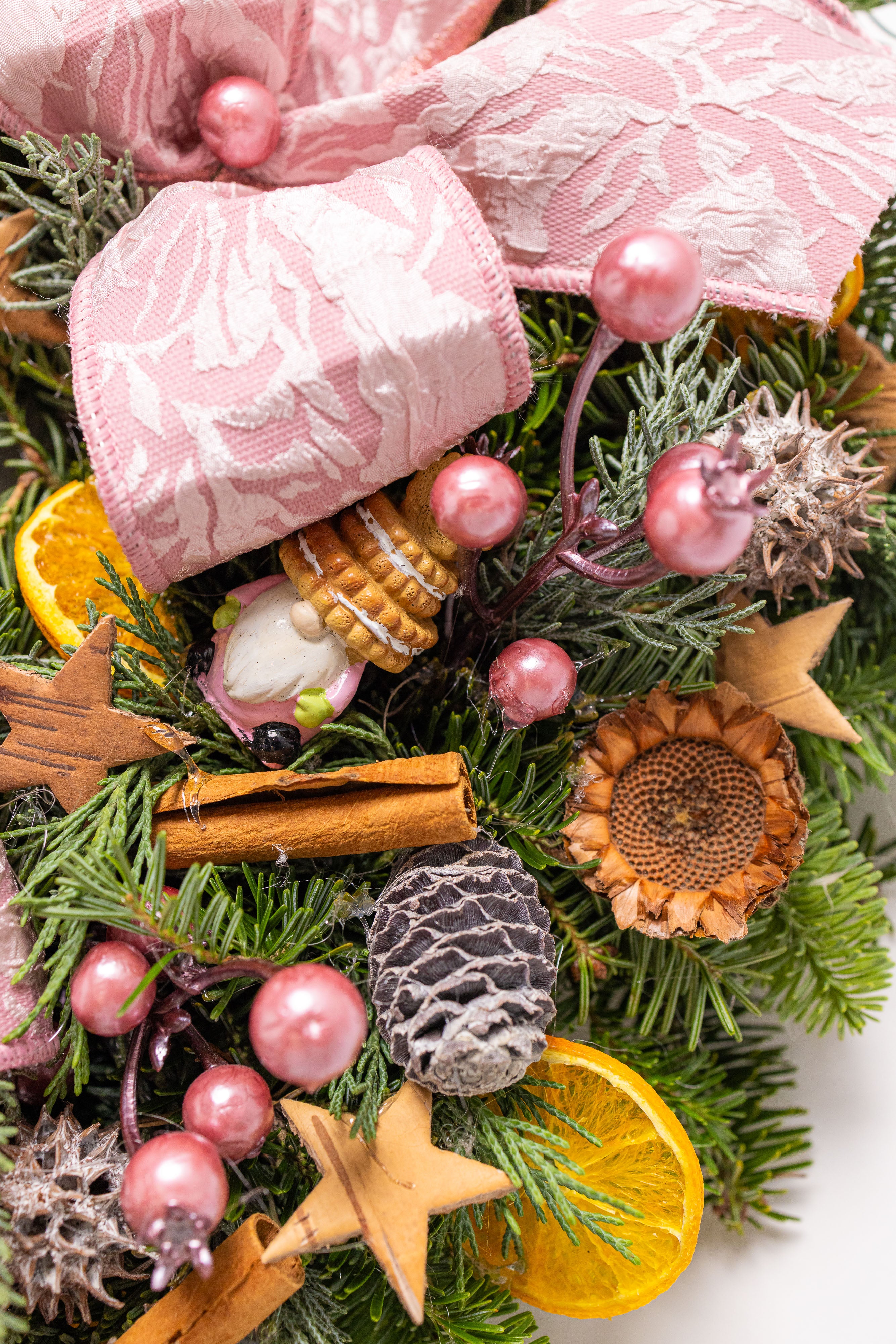 O coroniță plină de rafinament și delicatețe, lucrată manual dintr-un mix bogat de brad natural pentru un aspect luxuriant. Designul este pus în valoare de funde elegante roz cu model floral, căsuțe și steluțe din lemn, bobițe sidefate, scorțișoară și felii de portocală uscată.