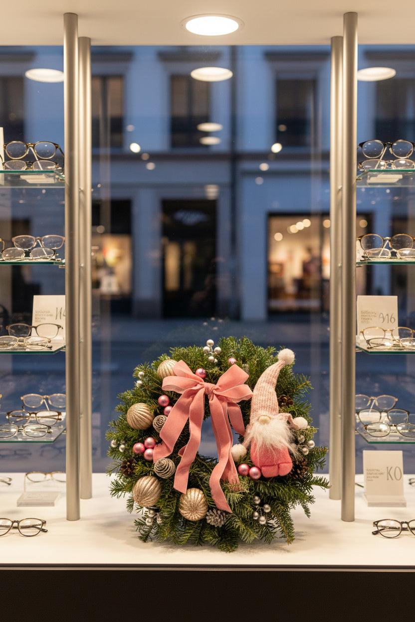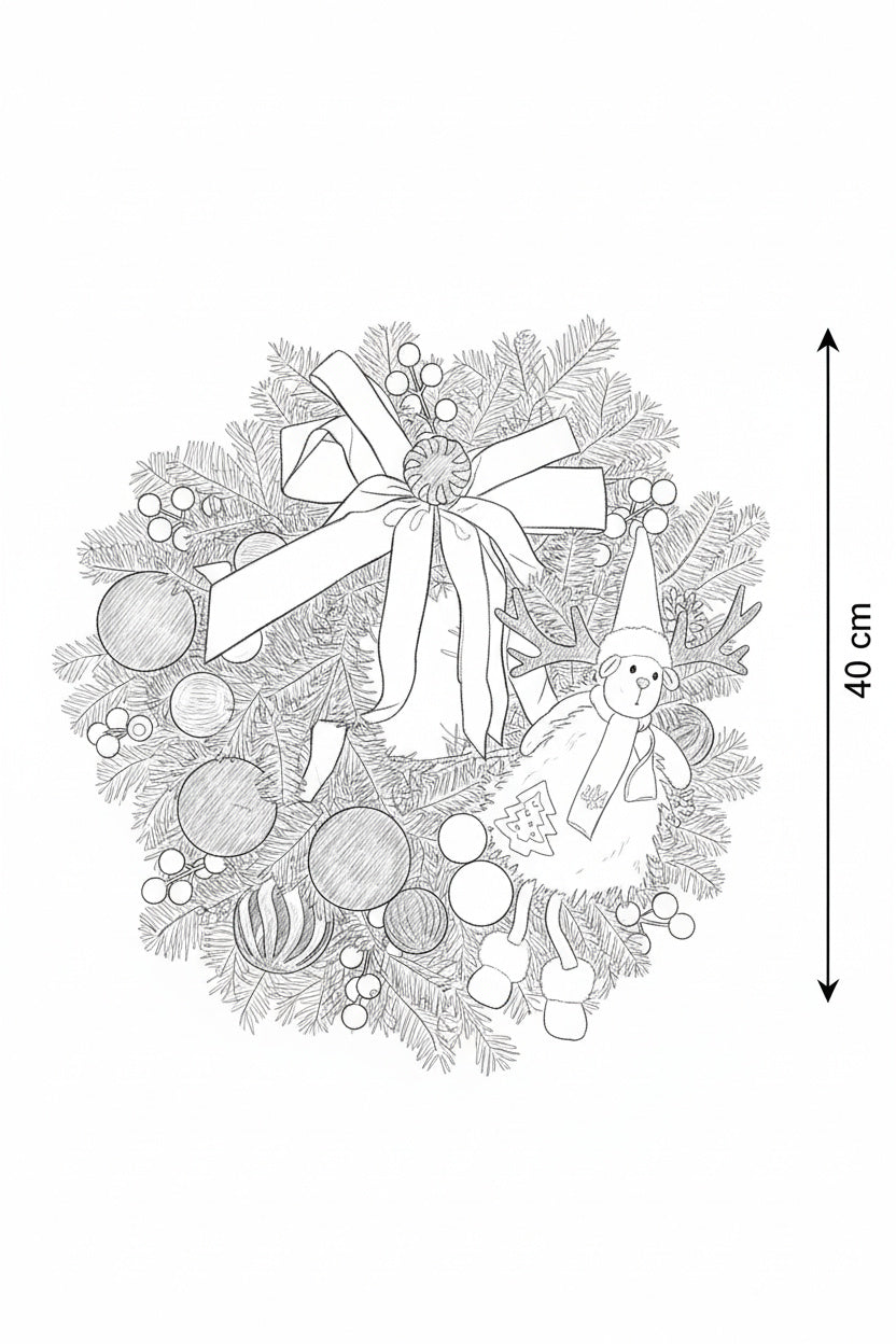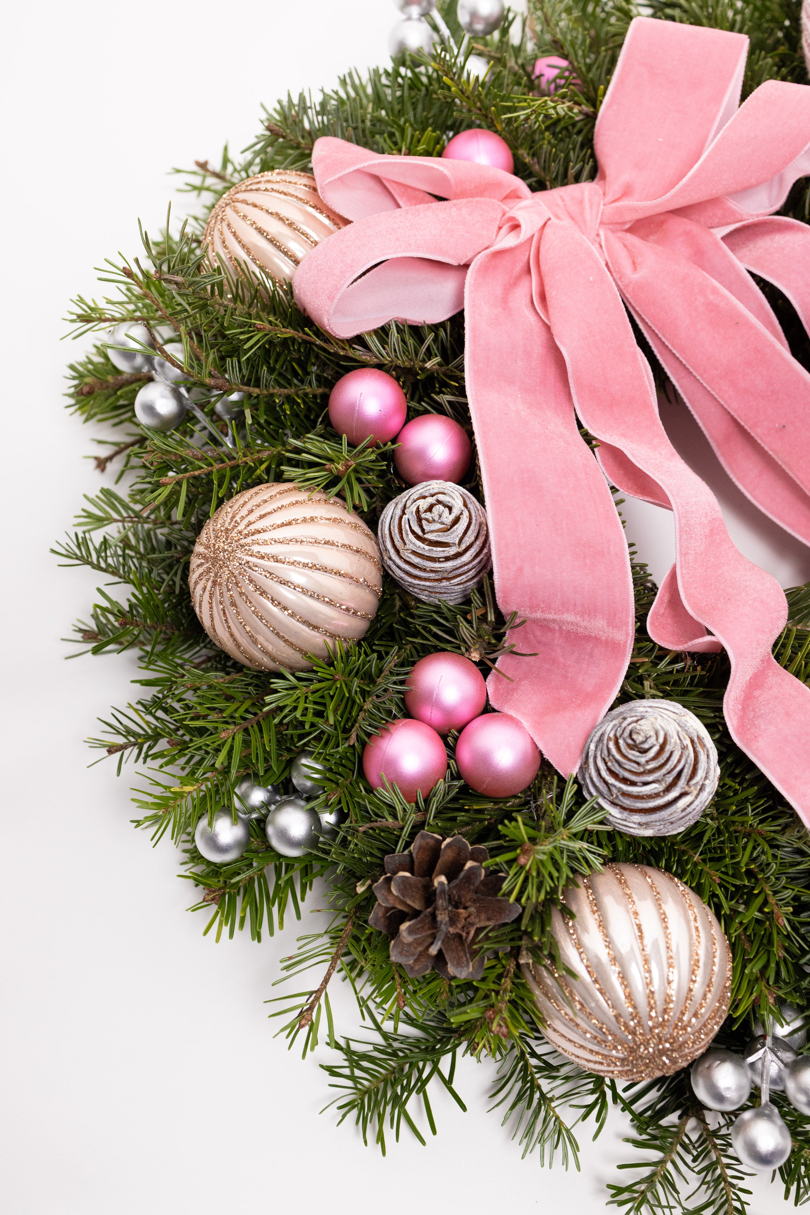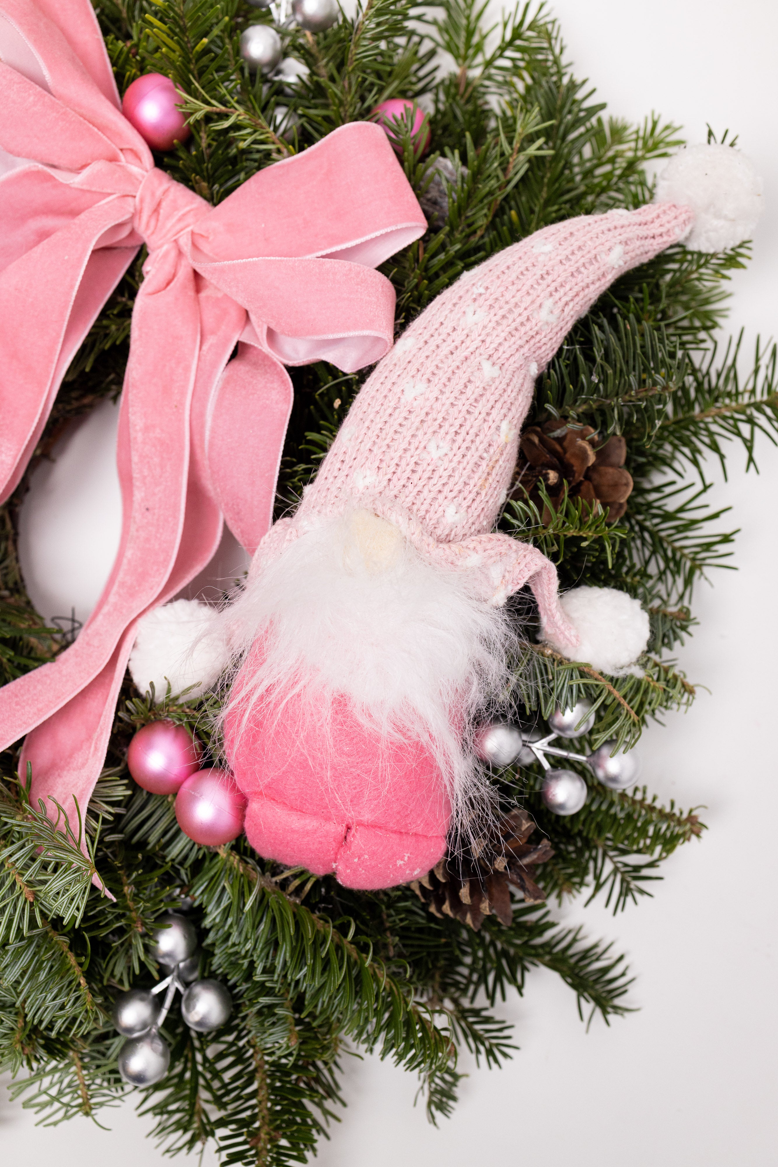 O decorațiune plină de farmec, lucrată manual pe o bază bogată de brad natural Nobilis, renumit pentru prospețimea și parfumul său. Aranjamentul include un gnom roz central, o fundă elegantă din catifea roz pudră, globuri sidefate cu linii aurii și accente argintii sclipitoare. Un decor de lux, cald și vesel.