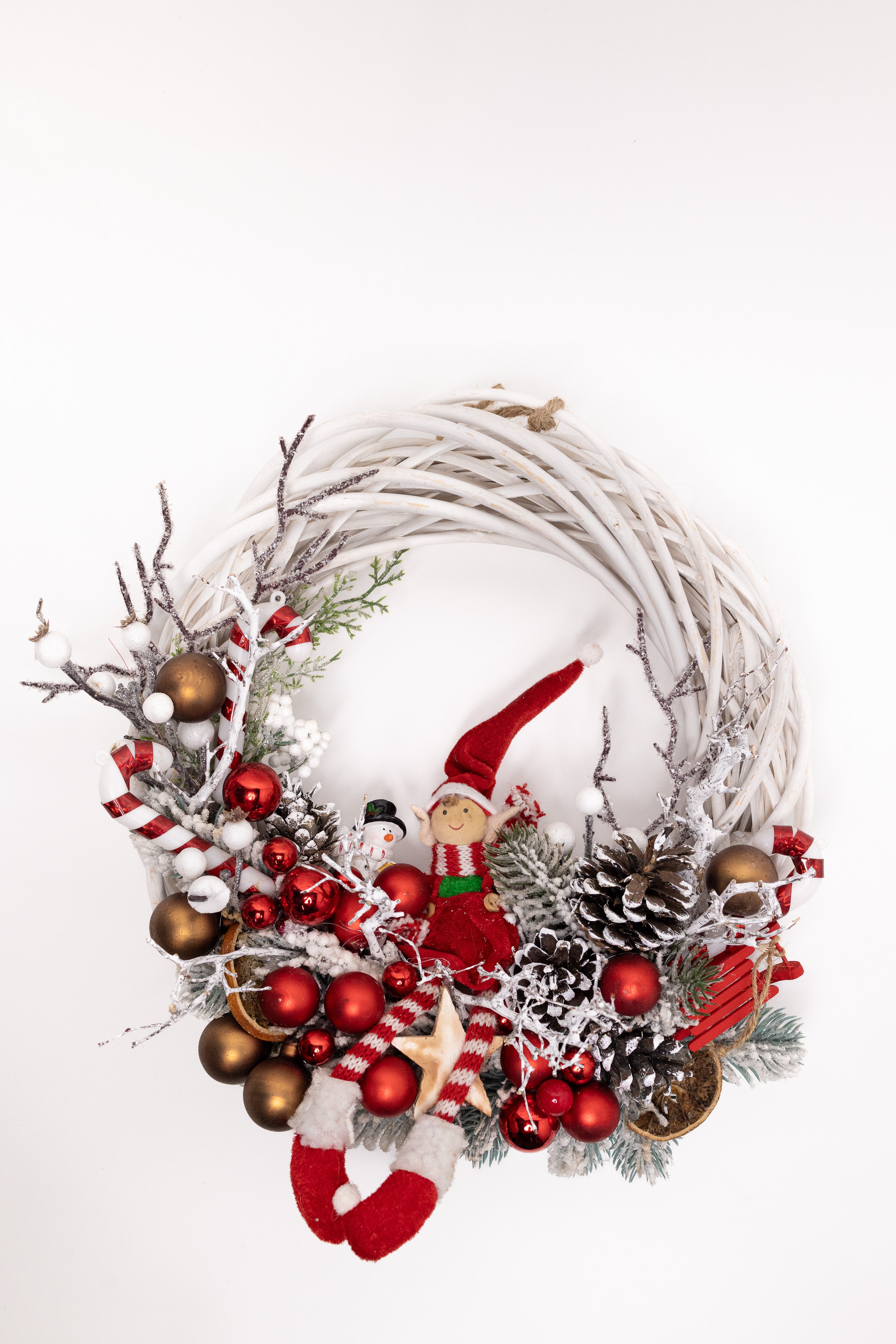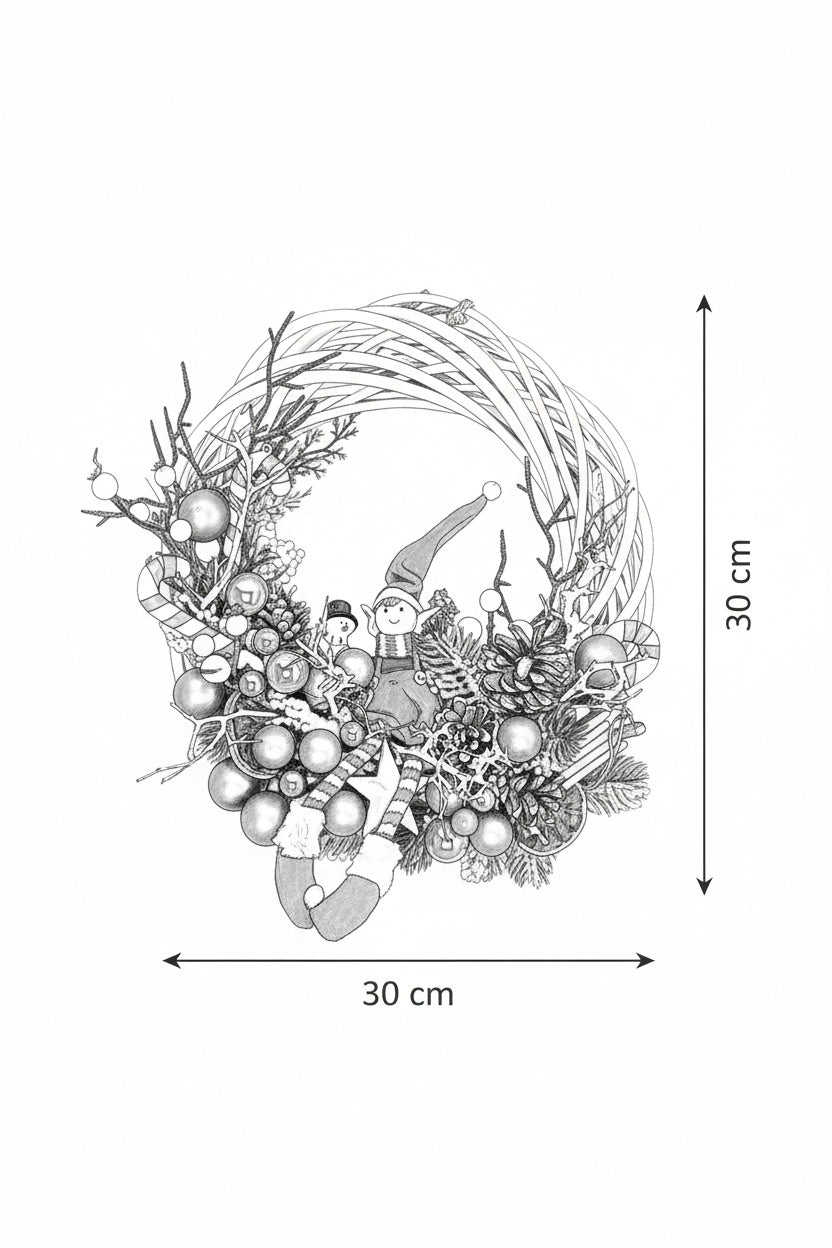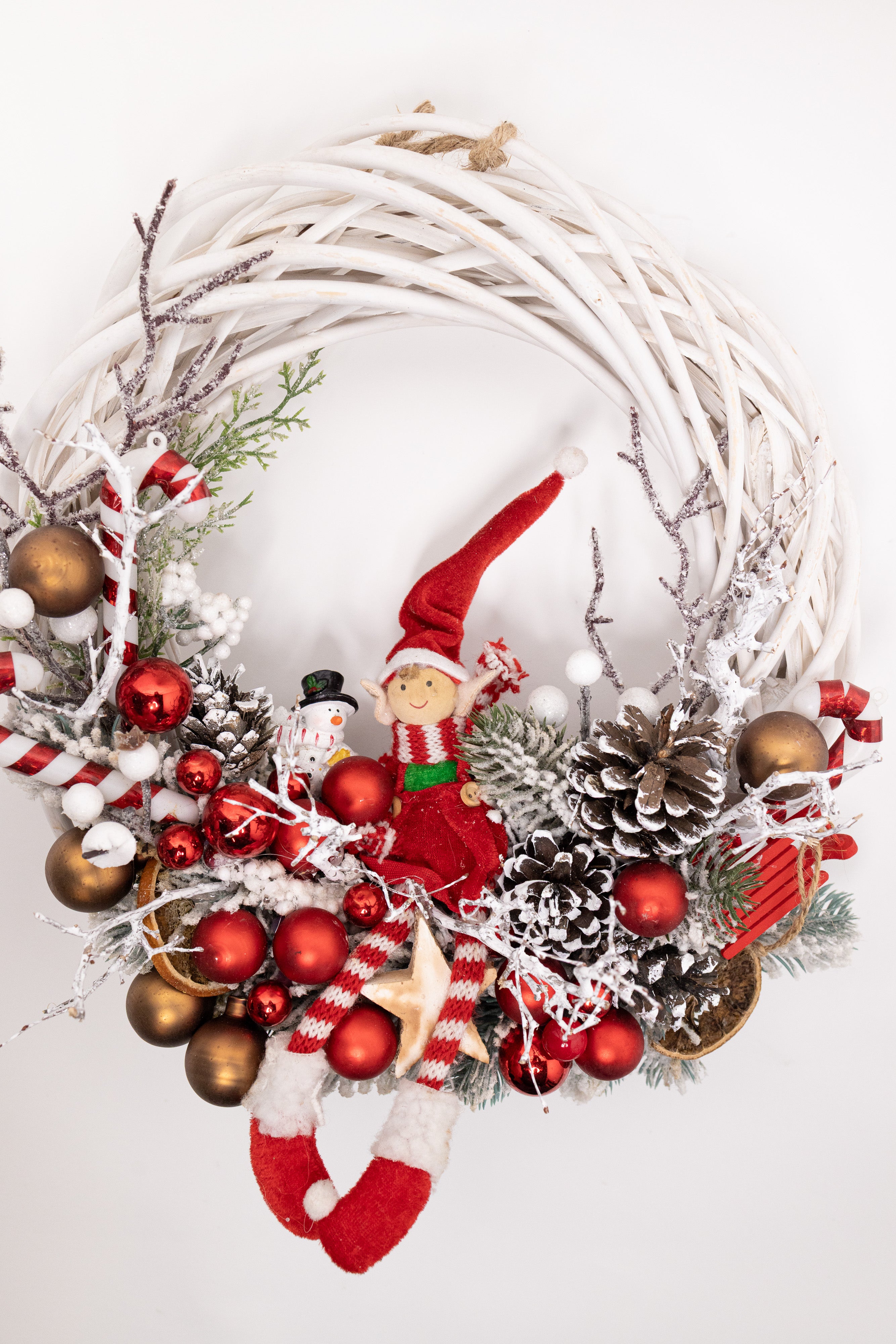 O decorațiune plină de personalitate, lucrată manual pe o structură circulară din lemn natural împletit, de culoare albă. Aranjamentul central include un elf vesel cu picioare lungi, acadele festive, globuri roșii și bronz, felii de portocală uscată și o varietate de conuri naturale ninese.