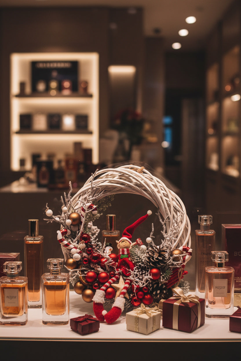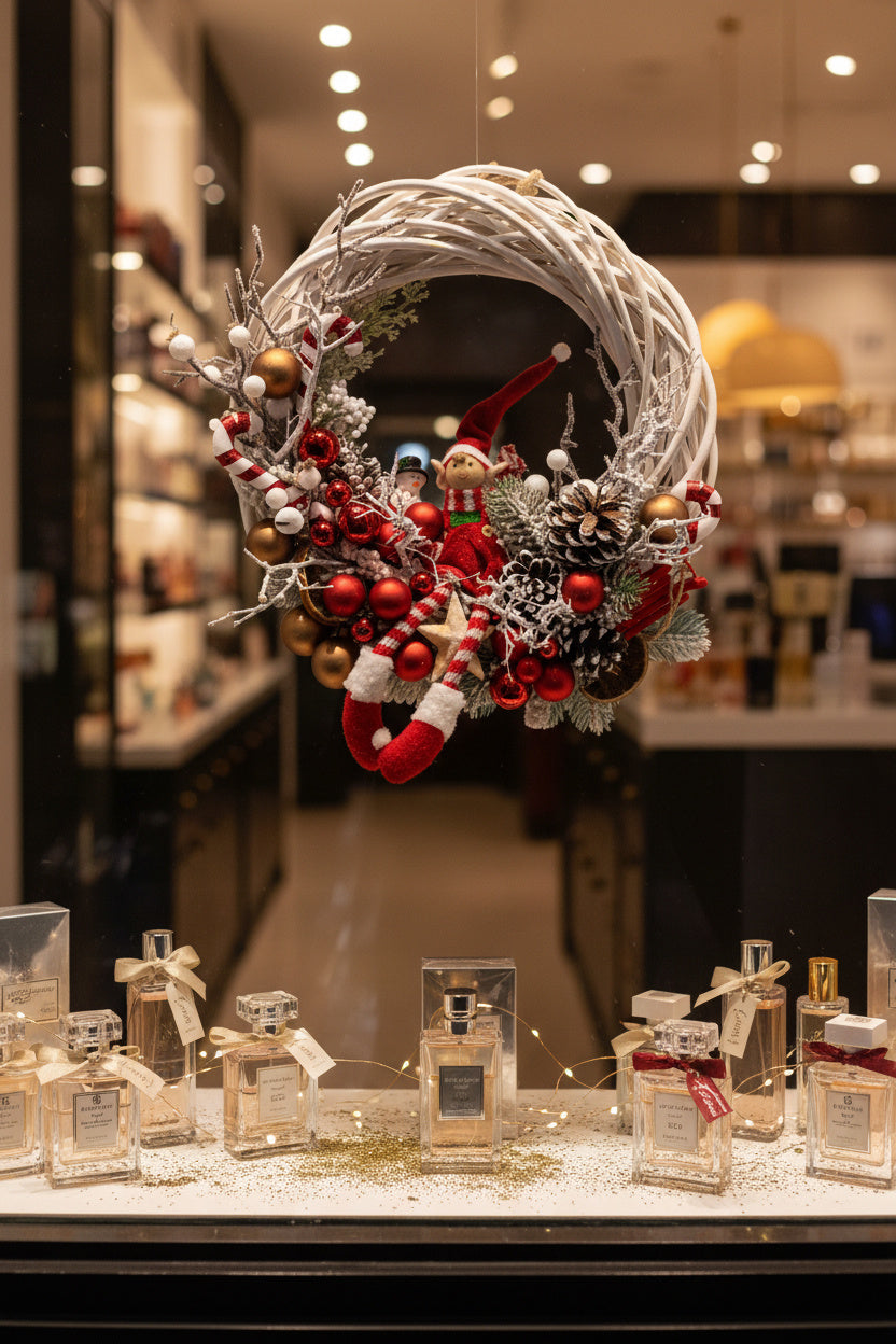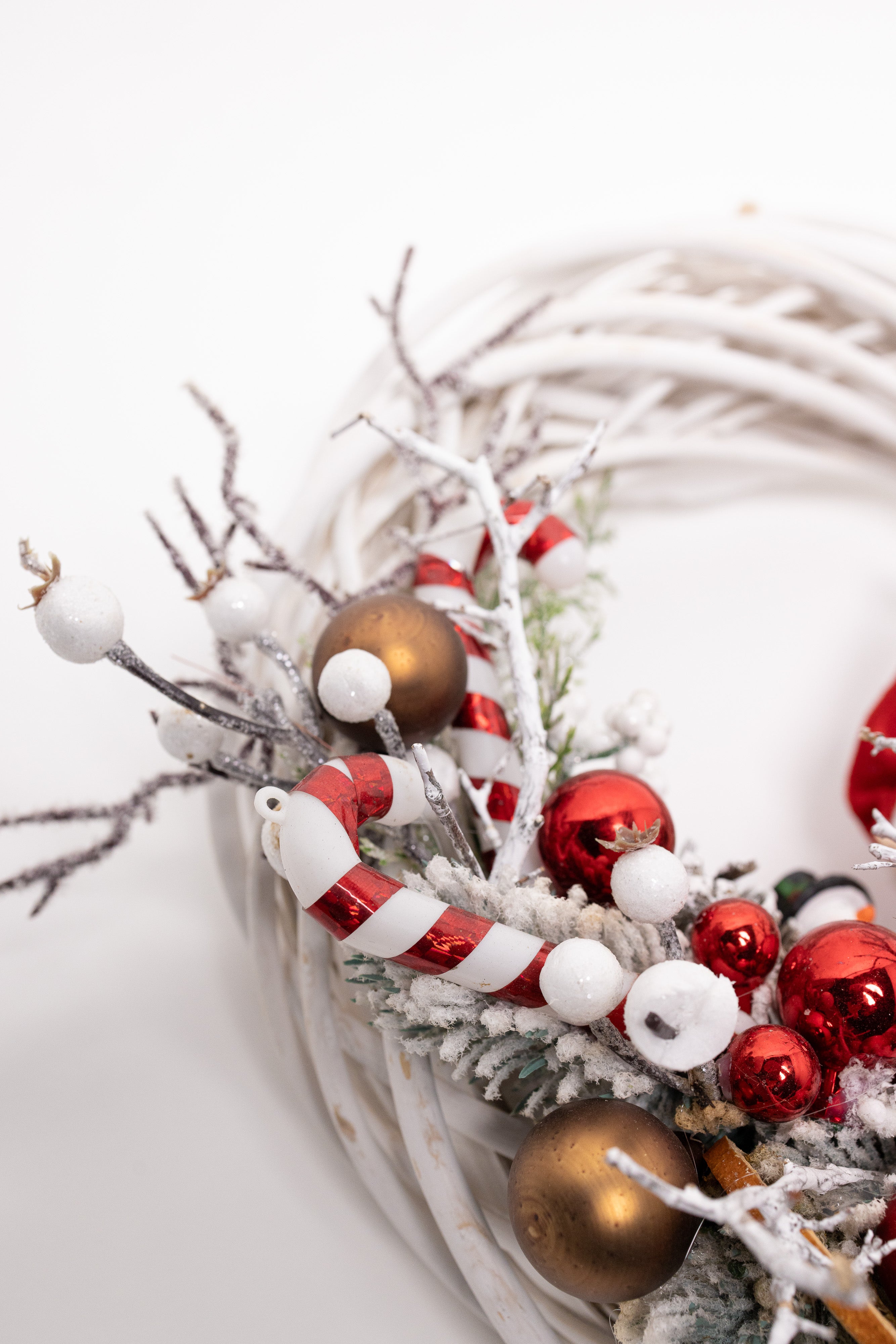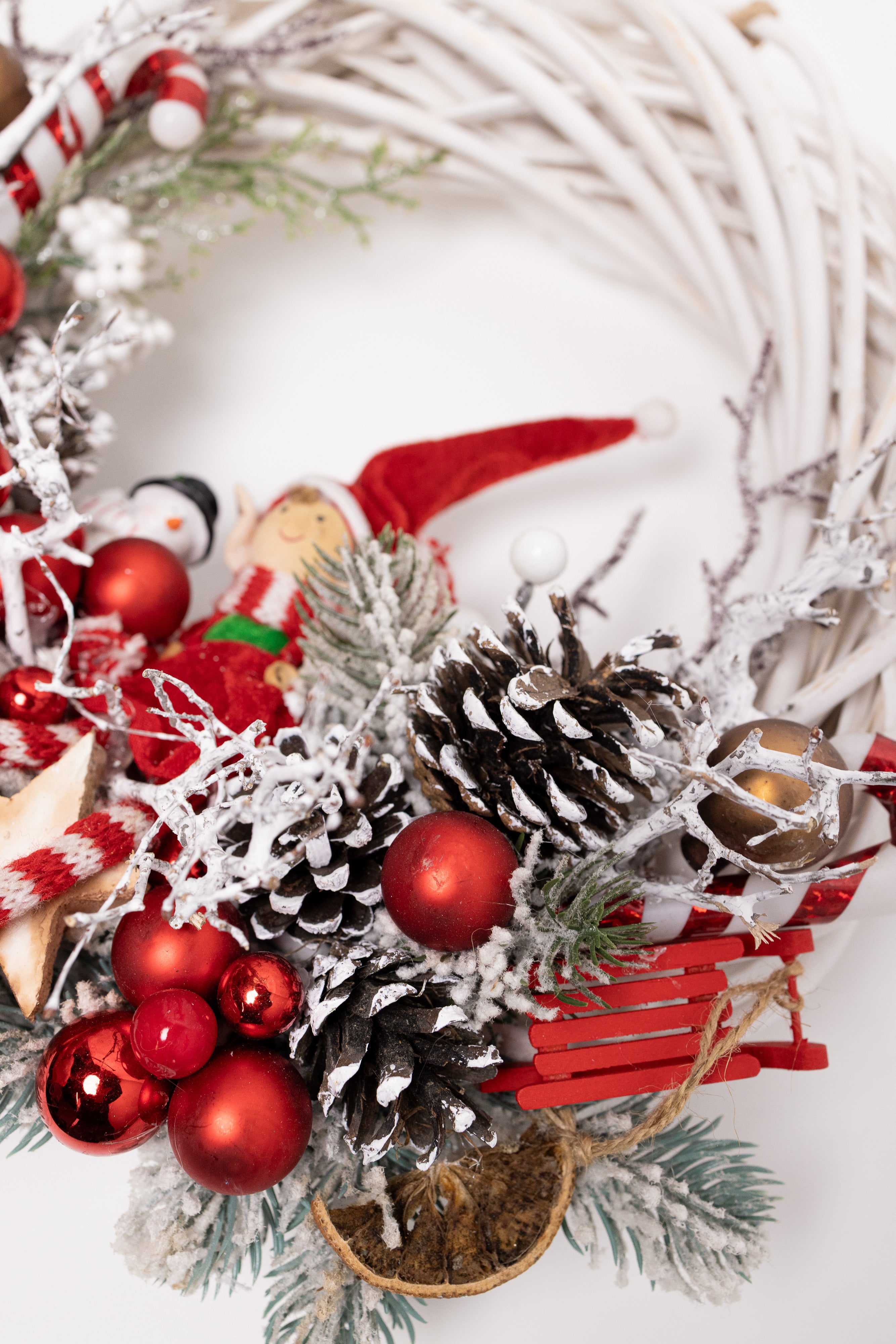 O decorațiune plină de personalitate, lucrată manual pe o structură circulară din lemn natural împletit, de culoare albă. Aranjamentul central include un elf vesel cu picioare lungi, acadele festive, globuri roșii și bronz, felii de portocală uscată și o varietate de conuri naturale ninese.