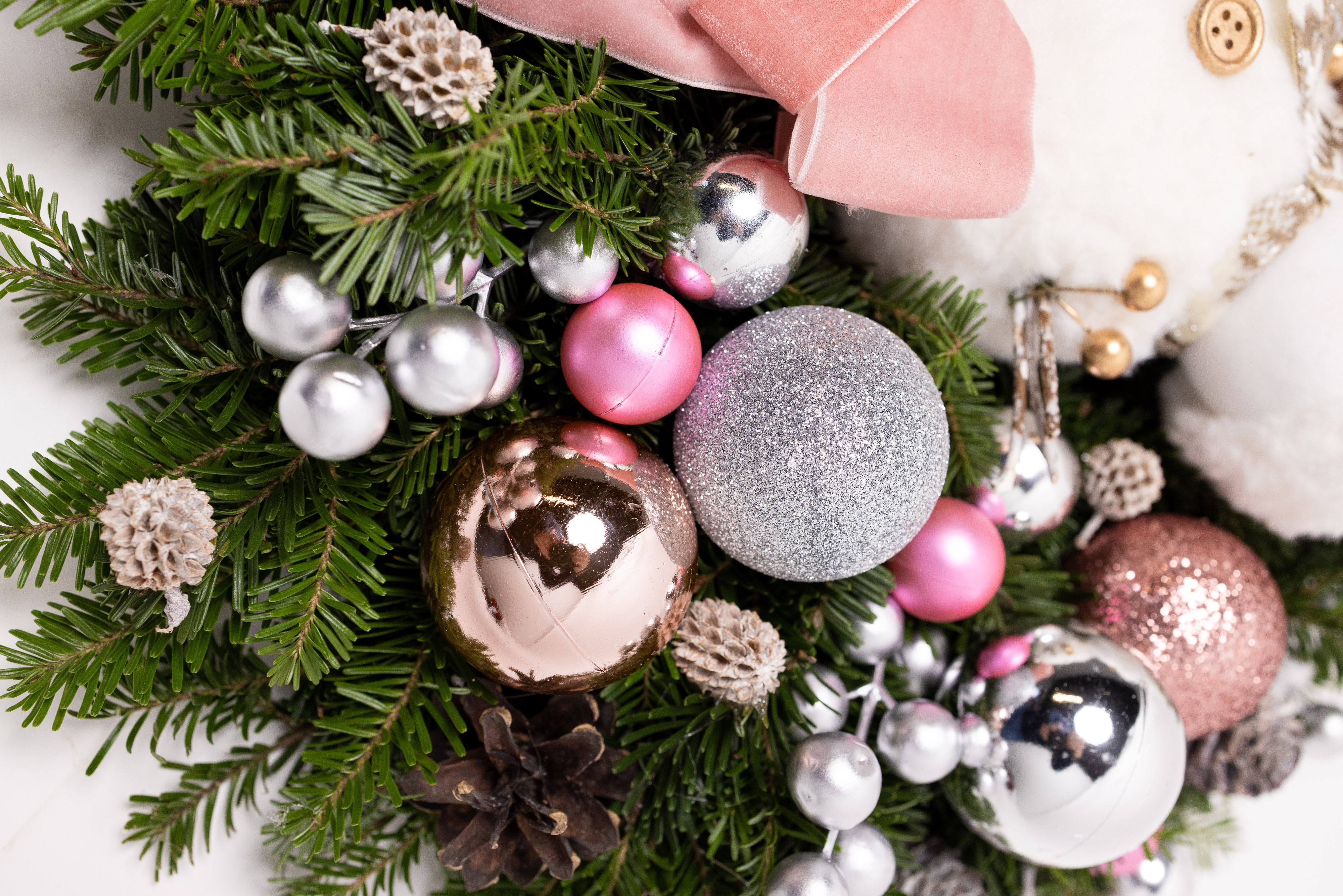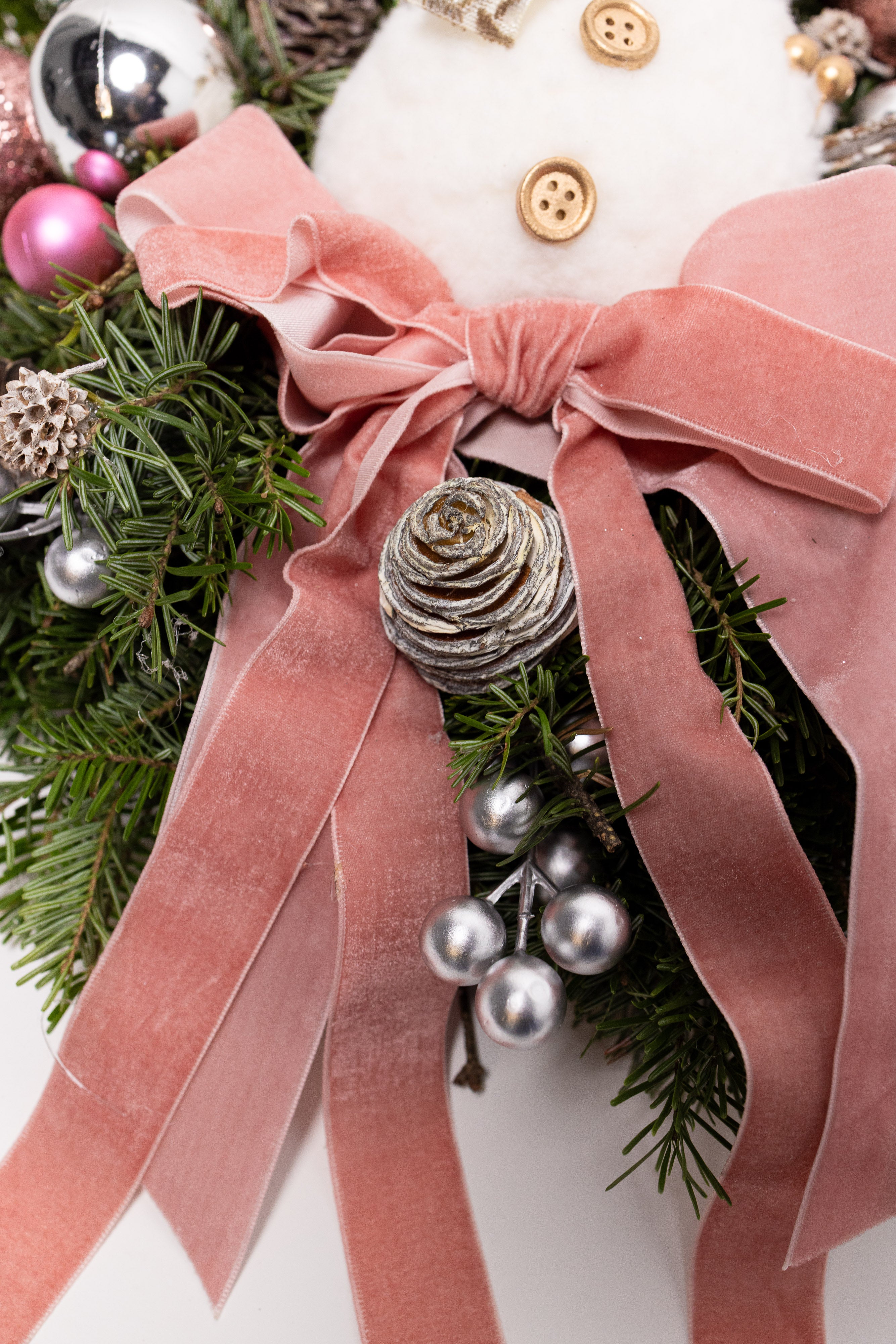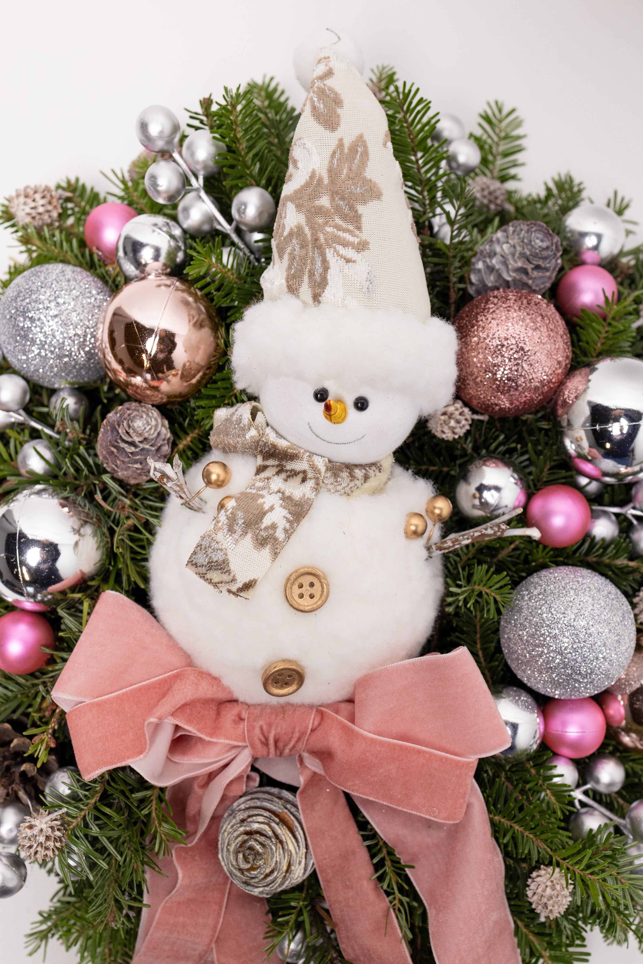 O creație spectaculoasă lucrată manual pe o bază bogată de brad natural Nobilis, apreciat pentru rezistența acelor și parfumul proaspăt. Aranjamentul central include un om de zăpadă elegant, globuri în nuanțe rafinate de rose-gold, argintiu și roz, alături de o fundă dublă din catifea roz pudră.