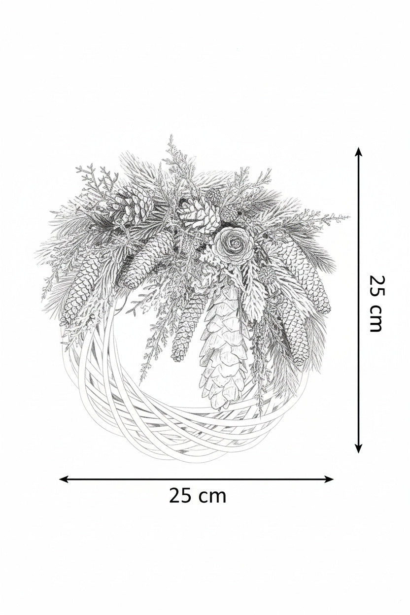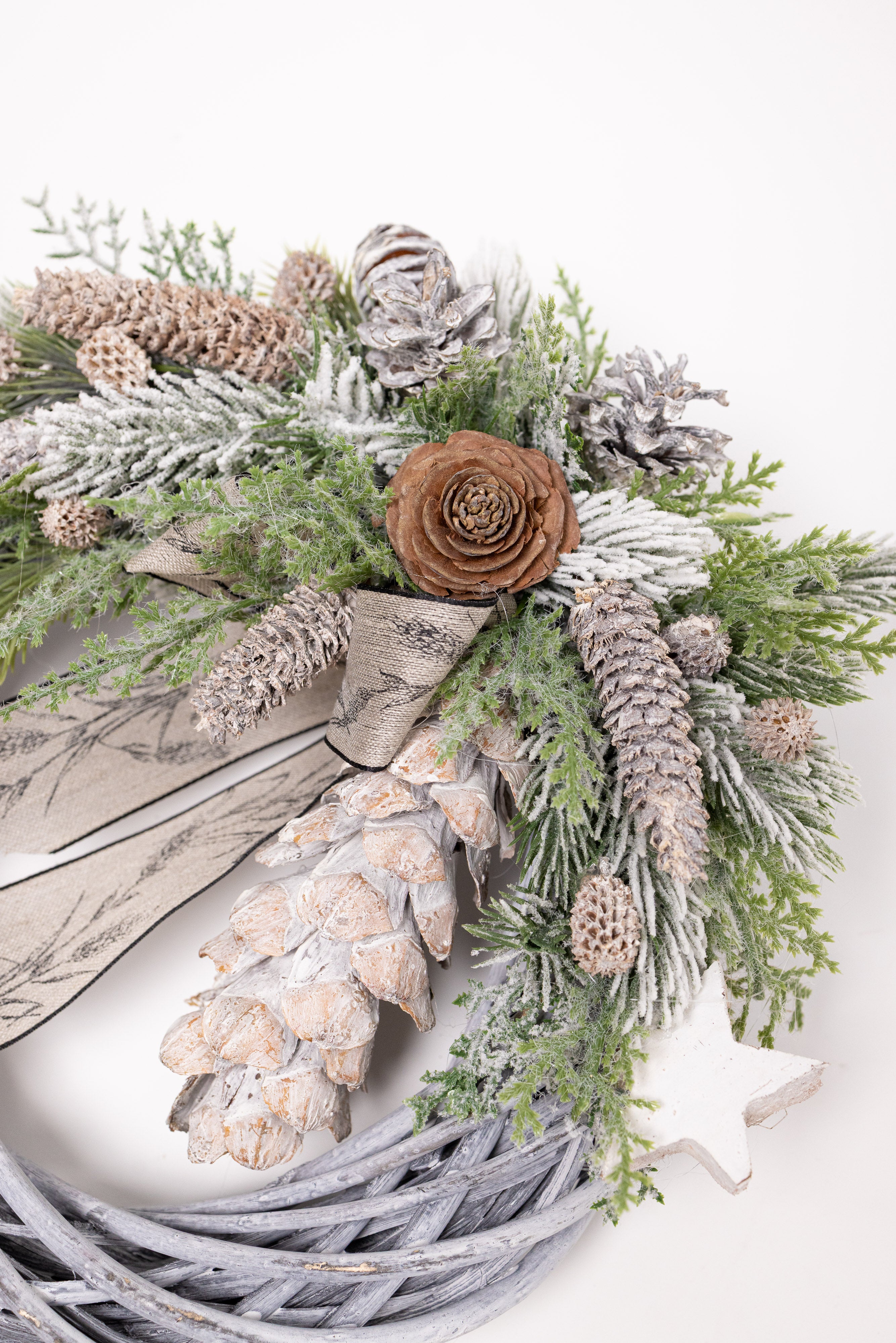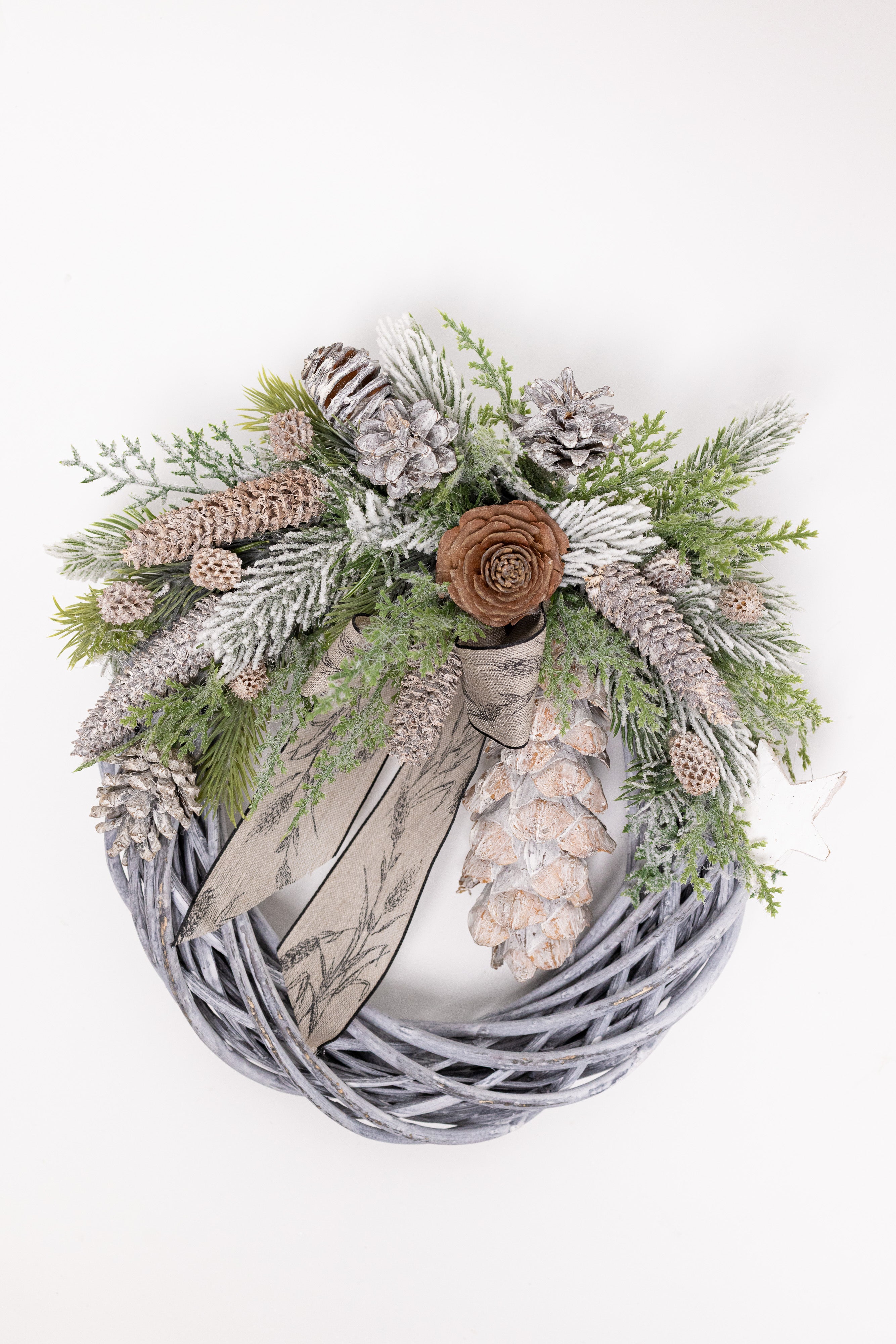 O decorațiune sofisticată cu design natural, lucrată manual pe o structură din lemn împletit de culoare gri-lavandă. Aranjamentul combină brad artificial premium 4D nins cu o fundă textilă elegantă, conuri de brad naturale diversificate și ramuri de tuia, creând un aspect rustic de lux.