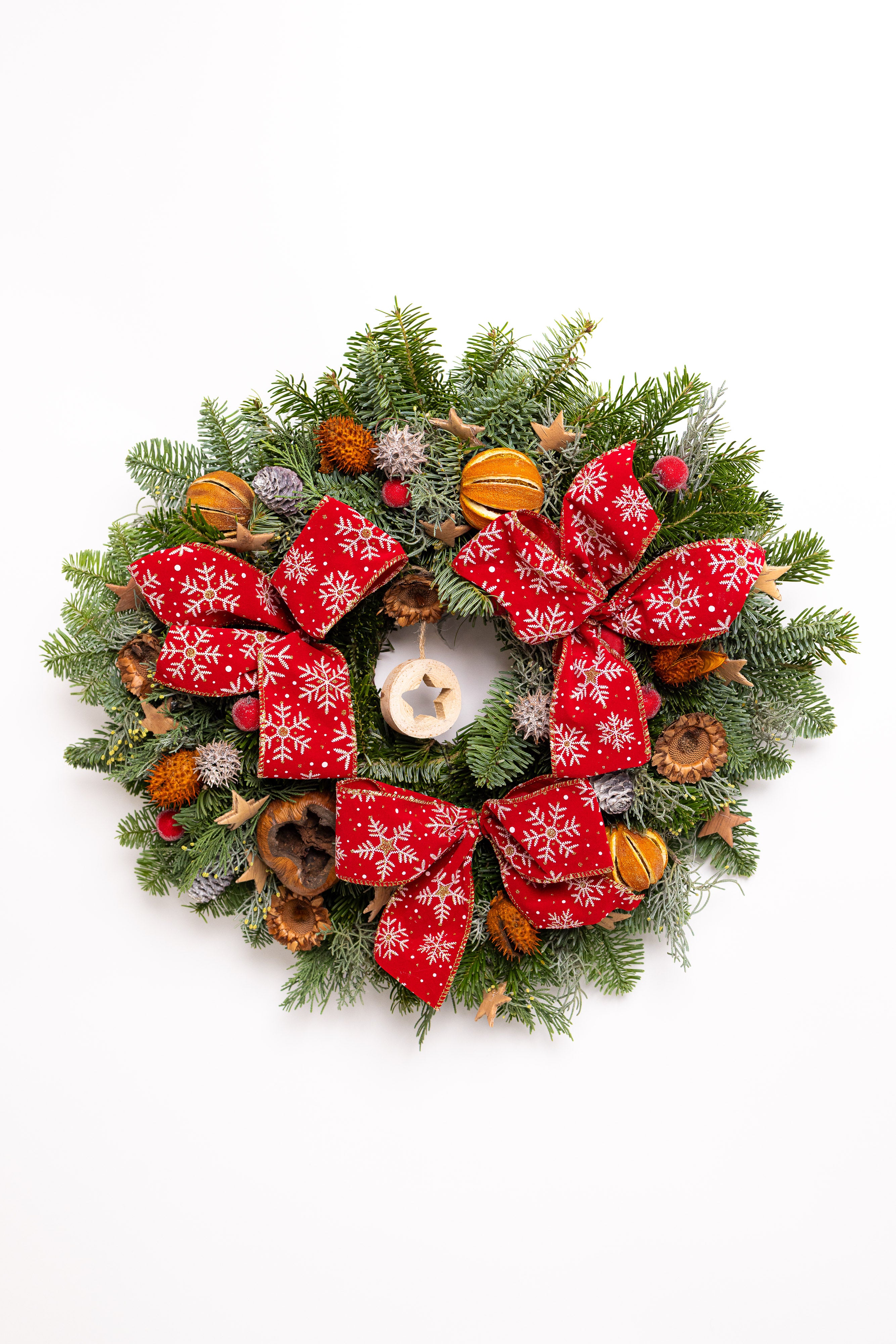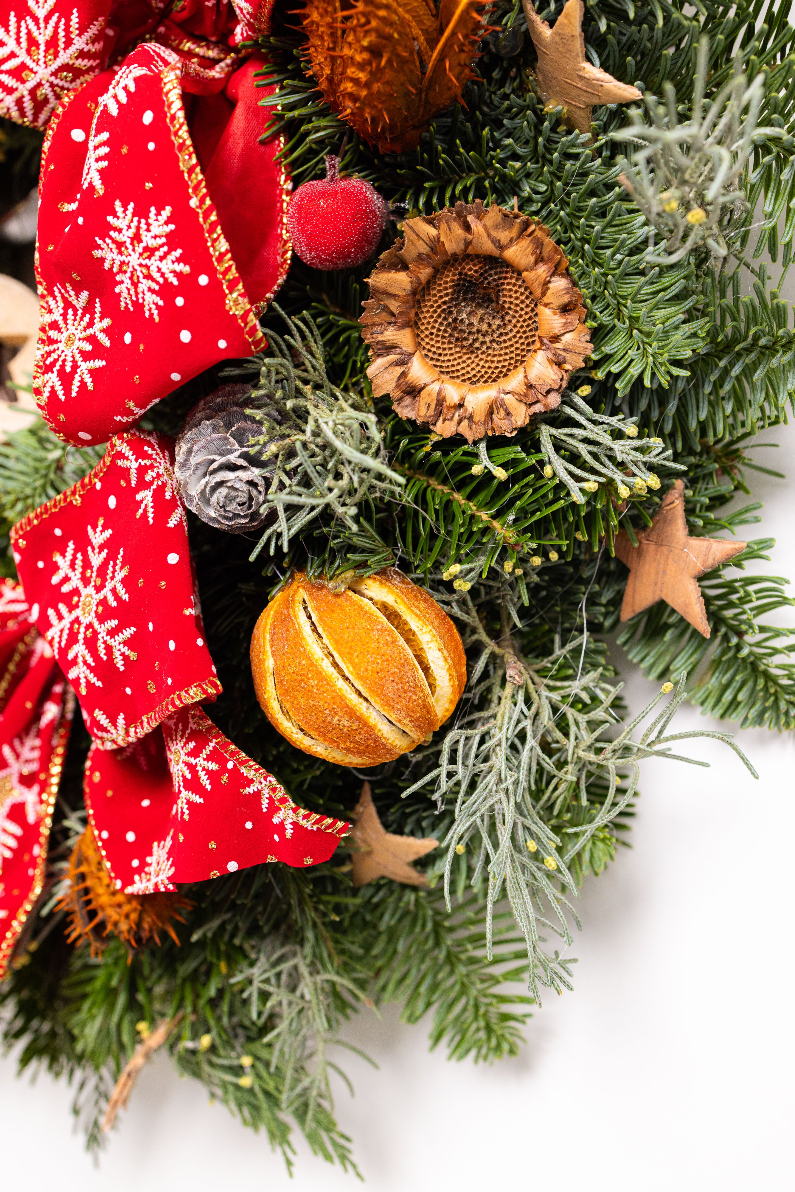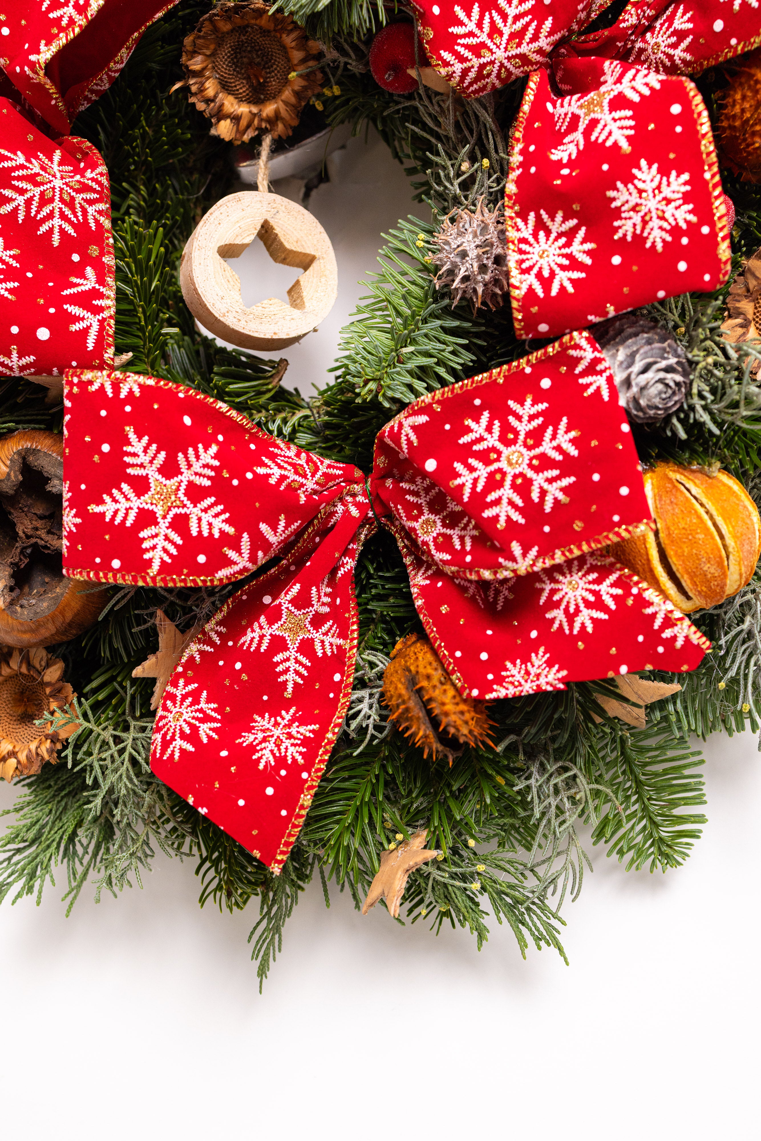 O coroniță exuberantă și festivă, lucrată manual pe o bază densă de brad natural Nobilis proaspăt. Aranjamentul este dominat de trei funde mari roșii cu fulgi de zăpadă albi, fiind completat de o stea centrală din lemn, citrice uscate, conuri și elemente botanice argintii.
