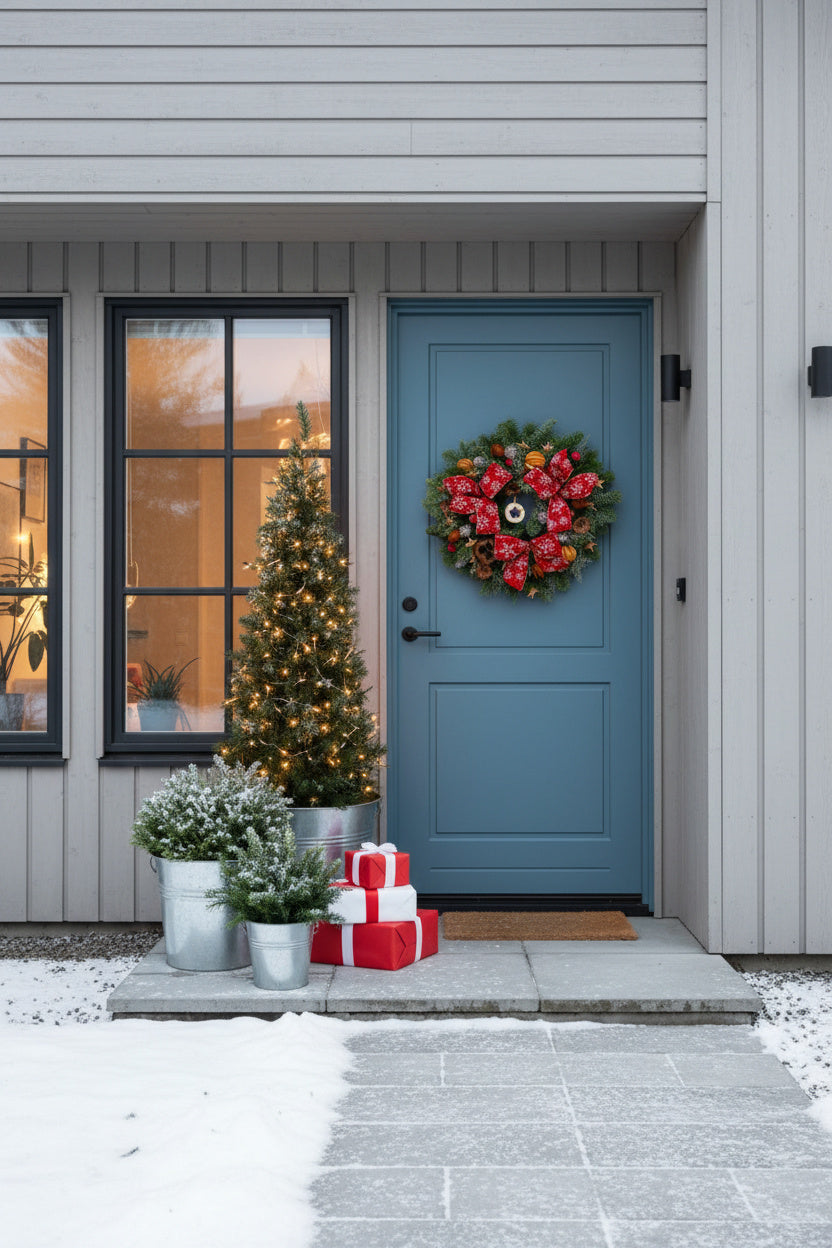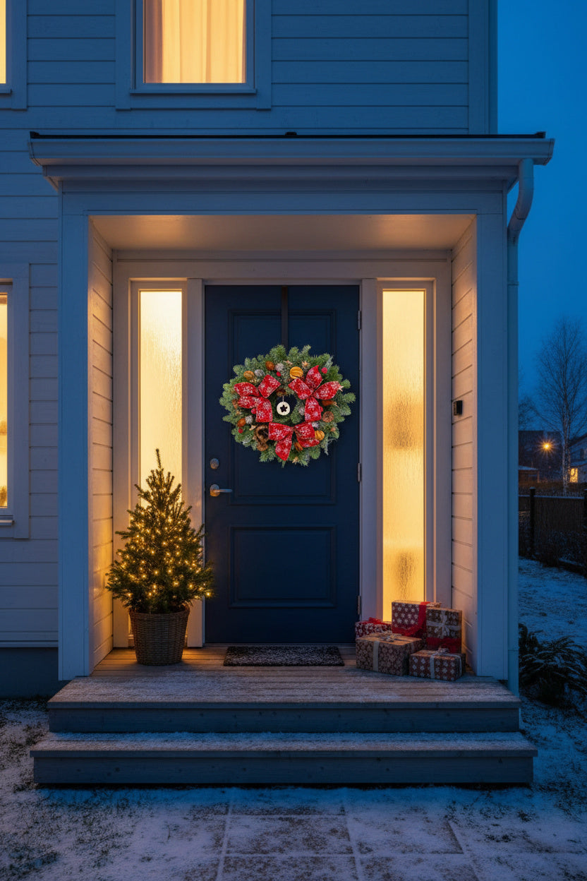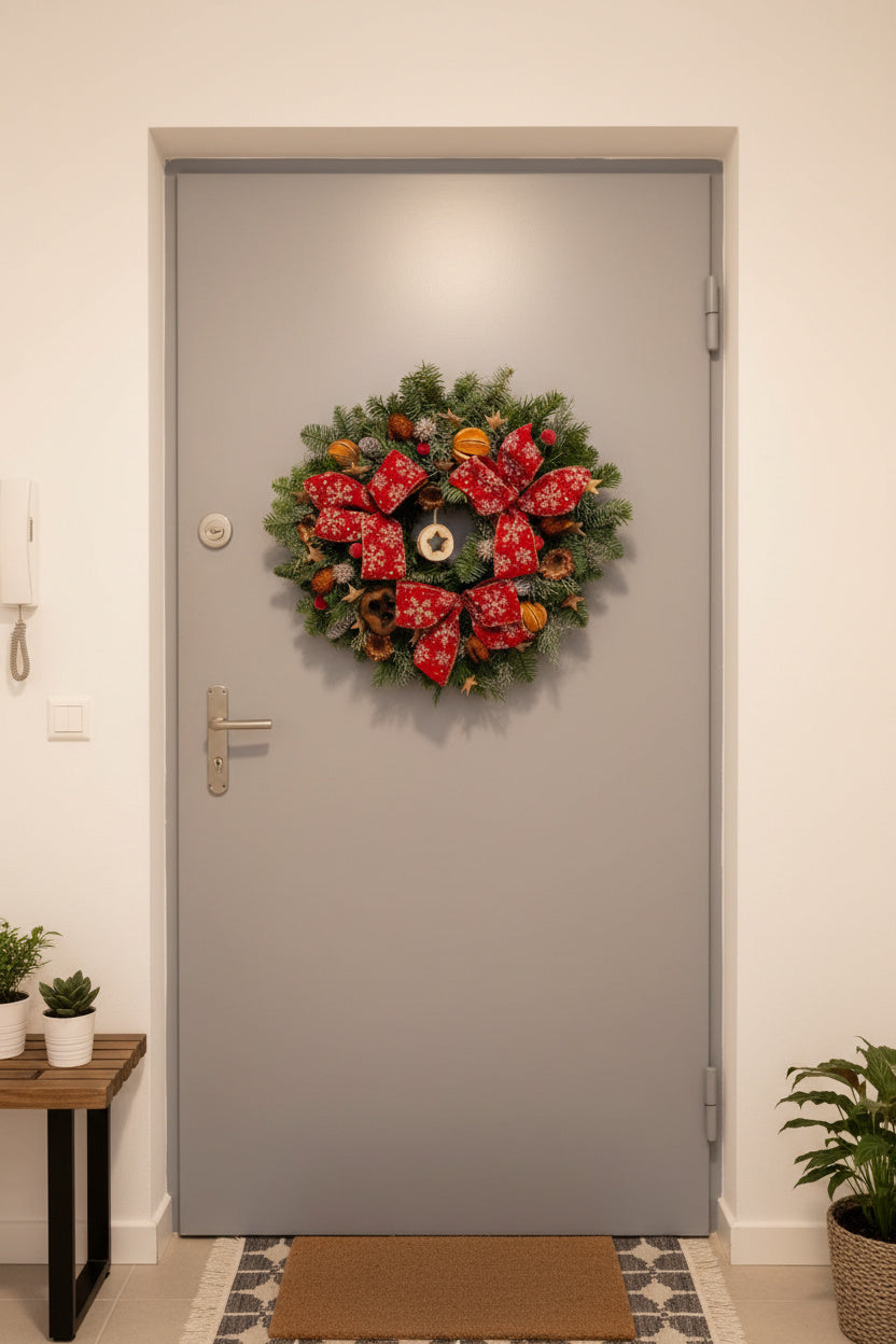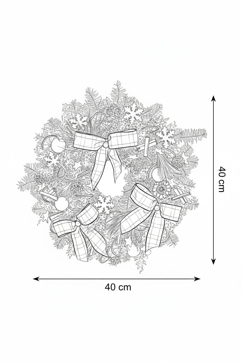 O coroniță exuberantă și festivă, lucrată manual pe o bază densă de brad natural Nobilis proaspăt. Aranjamentul este dominat de trei funde mari roșii cu fulgi de zăpadă albi, fiind completat de o stea centrală din lemn, citrice uscate, conuri și elemente botanice argintii.