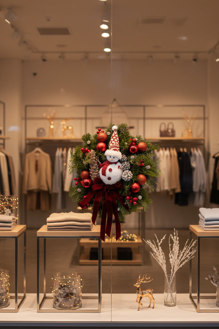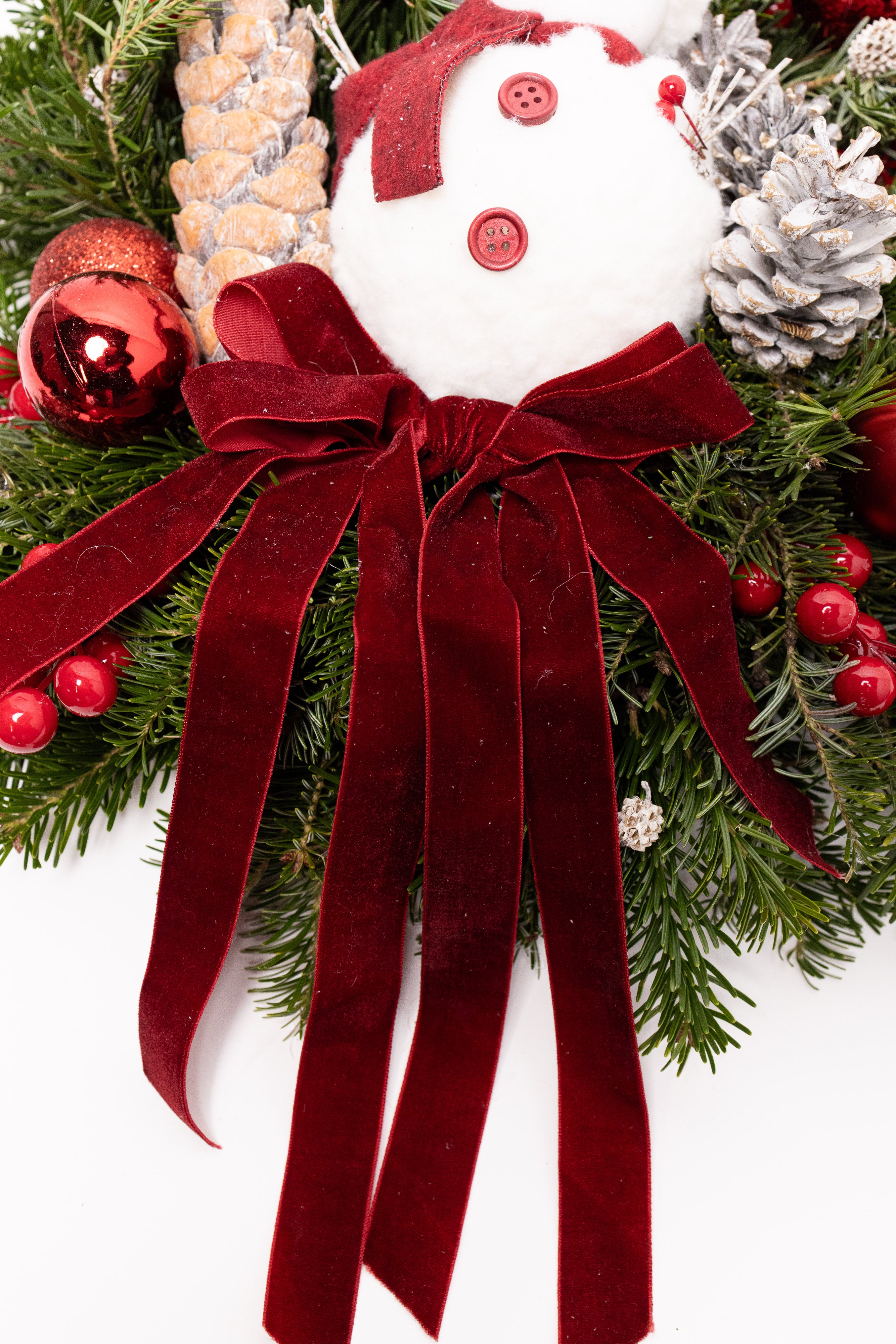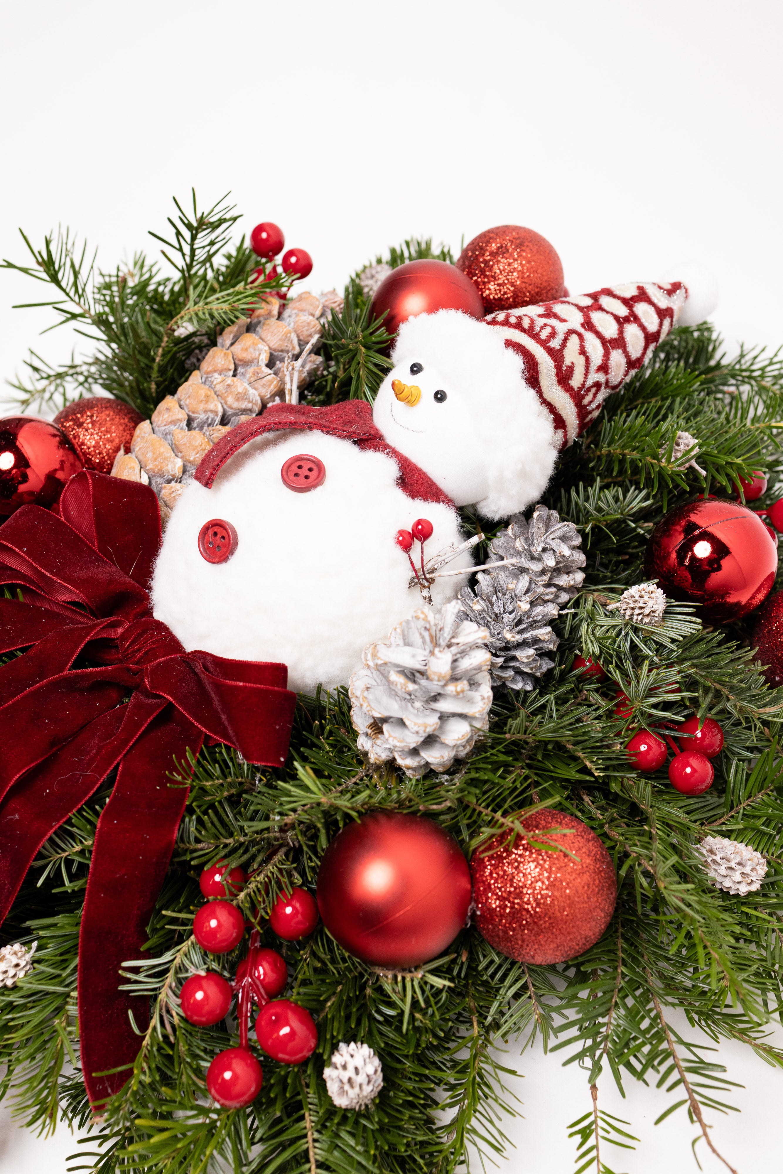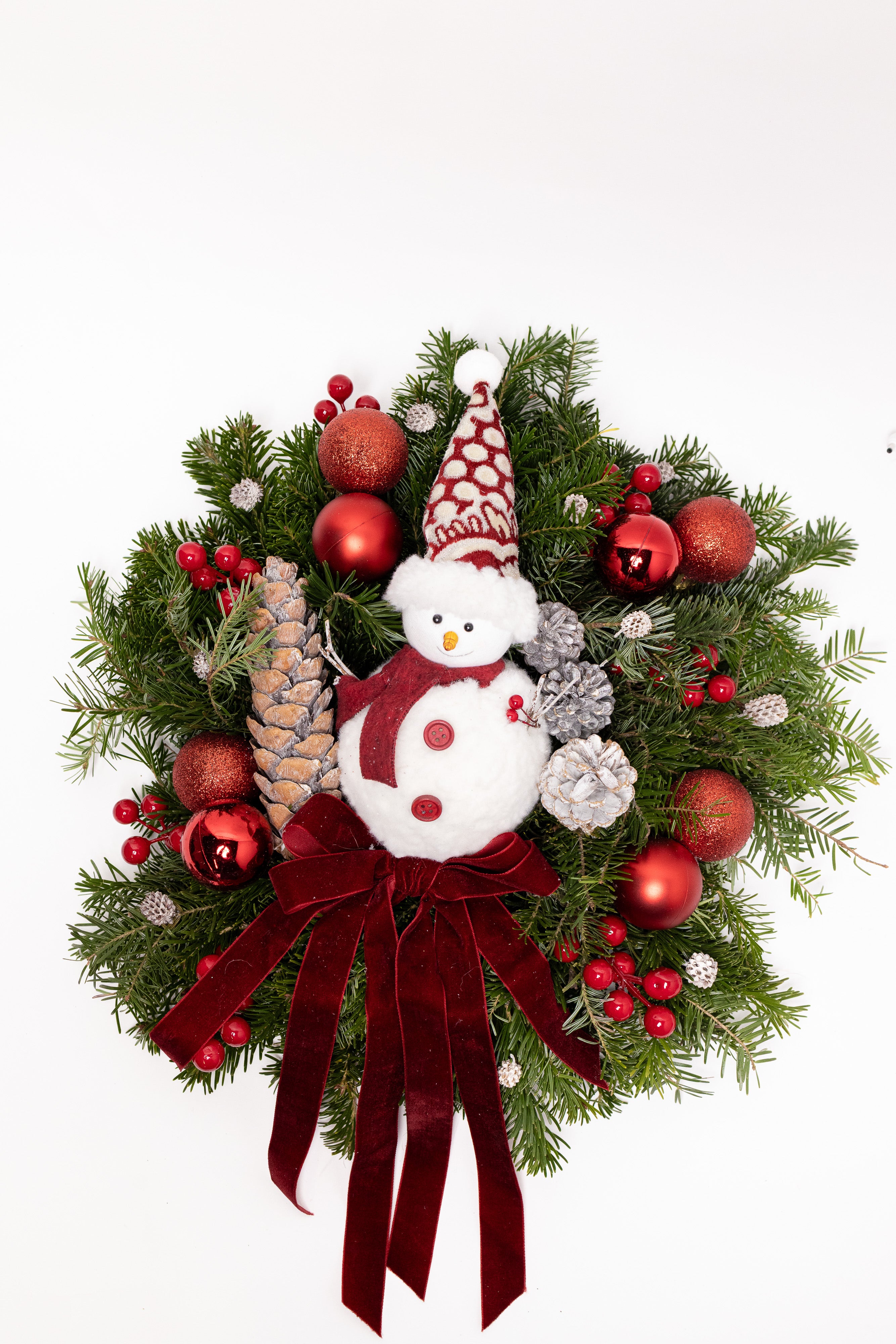 O decorațiune clasică și vibrantă, lucrată manual pe o bază bogată din brad natural Nobilis proaspăt. Aranjamentul central prezintă un om de zăpadă vesel, o fundă somptuoasă din catifea vișinie, globuri roșii sclipitoare, conuri albe înghețate și bobițe roșii intense. Un simbol al sărbătorilor.