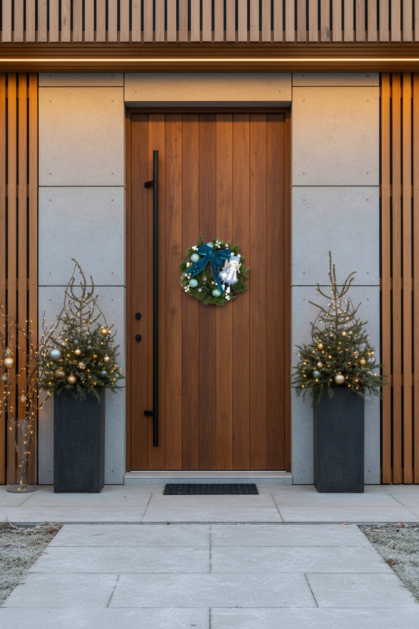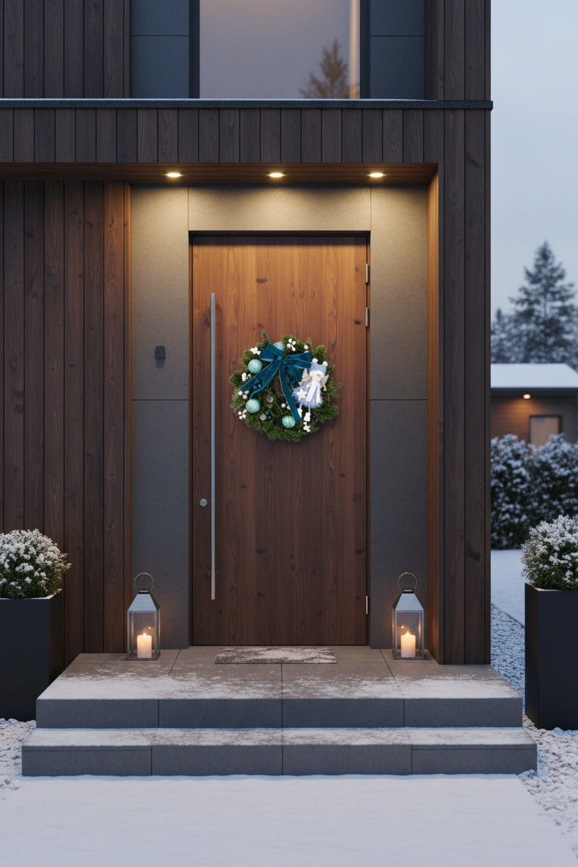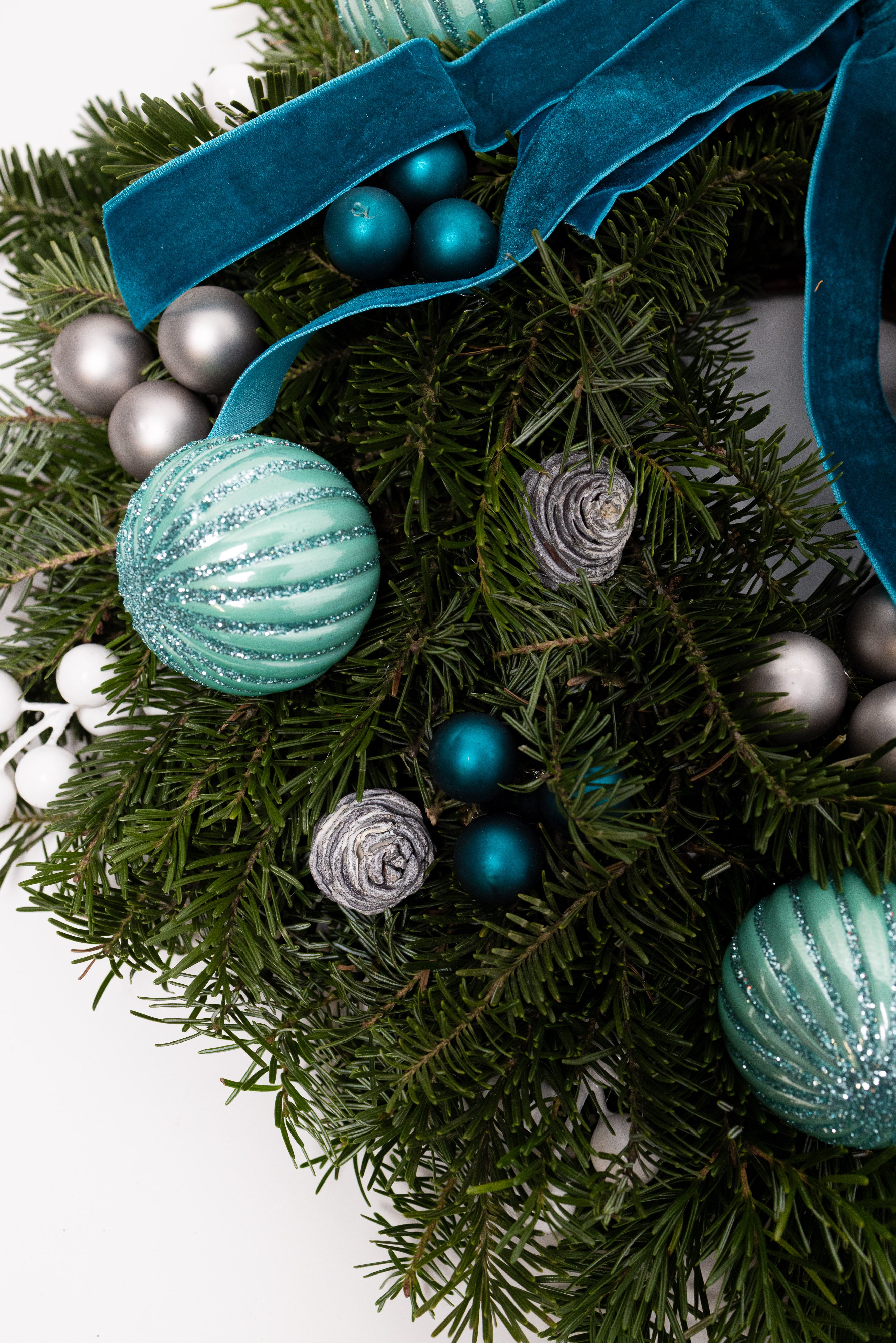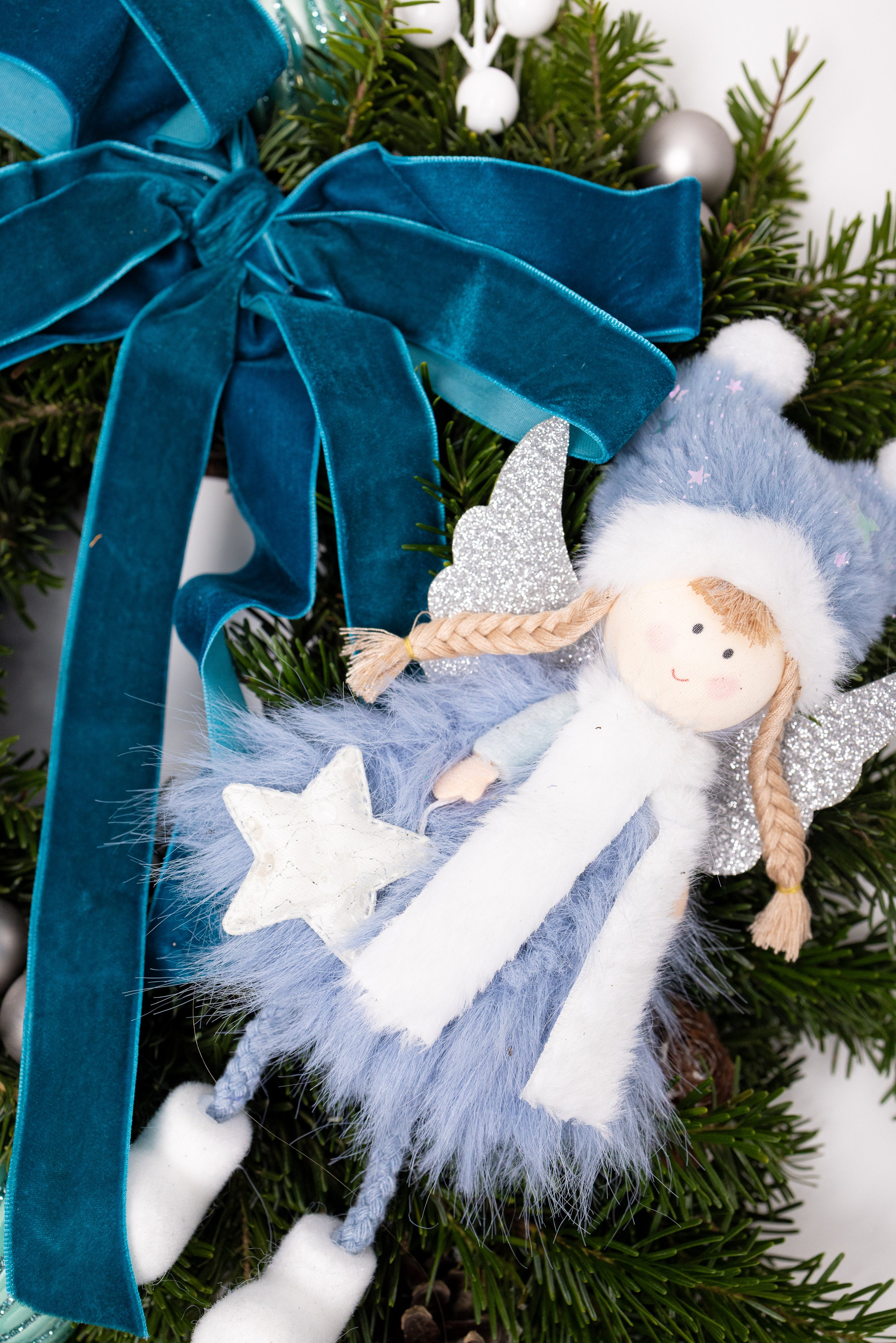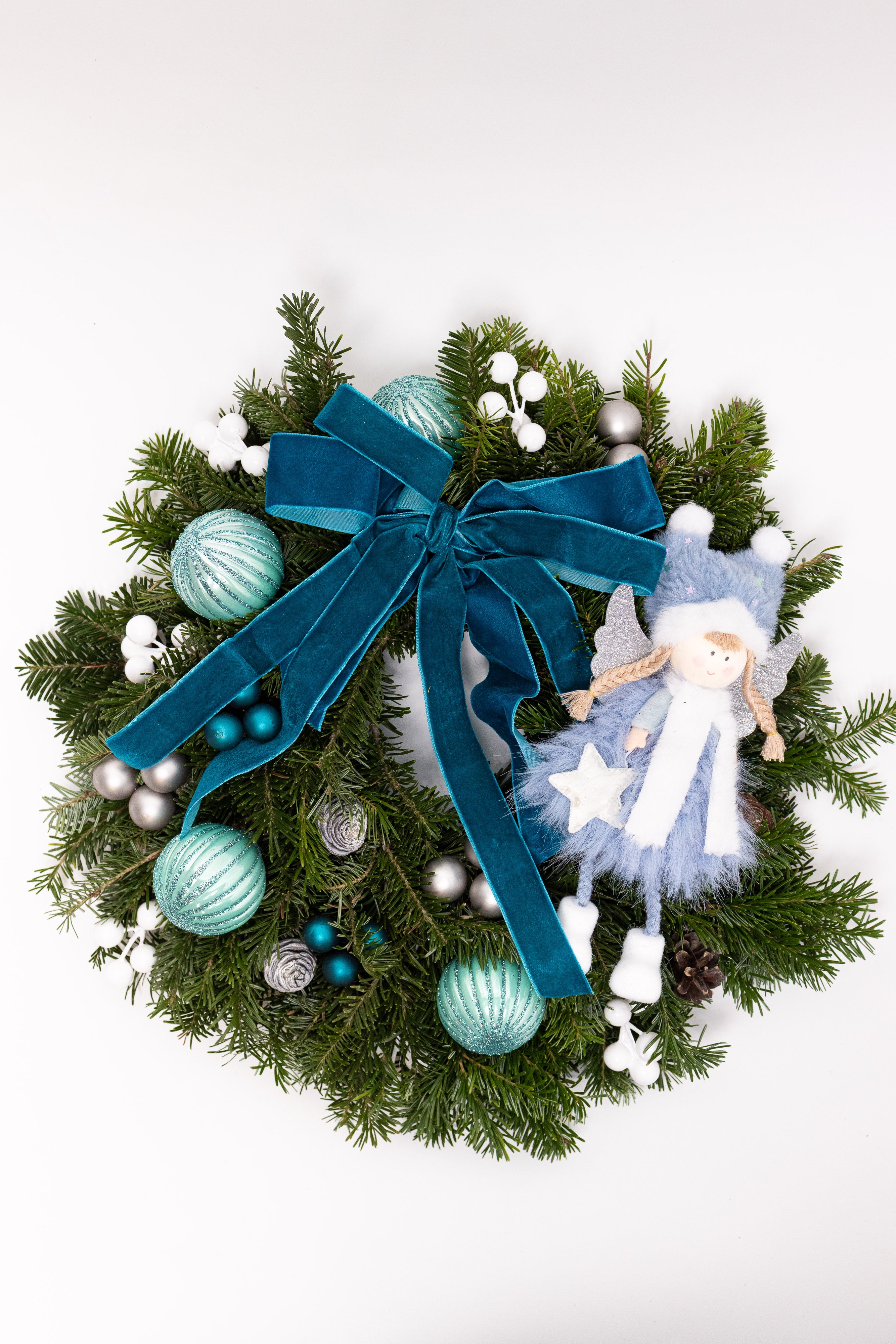 O decorațiune angelică și vibrantă, lucrată manual pe o bază bogată din brad natural Nobilis proaspăt. Aranjamentul dispune de o zână delicată în nuanțe de bleu-gri, o fundă somptuoasă din catifea turcoaz, globuri sclipitoare asortate și bobițe albe contrastante. Calitate premium.