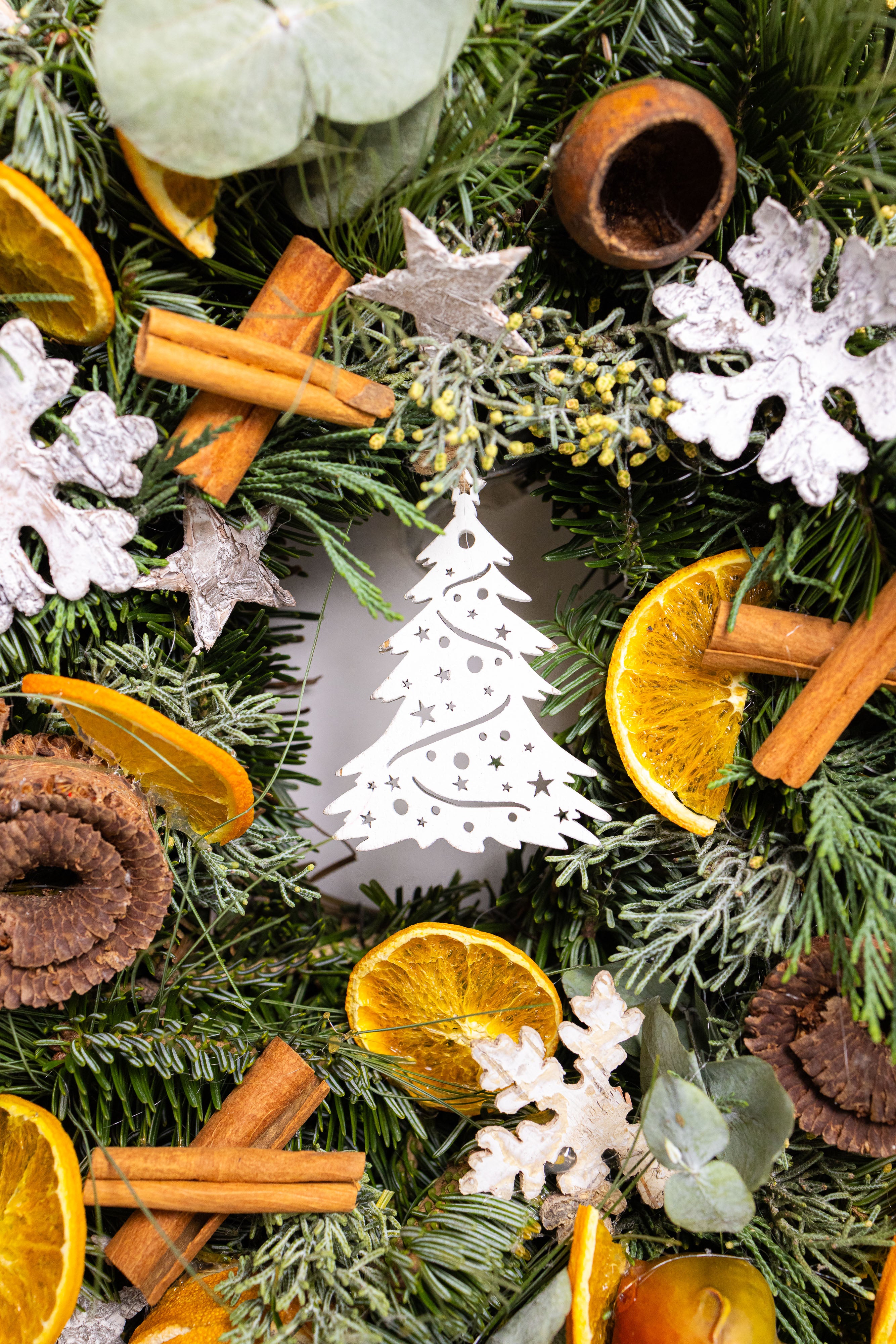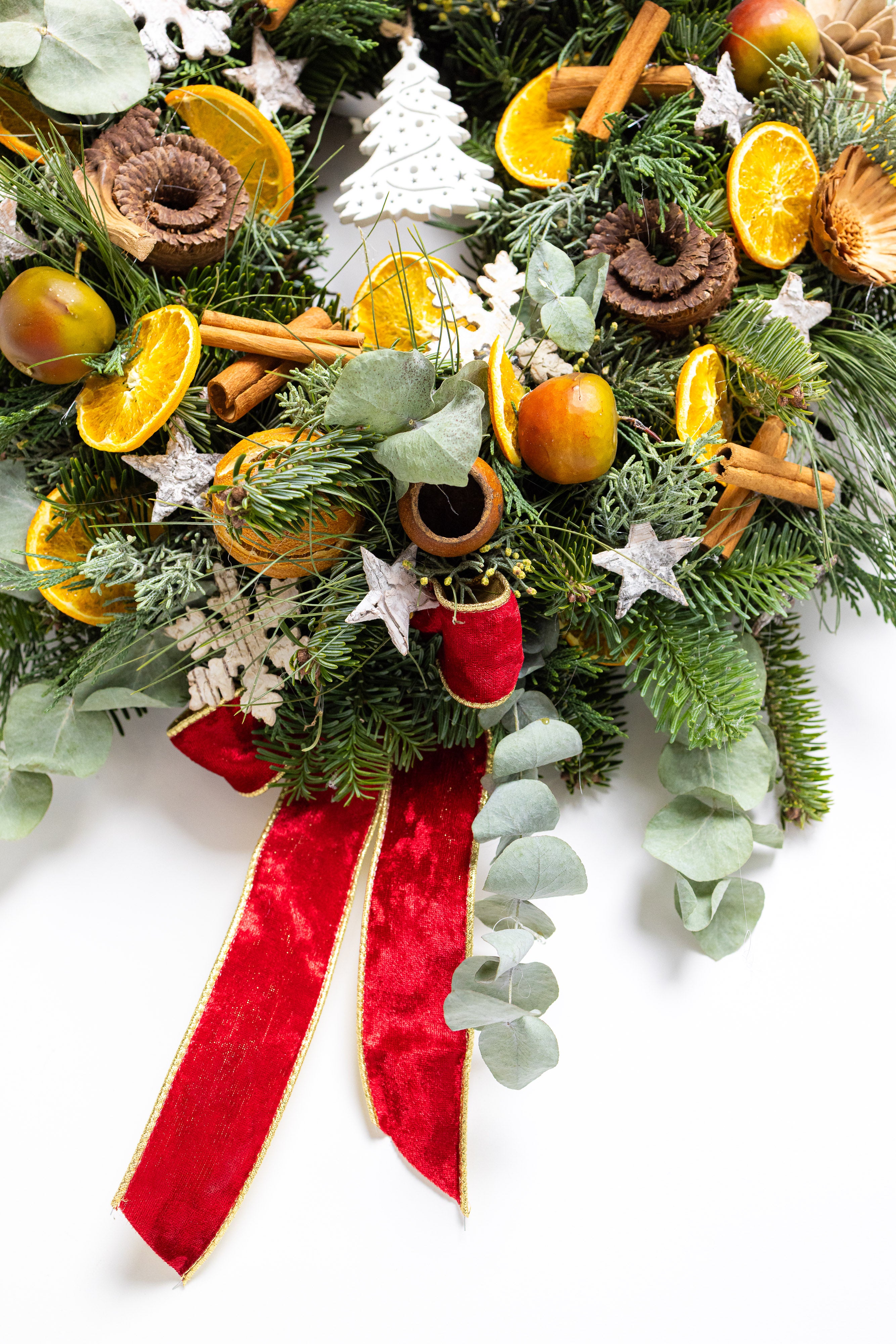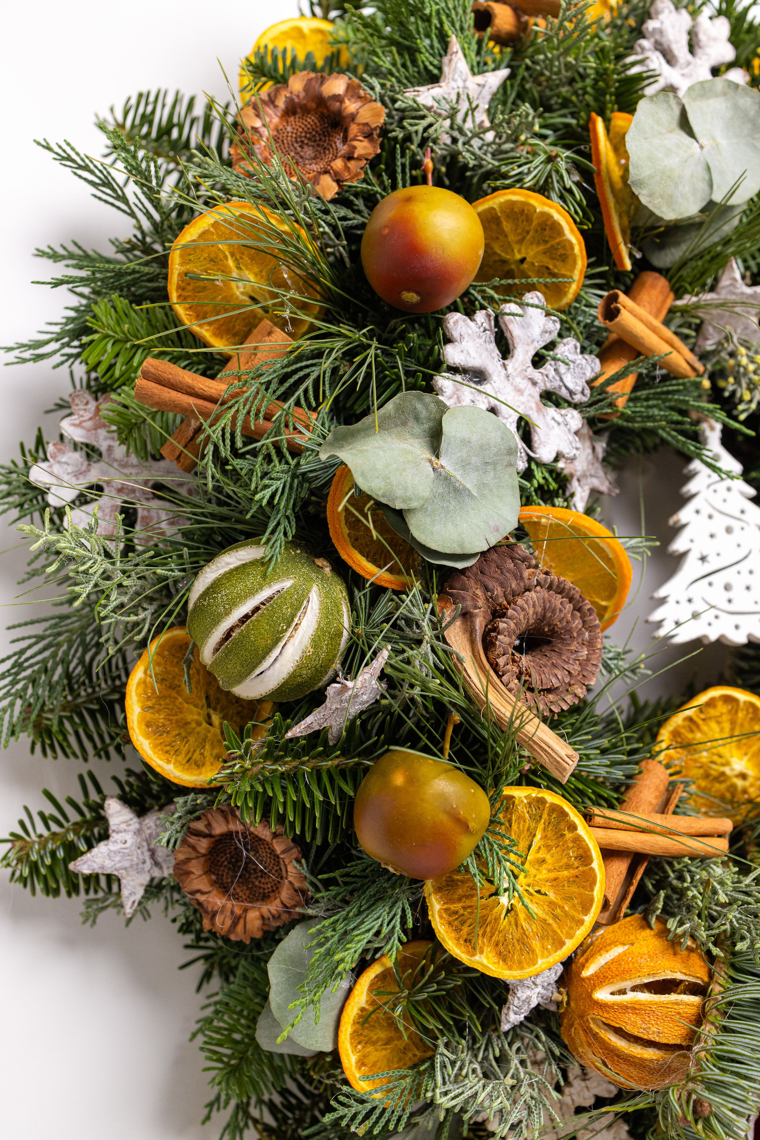 O creație botanică impresionantă, realizată dintr-un mix de brad natural și eucalipt pentru un parfum și o textură deosebită. Aranjamentul central evidențiază un brăduț alb din lemn, înconjurat de fulgi de zăpadă, citrice uscate, scorțișoară și o fundă elegantă din catifea roșie.