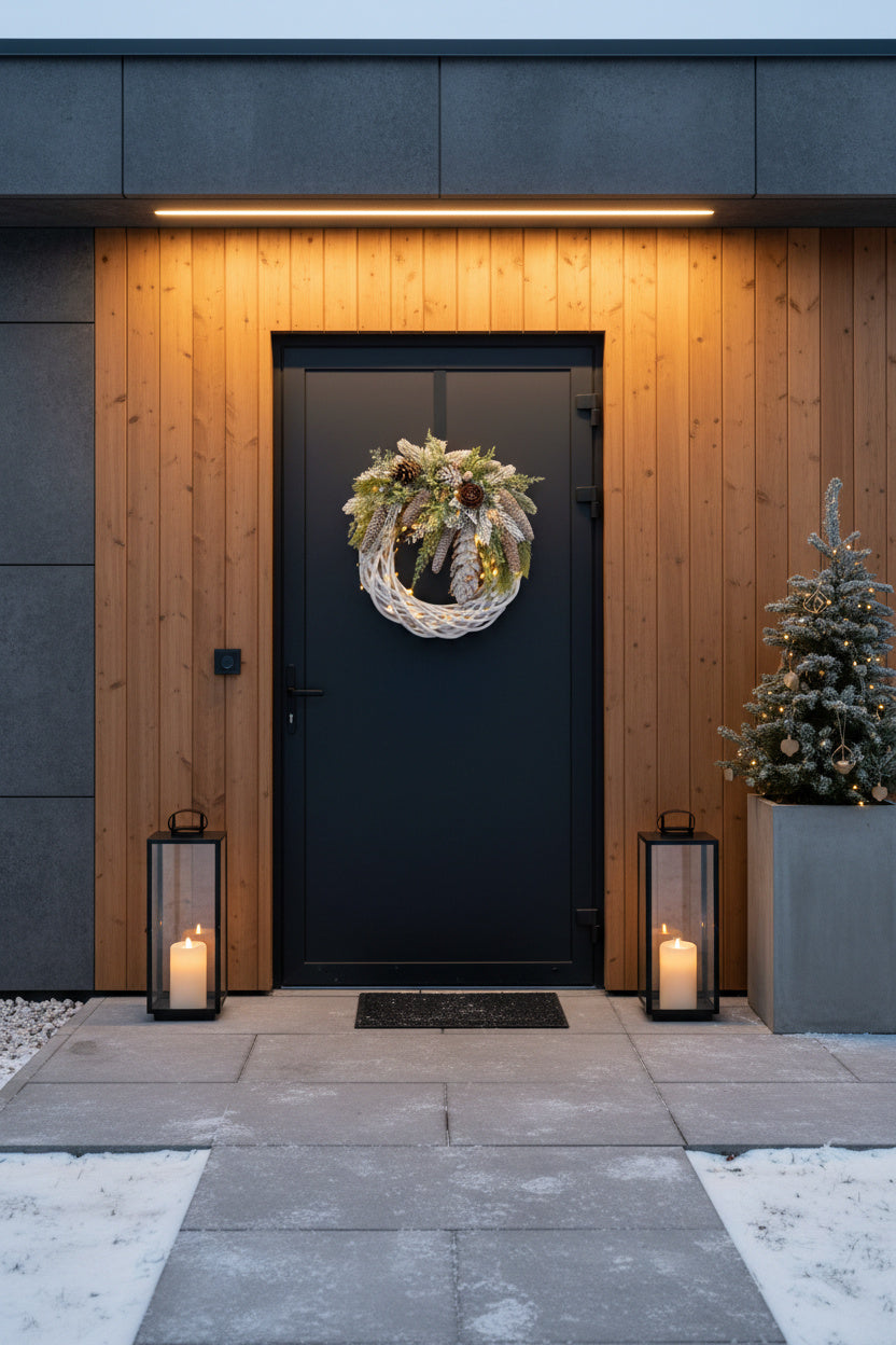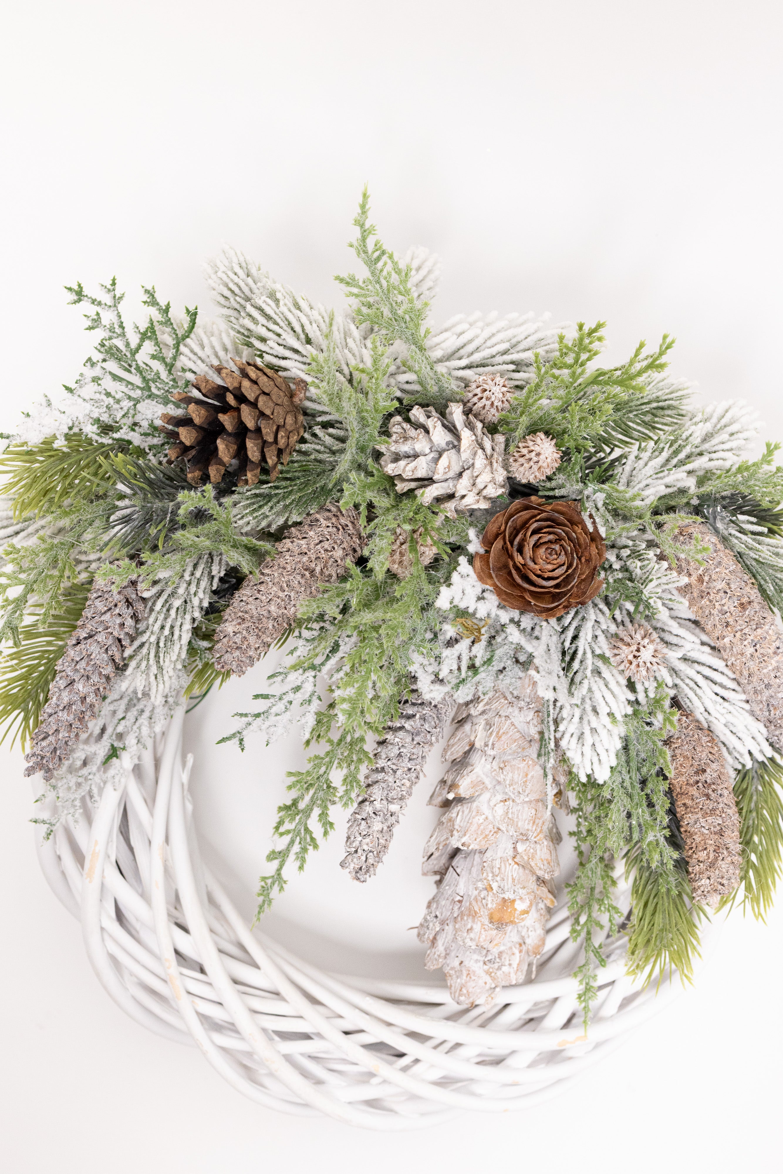O creație organică și elegantă, lucrată manual pe o bază circulară din lemn natural împletit, finisată în alb. Aranjamentul combină armonios brad artificial premium 4D nins cu o varietate de conuri naturale alungite și ramuri de tuia verde, oferind un aspect rustic-sofisticat.