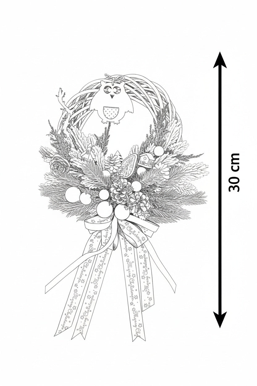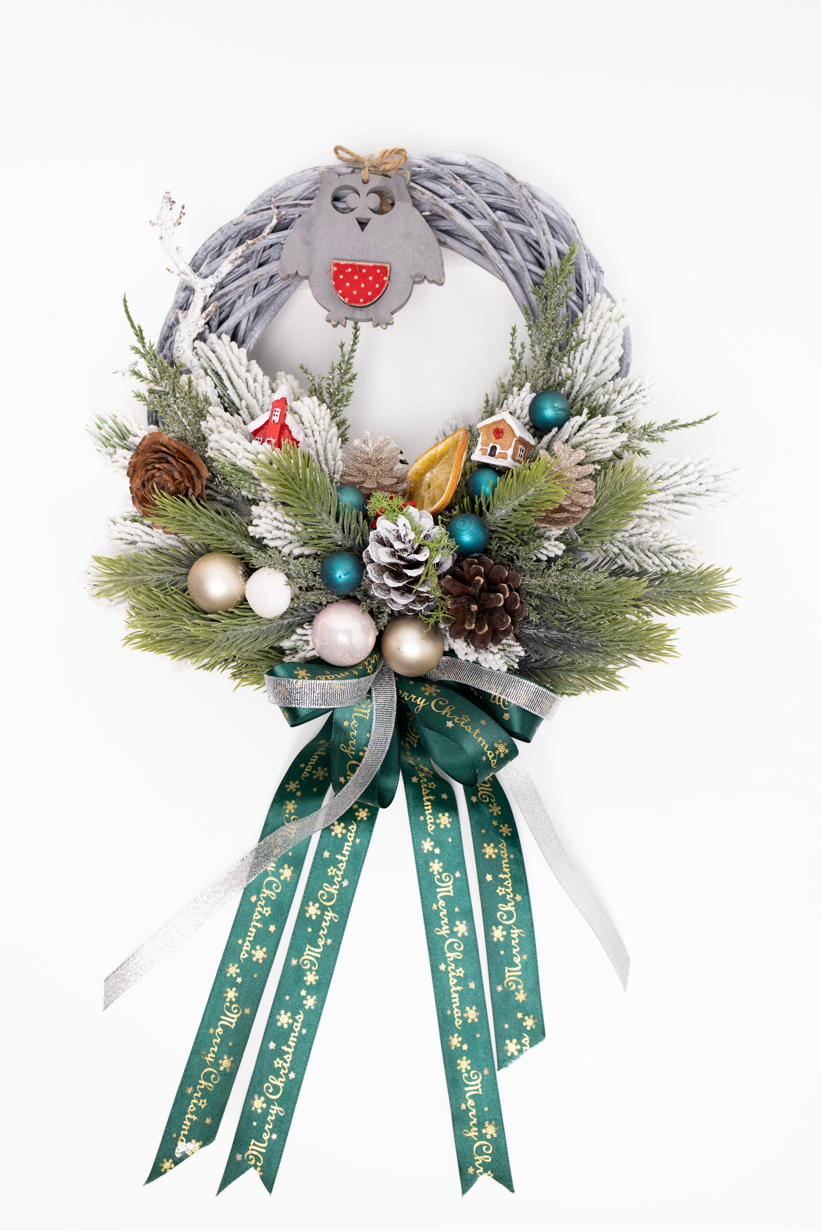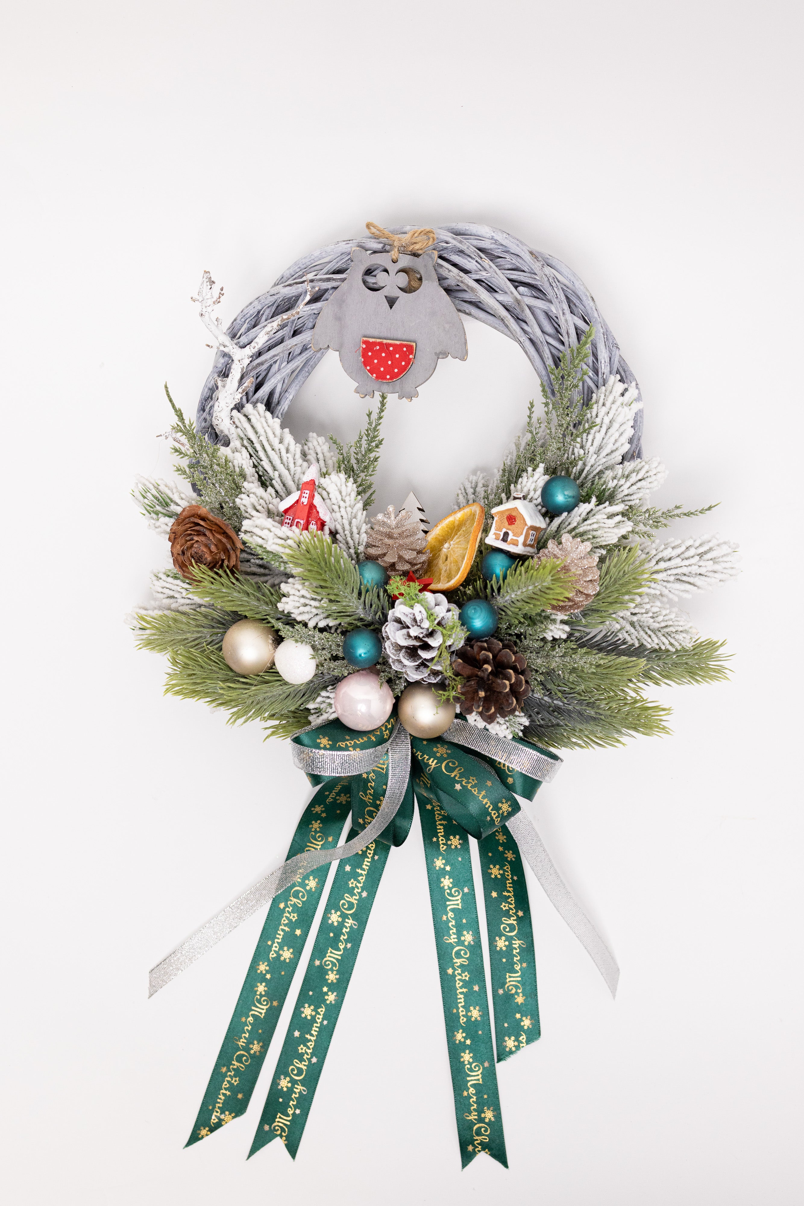 O decorațiune fermecătoare lucrată manual pe o structură din lemn natural împletit, de culoare gri. Aranjamentul dispune de o bufniță suspendată, brad nins, globuri turcoaz și aurii, căsuțe miniaturale și o fundă festivă verde cu inscripții aurii. Un decor plin de poveste și stil.