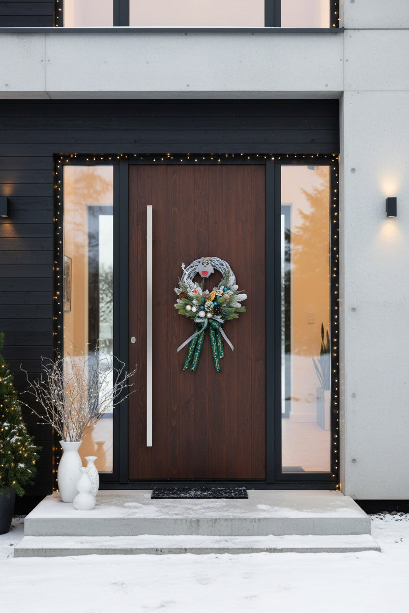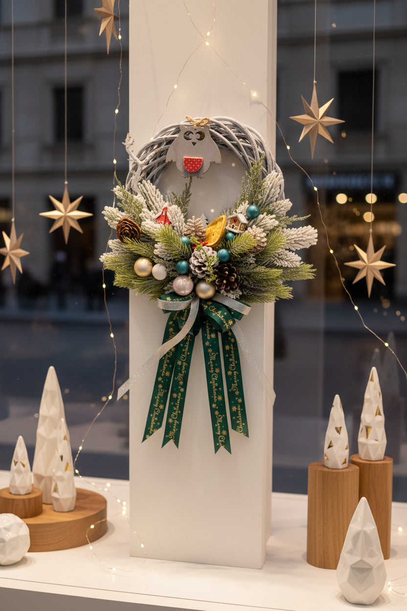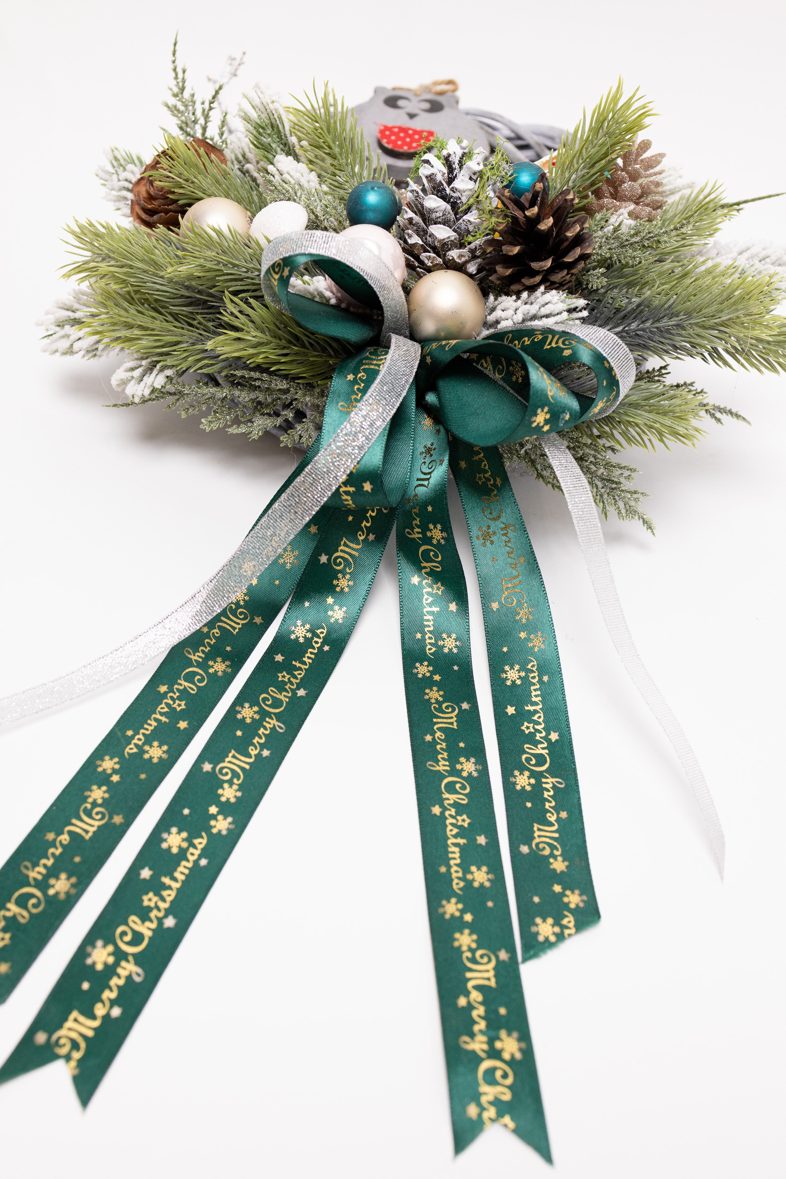 O decorațiune fermecătoare lucrată manual pe o structură din lemn natural împletit, de culoare gri. Aranjamentul dispune de o bufniță suspendată, brad nins, globuri turcoaz și aurii, căsuțe miniaturale și o fundă festivă verde cu inscripții aurii. Un decor plin de poveste și stil.