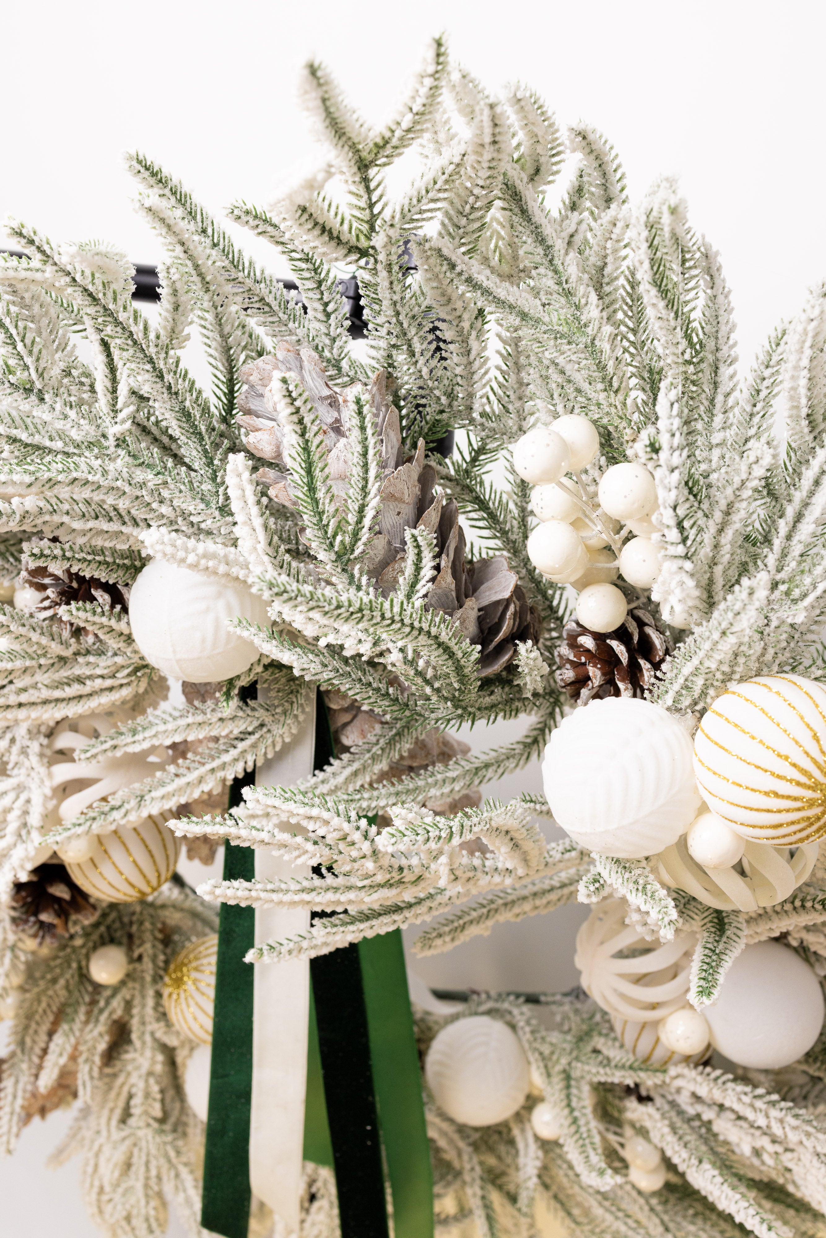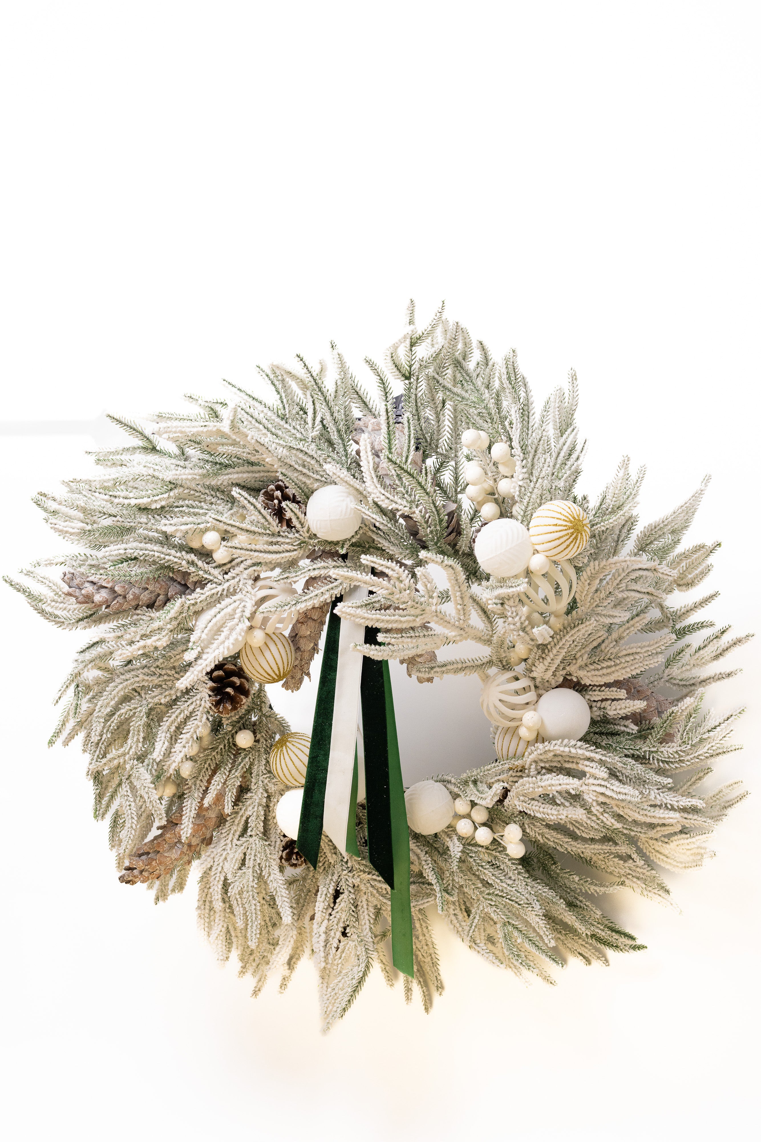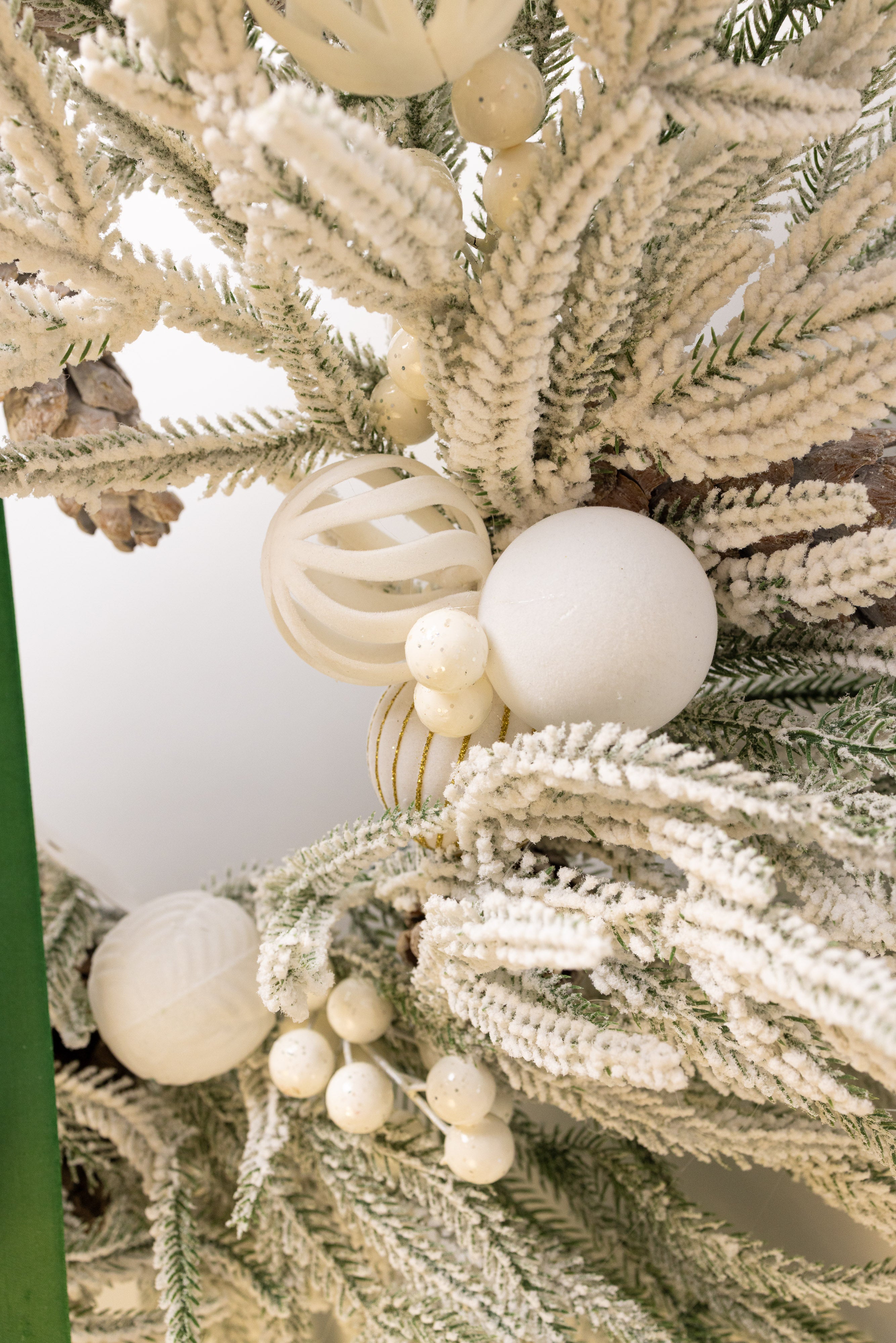 O decorațiune monumentală, realizată pe o bază extrem de bogată de brad artificial premium 4D, cu un efect de ninsoare abundentă. Aranjamentul este decorat cu globuri albe mate și cu dungi aurii, bobițe sidefate și conuri naturale, fiind completat de panglici elegante din catifea verde.