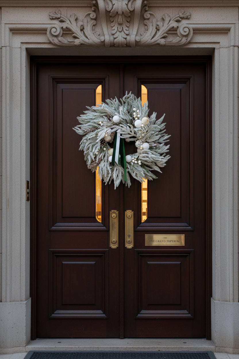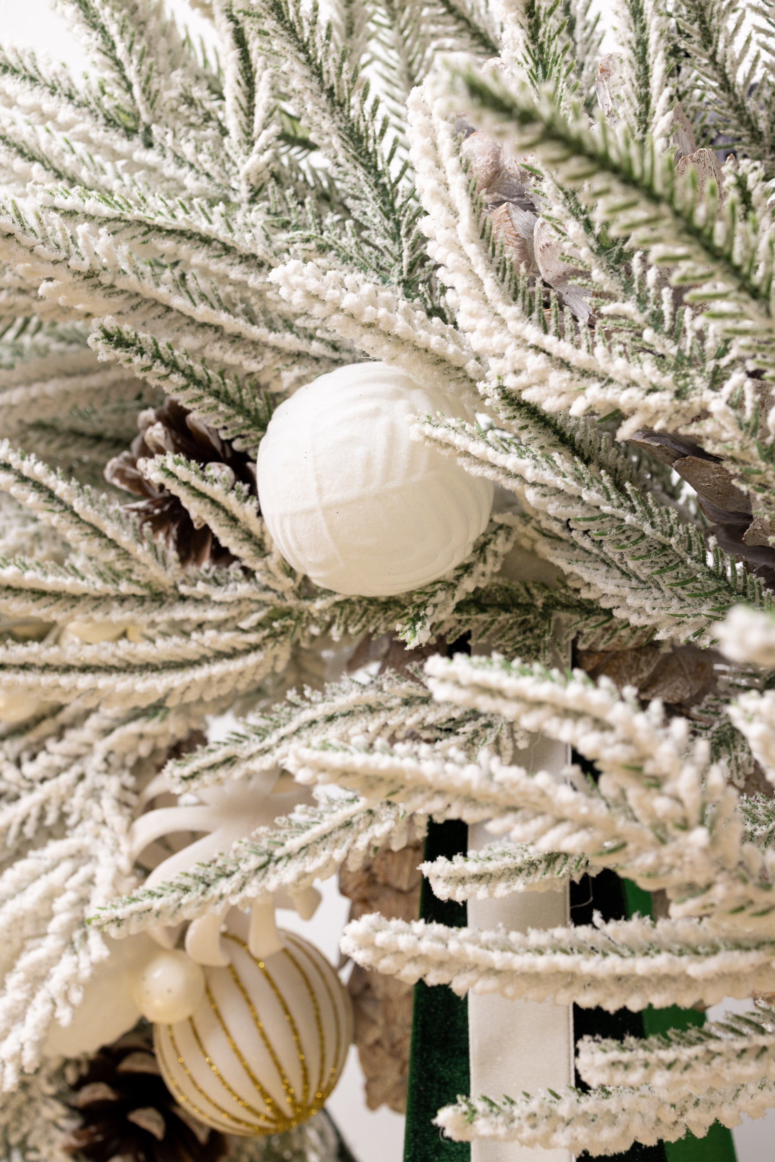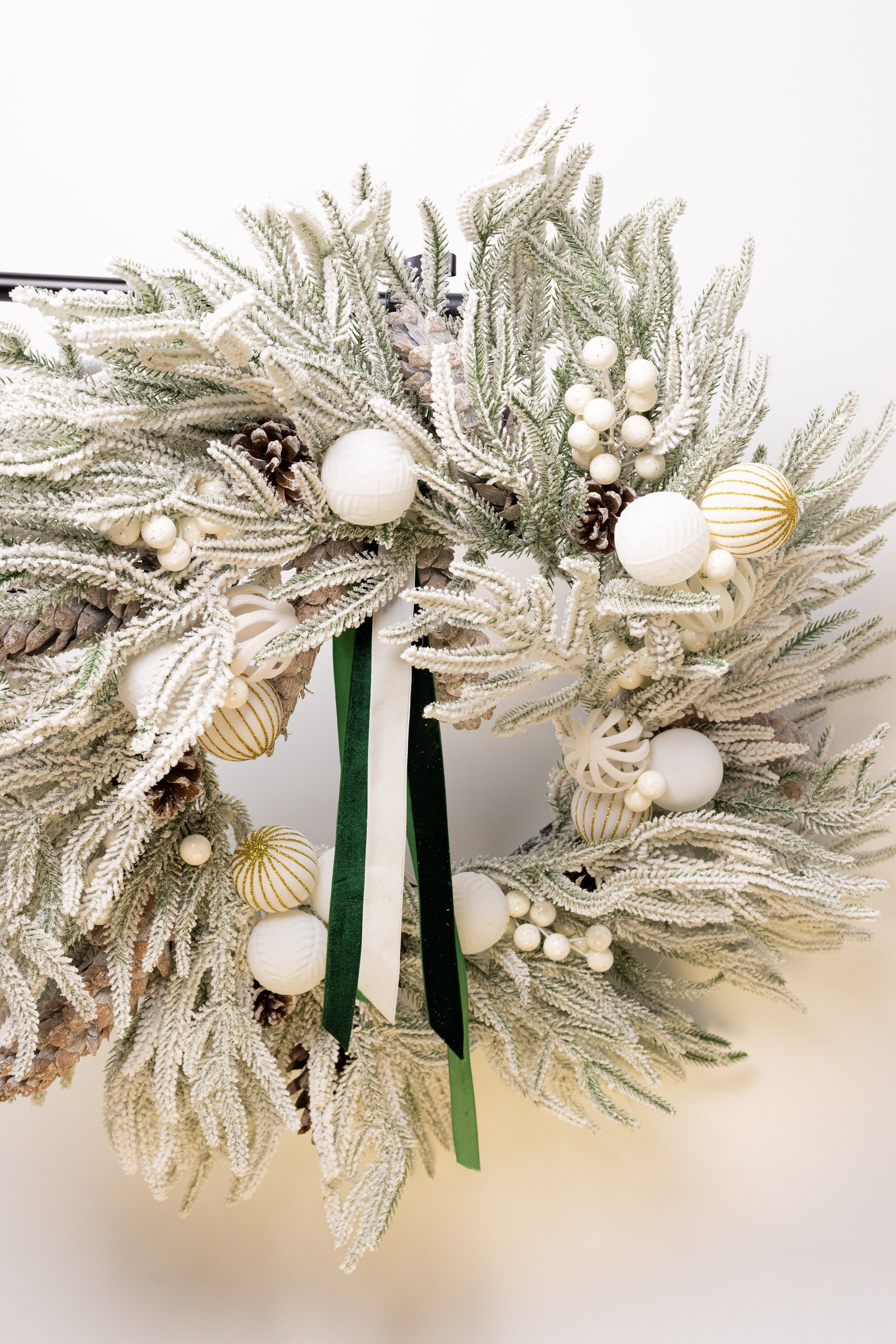 O decorațiune monumentală, realizată pe o bază extrem de bogată de brad artificial premium 4D, cu un efect de ninsoare abundentă. Aranjamentul este decorat cu globuri albe mate și cu dungi aurii, bobițe sidefate și conuri naturale, fiind completat de panglici elegante din catifea verde.