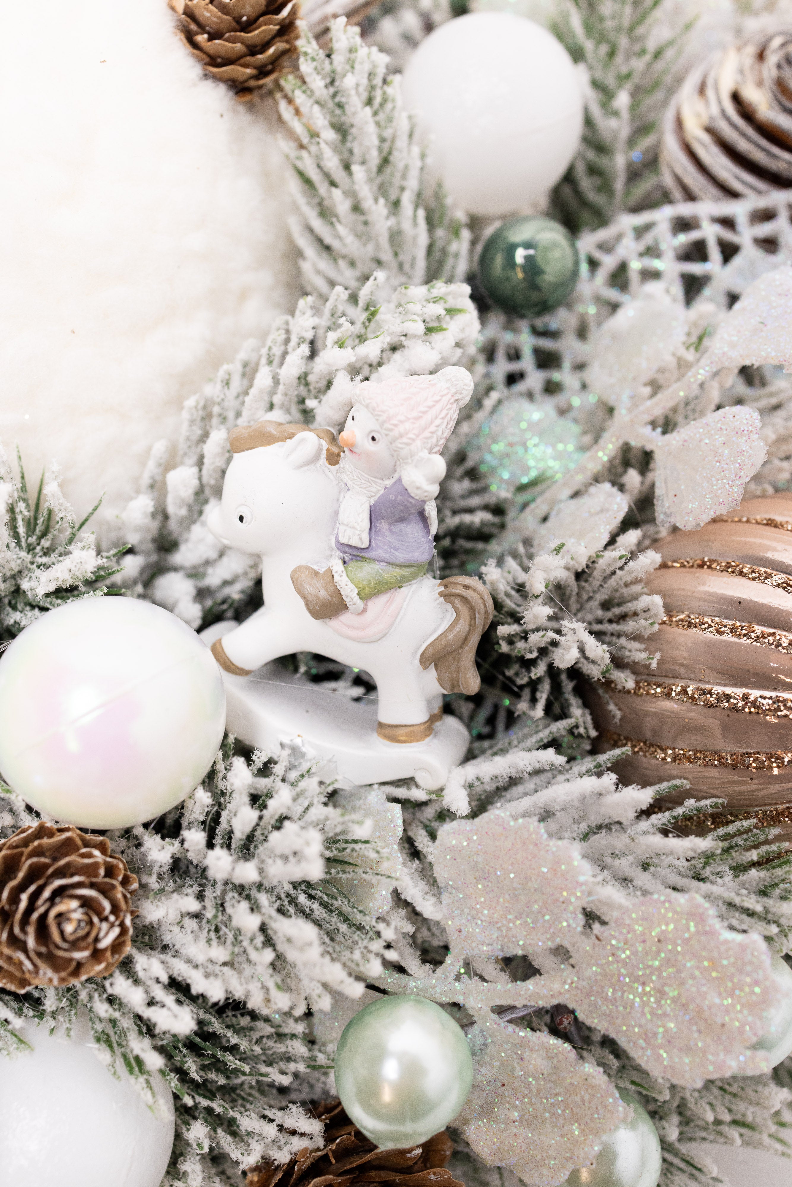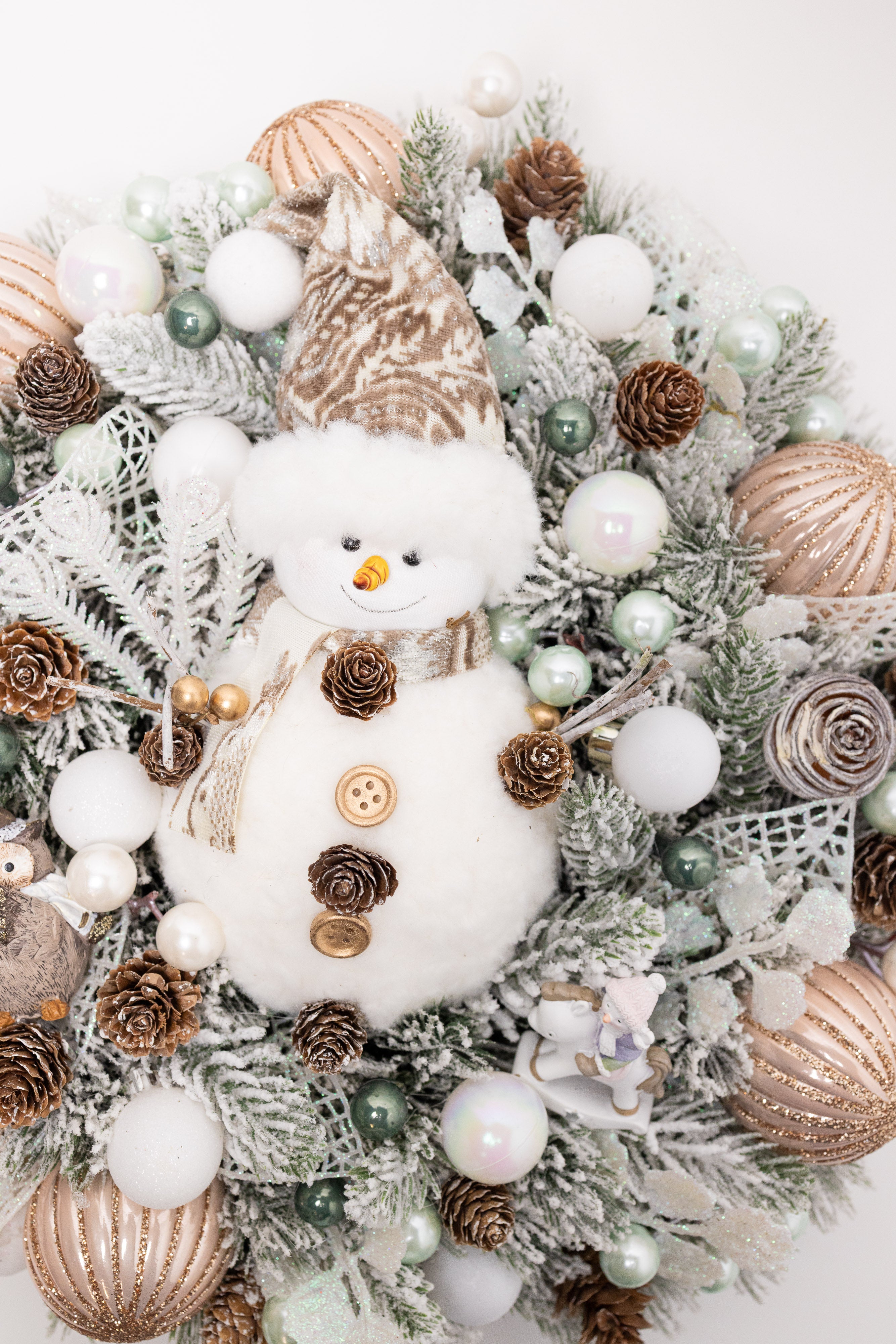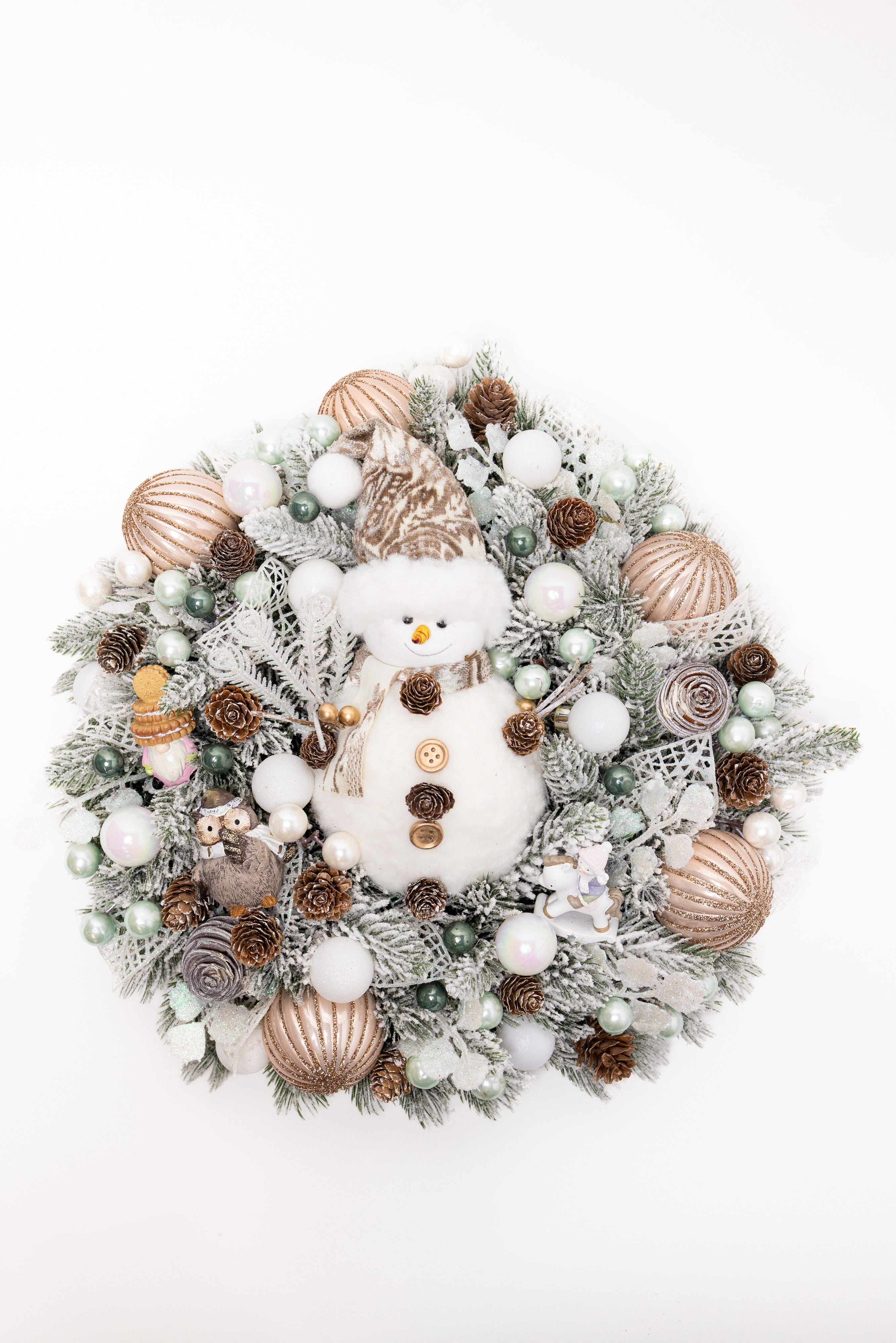 O piesă monumentală de lux, lucrată manual pe o bază densă de brad artificial premium 4D, bogat nins. Aranjamentul central prezintă un om de zăpadă generos, înconjurat de globuri sidefate de dimensiuni mari, bobițe pastelate, conuri naturale și figurine tematice precum o bufniță și un căluț balansoar.