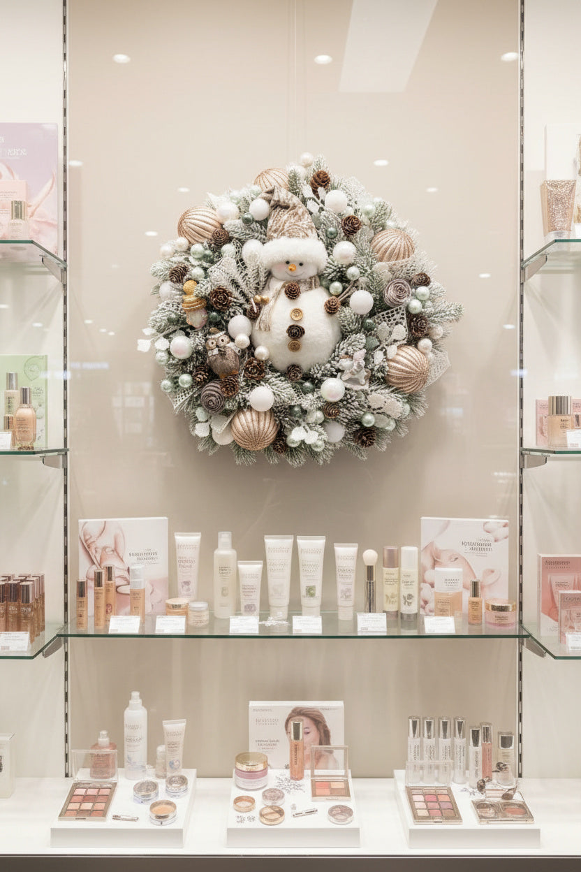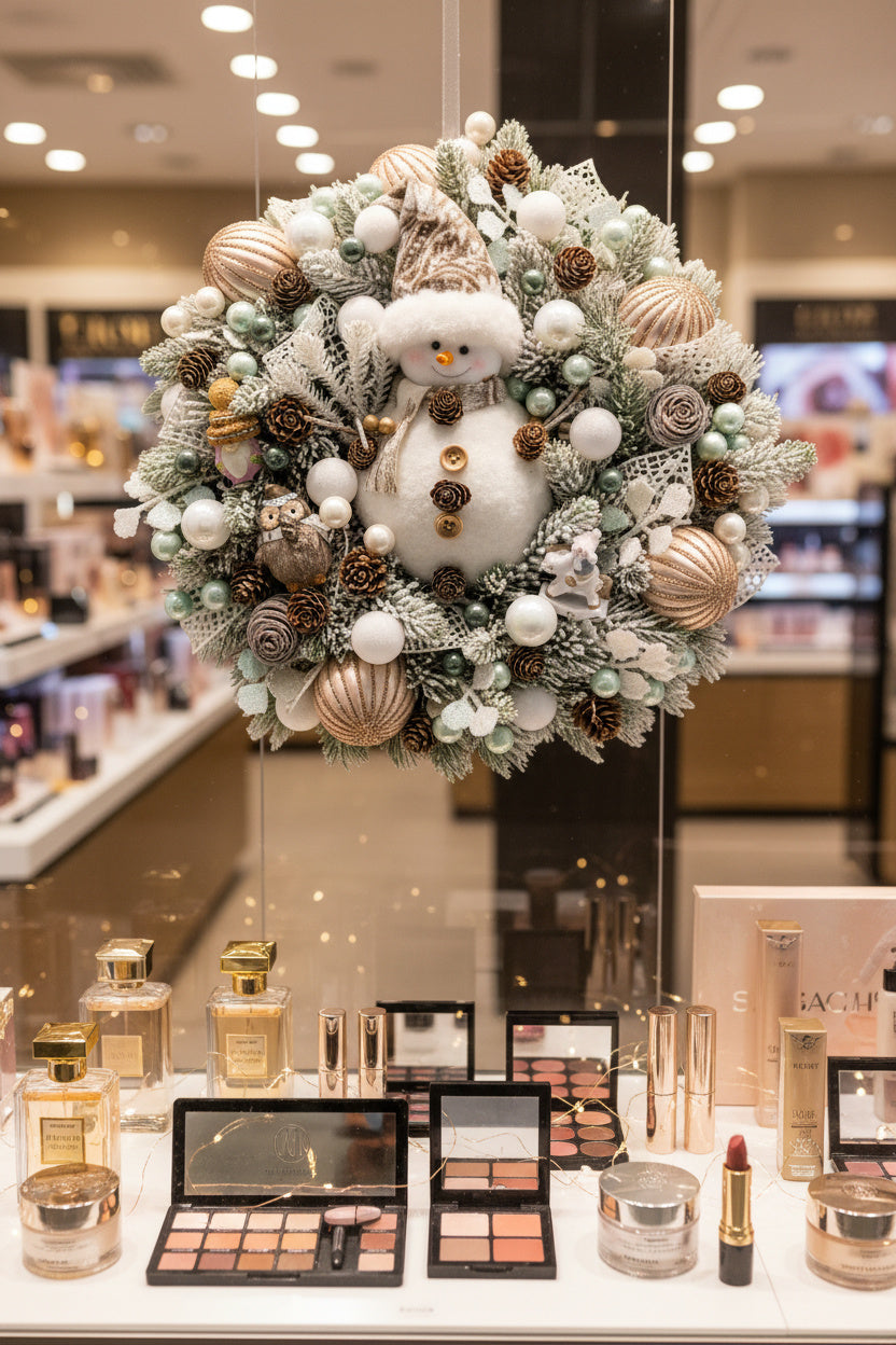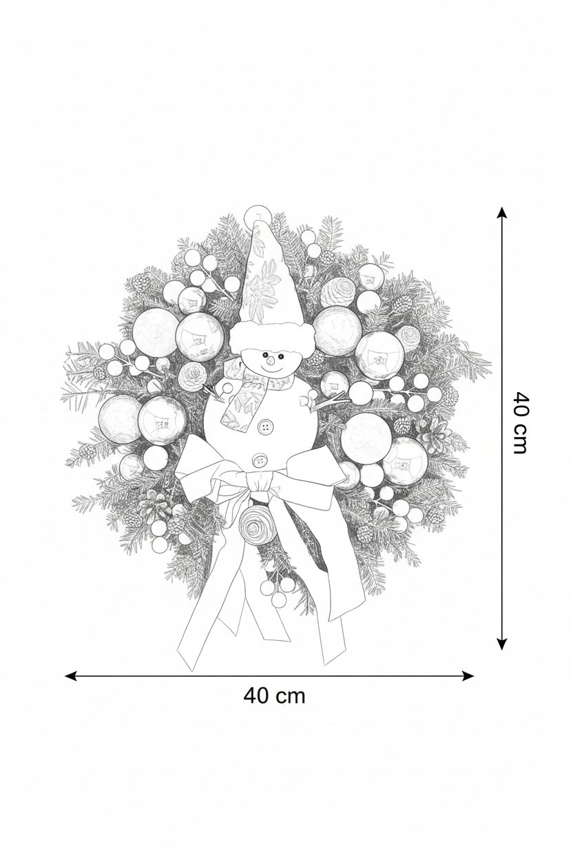 O piesă monumentală de lux, lucrată manual pe o bază densă de brad artificial premium 4D, bogat nins. Aranjamentul central prezintă un om de zăpadă generos, înconjurat de globuri sidefate de dimensiuni mari, bobițe pastelate, conuri naturale și figurine tematice precum o bufniță și un căluț balansoar.