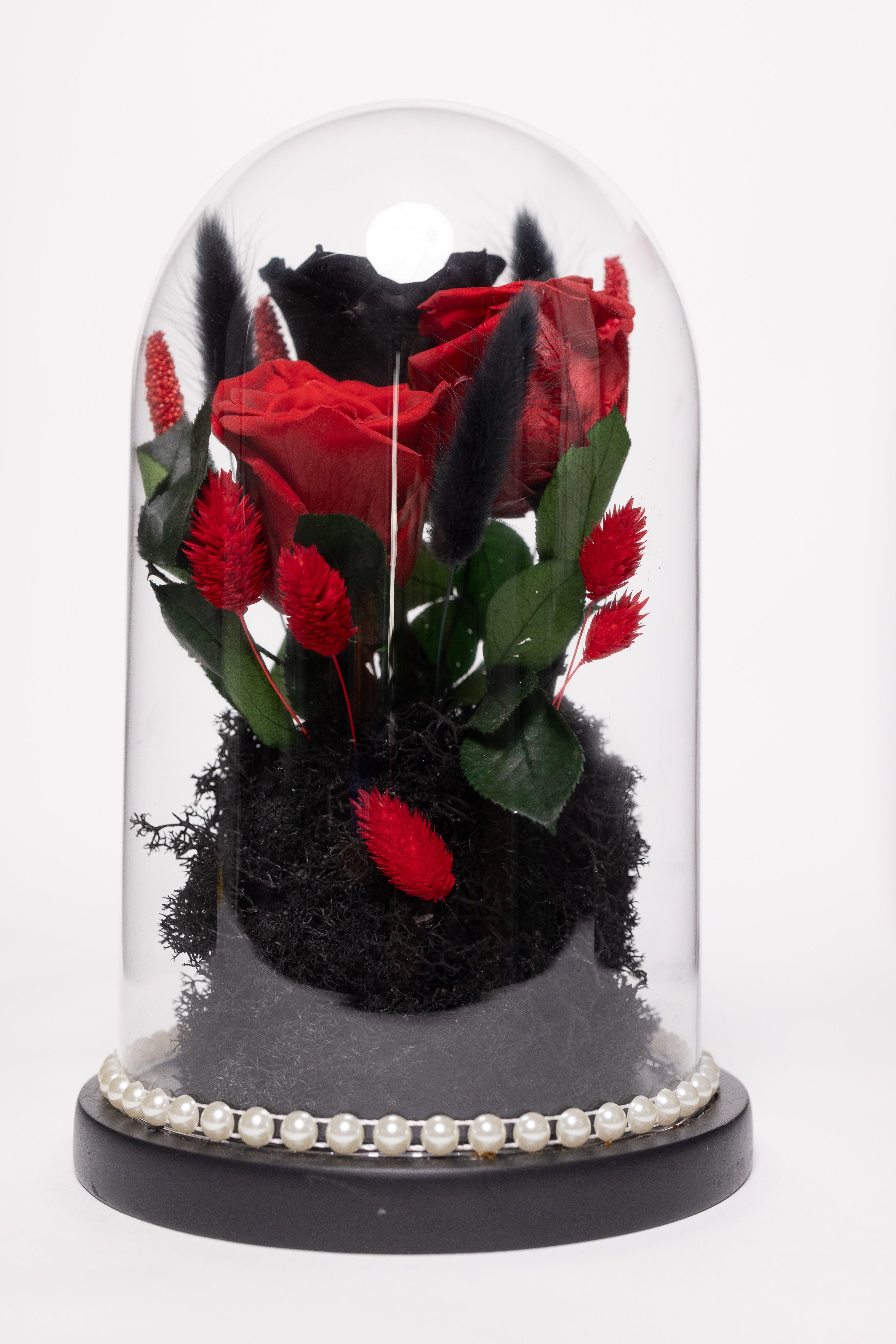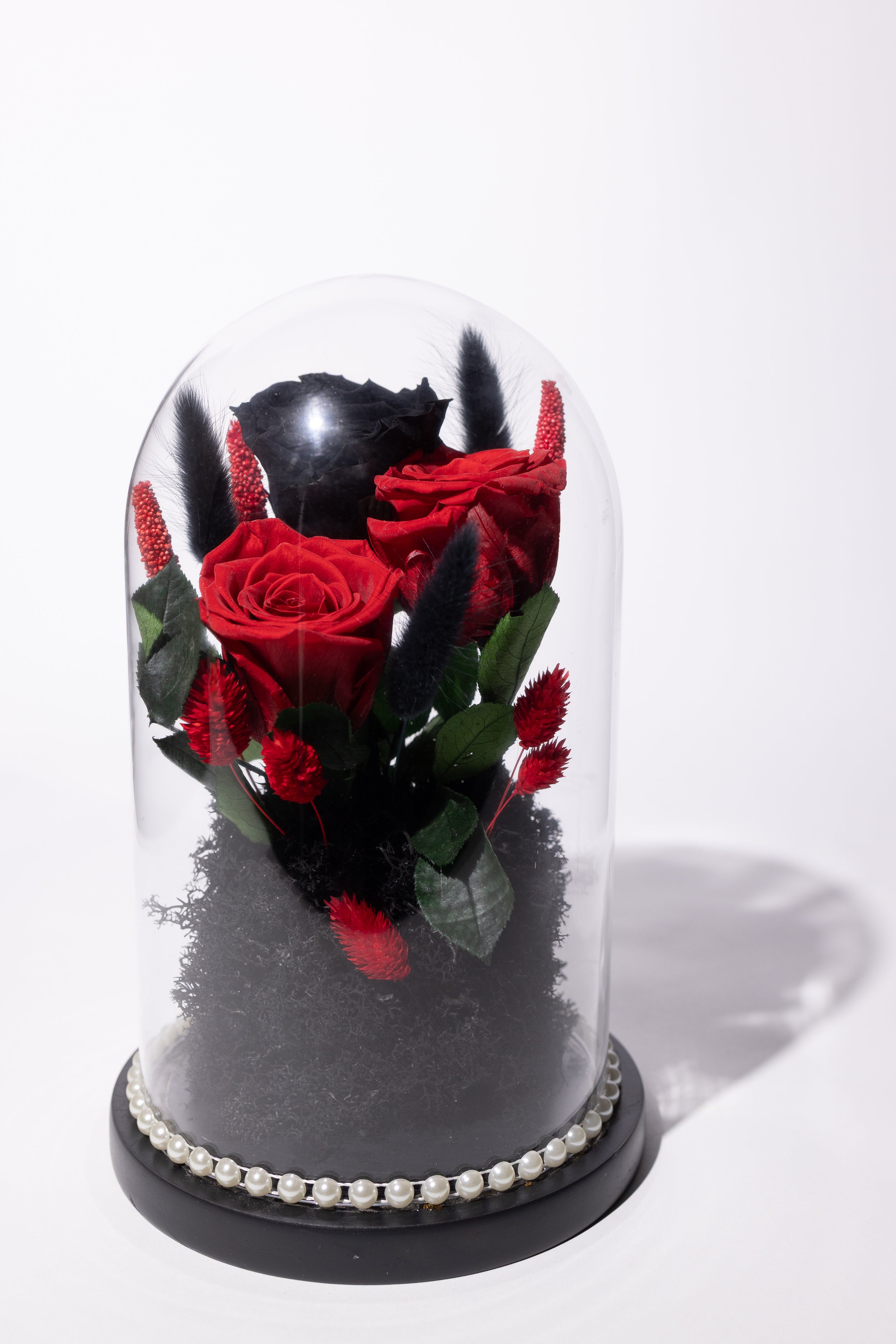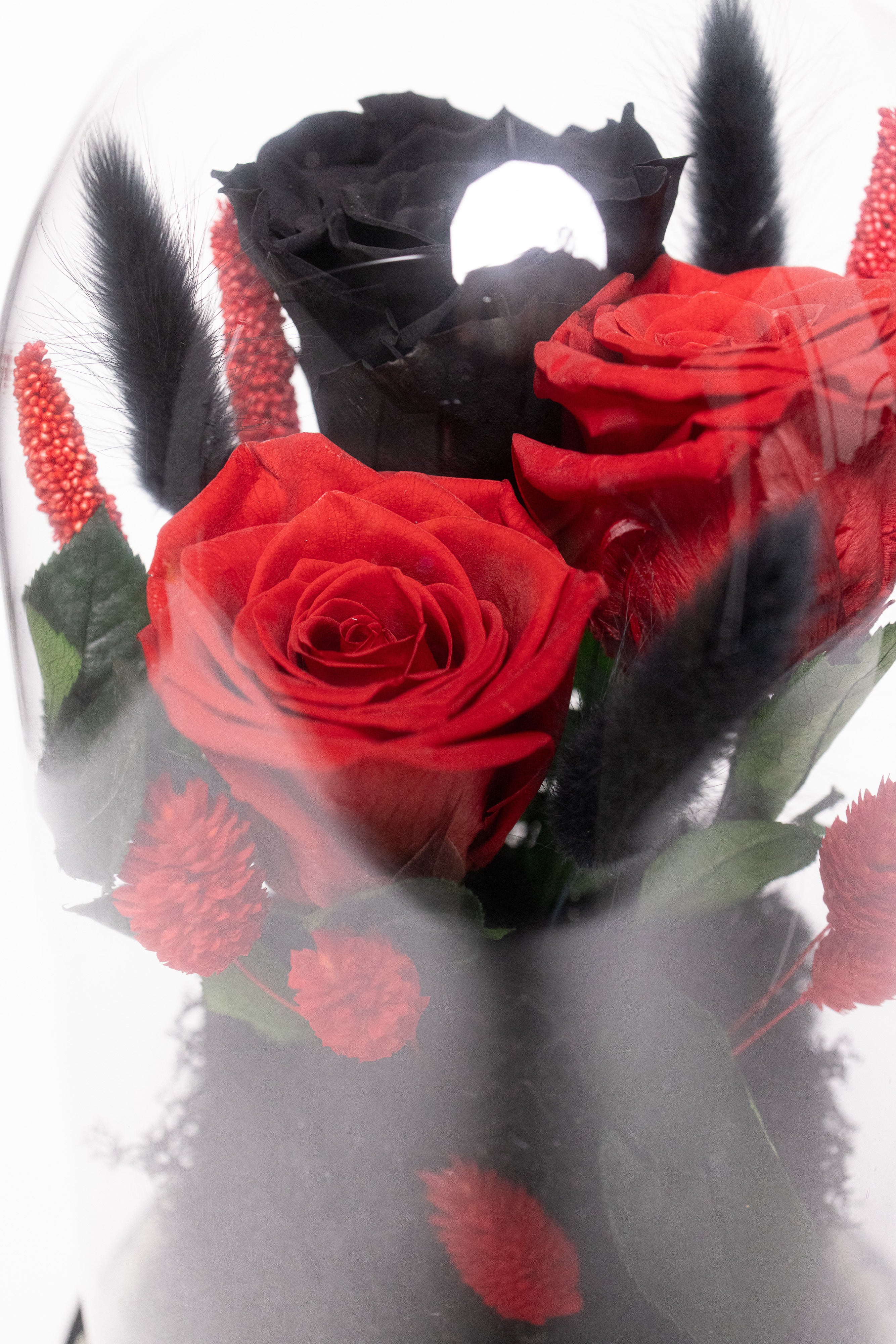 O compoziție dramatică și sofisticată sub o cupolă de sticlă, ce îmbină pasiunea cu misterul. Aranjamentul conține 3 trandafiri criogenați (unul negru central și doi roșii), așezați pe un pat elegant de mușchi natural și licheni negri. Designul este îmbogățit cu accente de stuf roșu (lagurus) și frunze naturale de trandafir, iar baza neagră este decorată circular cu un șirag de perle albe pentru un finisaj regal.