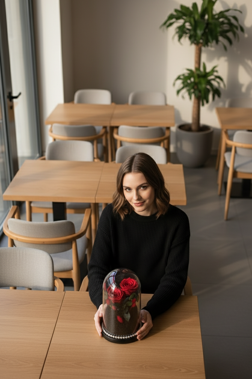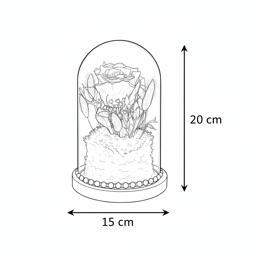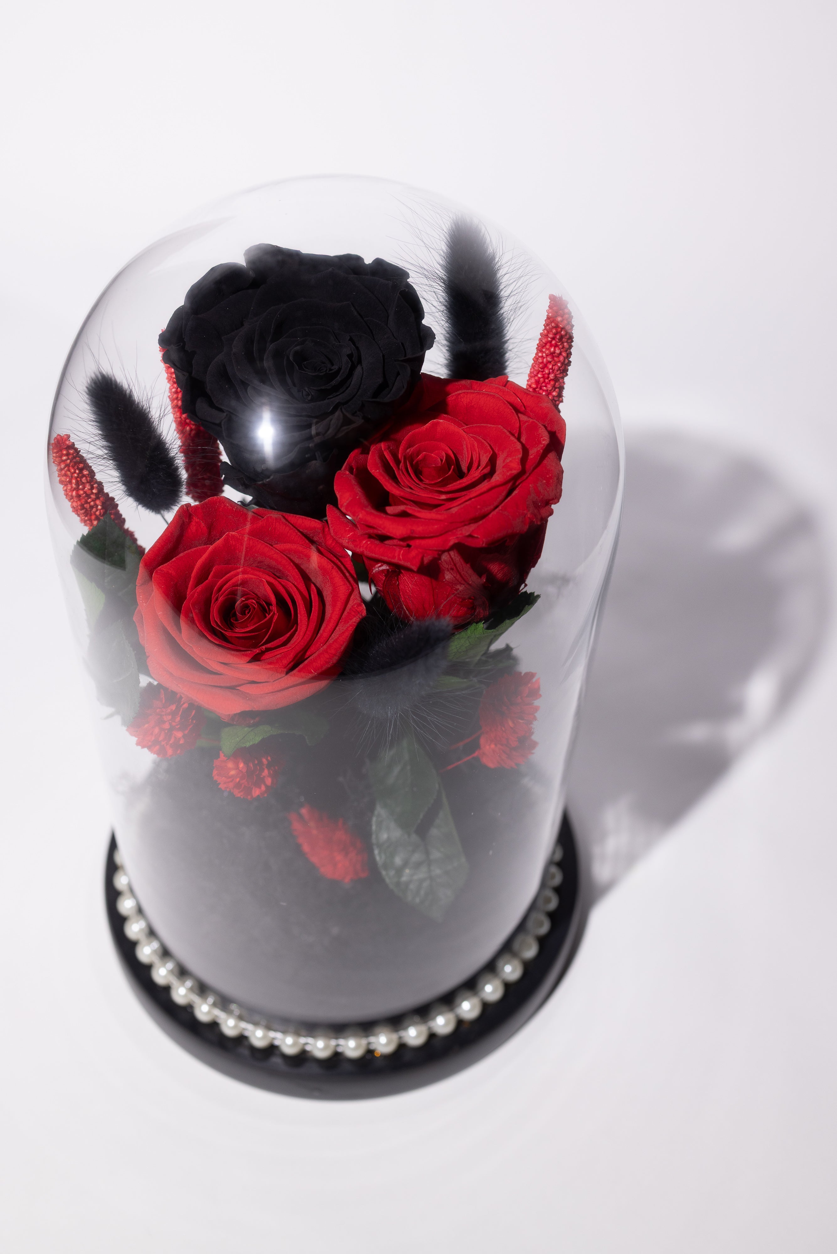 O compoziție dramatică și sofisticată sub o cupolă de sticlă, ce îmbină pasiunea cu misterul. Aranjamentul conține 3 trandafiri criogenați (unul negru central și doi roșii), așezați pe un pat elegant de mușchi natural și licheni negri. Designul este îmbogățit cu accente de stuf roșu (lagurus) și frunze naturale de trandafir, iar baza neagră este decorată circular cu un șirag de perle albe pentru un finisaj regal.