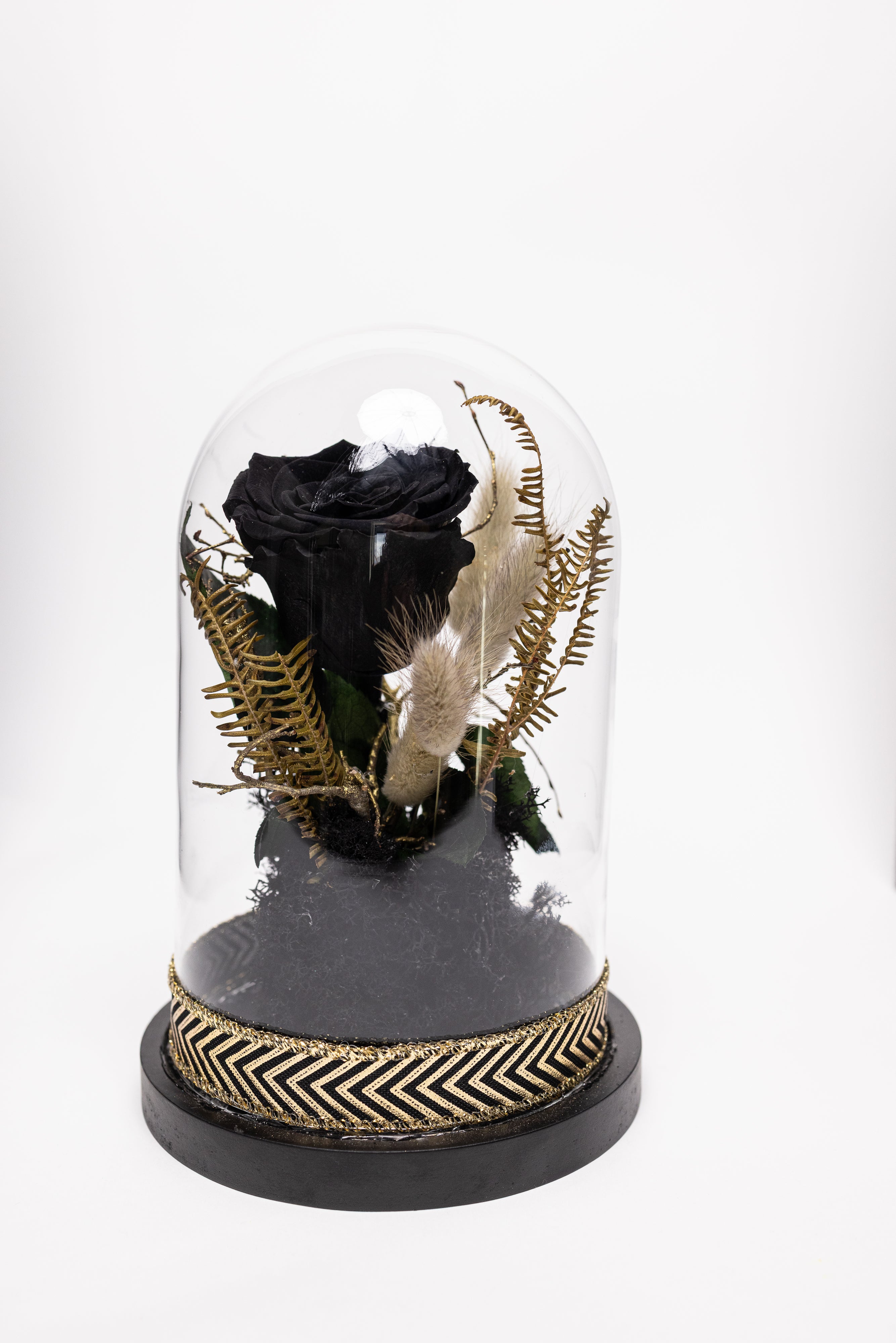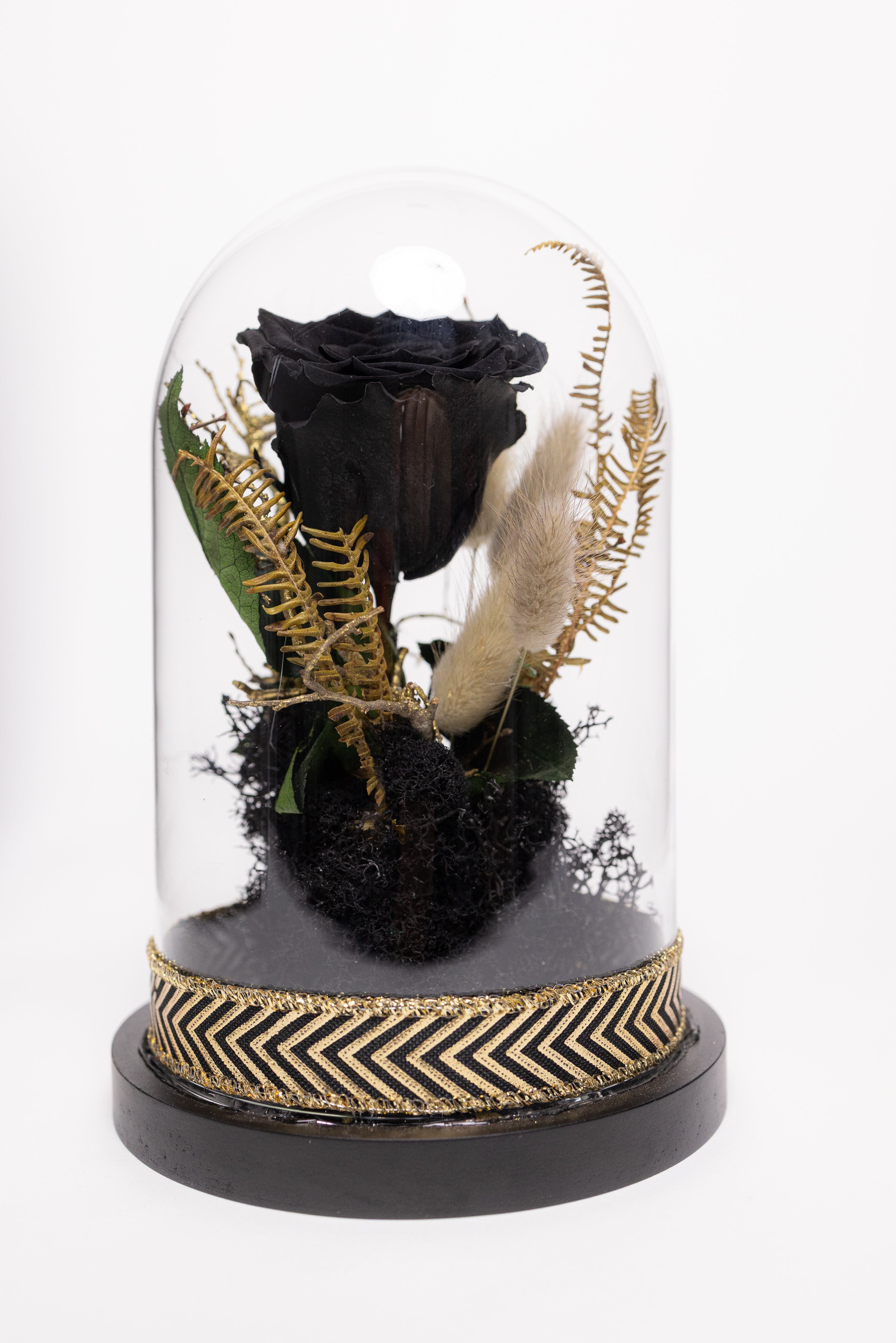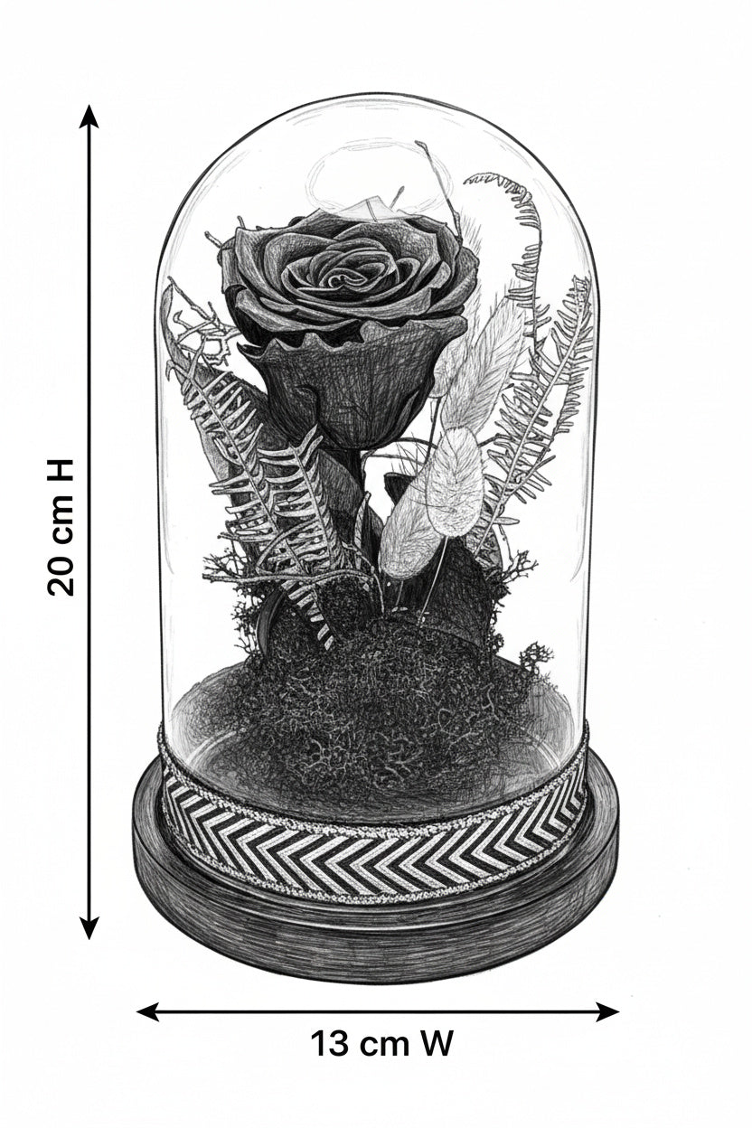 O piesă de decor exclusivistă ce emană mister și rafinament. Această cupolă de sticlă protejează un trandafir criogenat negru impunător, așezat pe un pat de mușchi natural și licheni negri. Compoziția este îmbogățită cu elemente vegetale veșnice rare (frunze tip ferigă) în nuanțe de auriu antic și este finisată la bază cu o bandă textilă elegantă cu model geometric negru-auriu. Un simbol al eleganței atemporale.