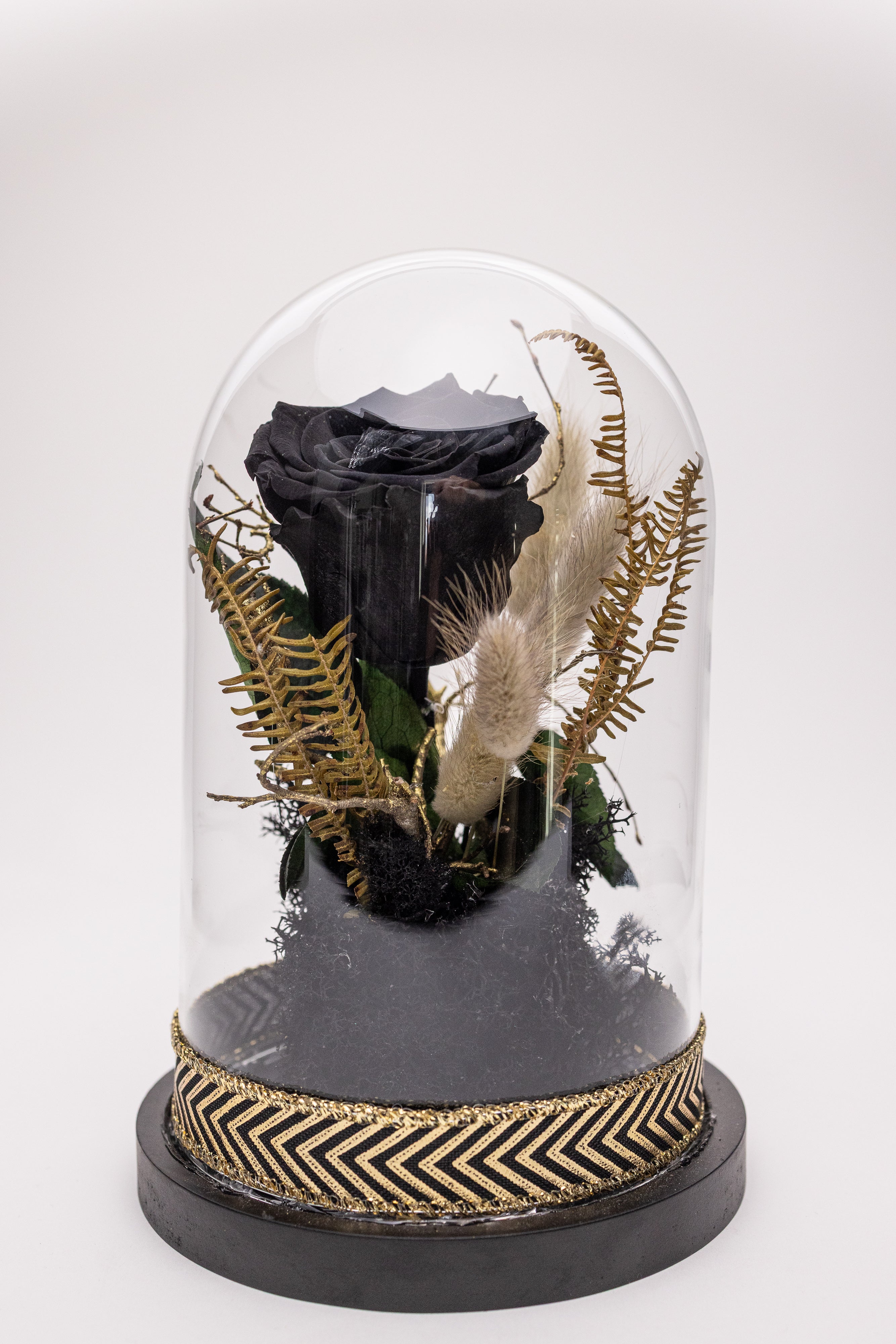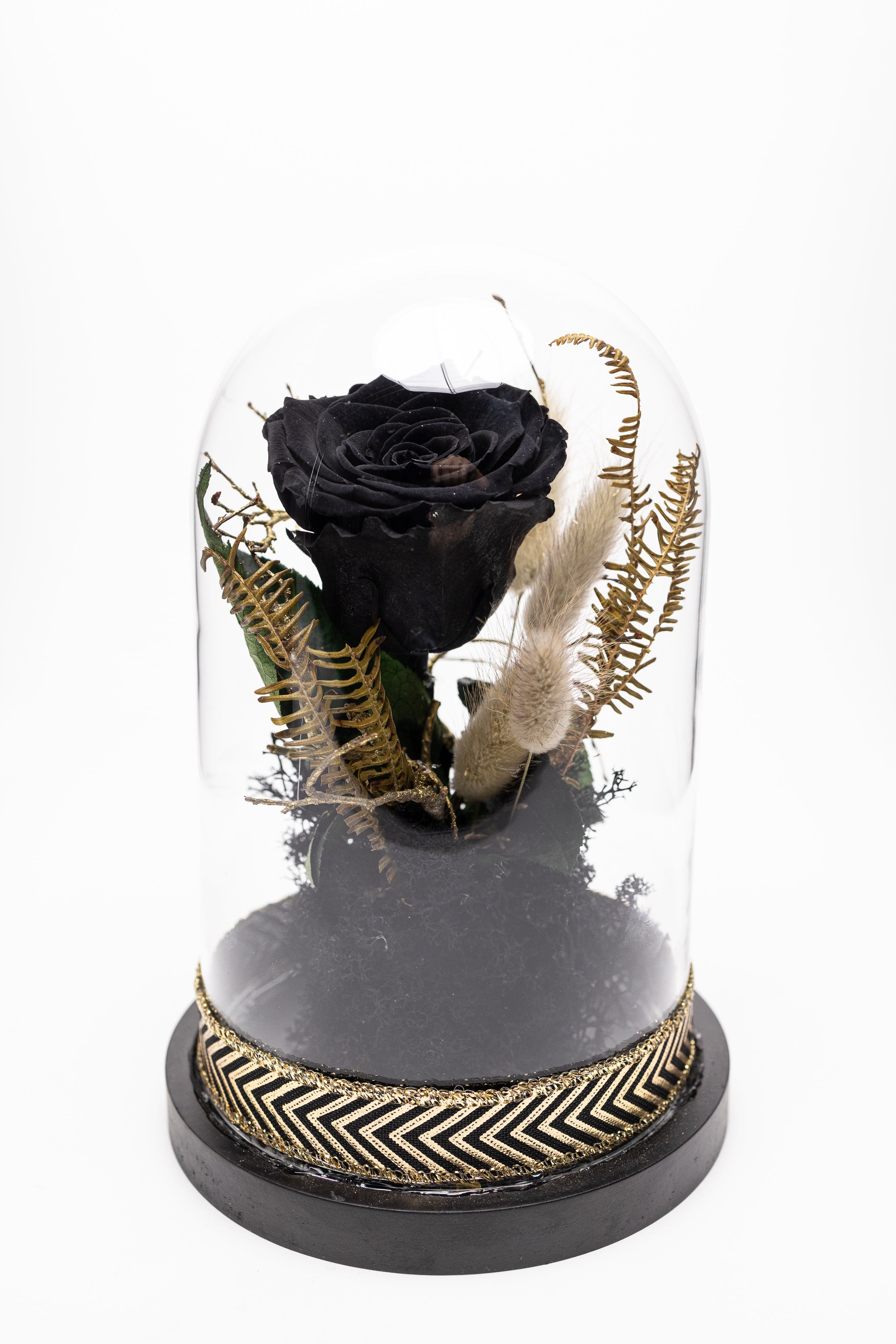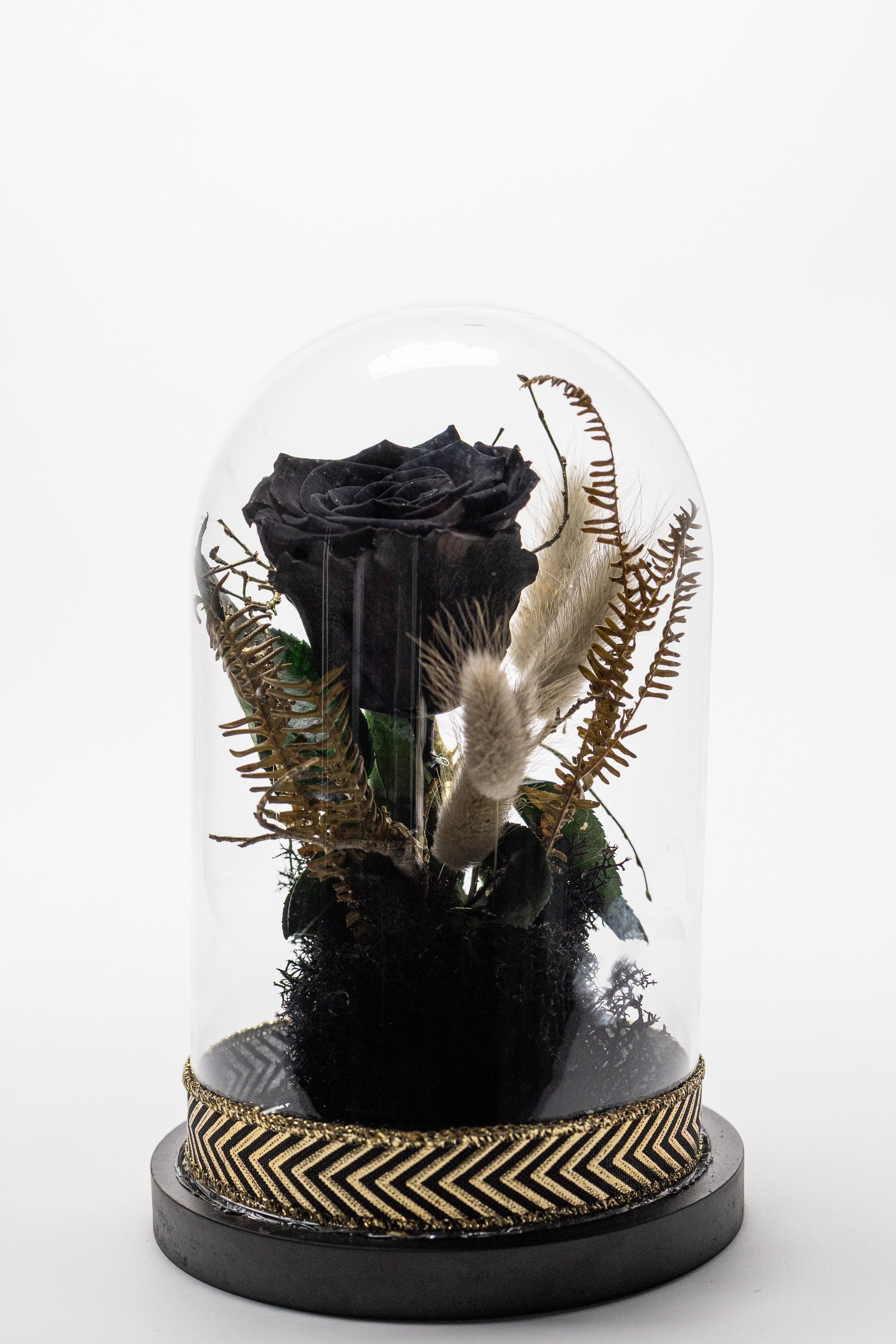 O piesă de decor exclusivistă ce emană mister și rafinament. Această cupolă de sticlă protejează un trandafir criogenat negru impunător, așezat pe un pat de mușchi natural și licheni negri. Compoziția este îmbogățită cu elemente vegetale veșnice rare (frunze tip ferigă) în nuanțe de auriu antic și este finisată la bază cu o bandă textilă elegantă cu model geometric negru-auriu. Un simbol al eleganței atemporale.