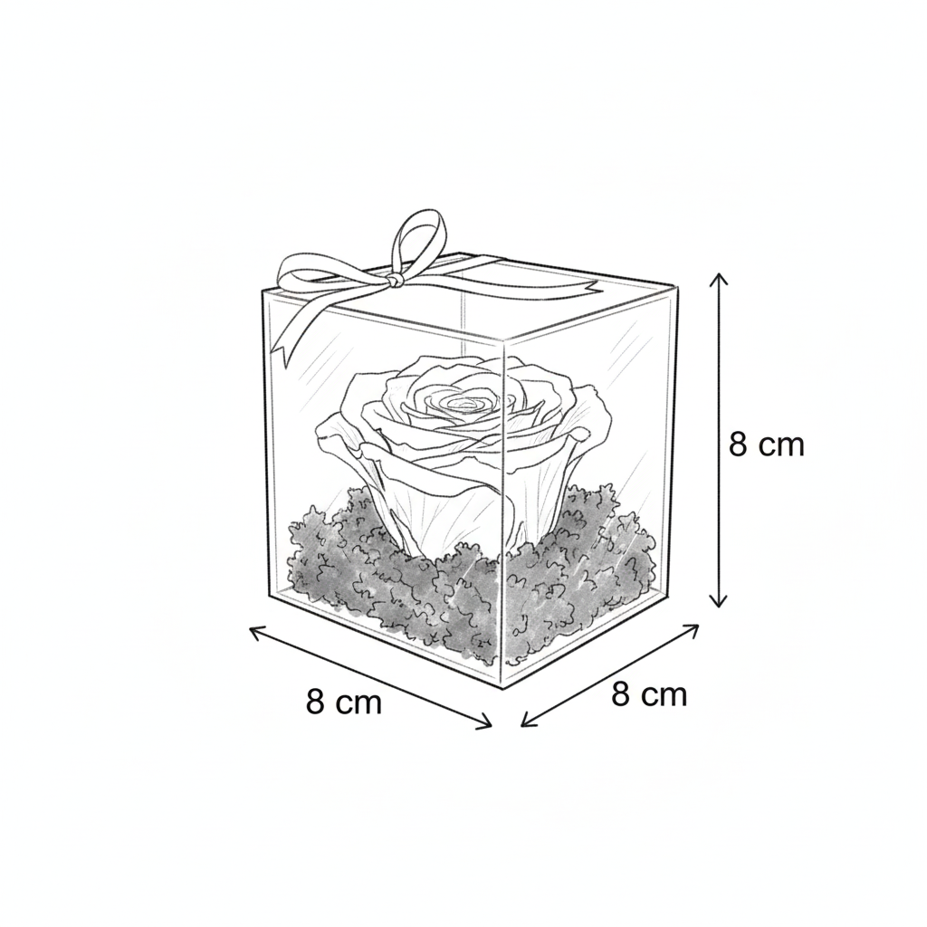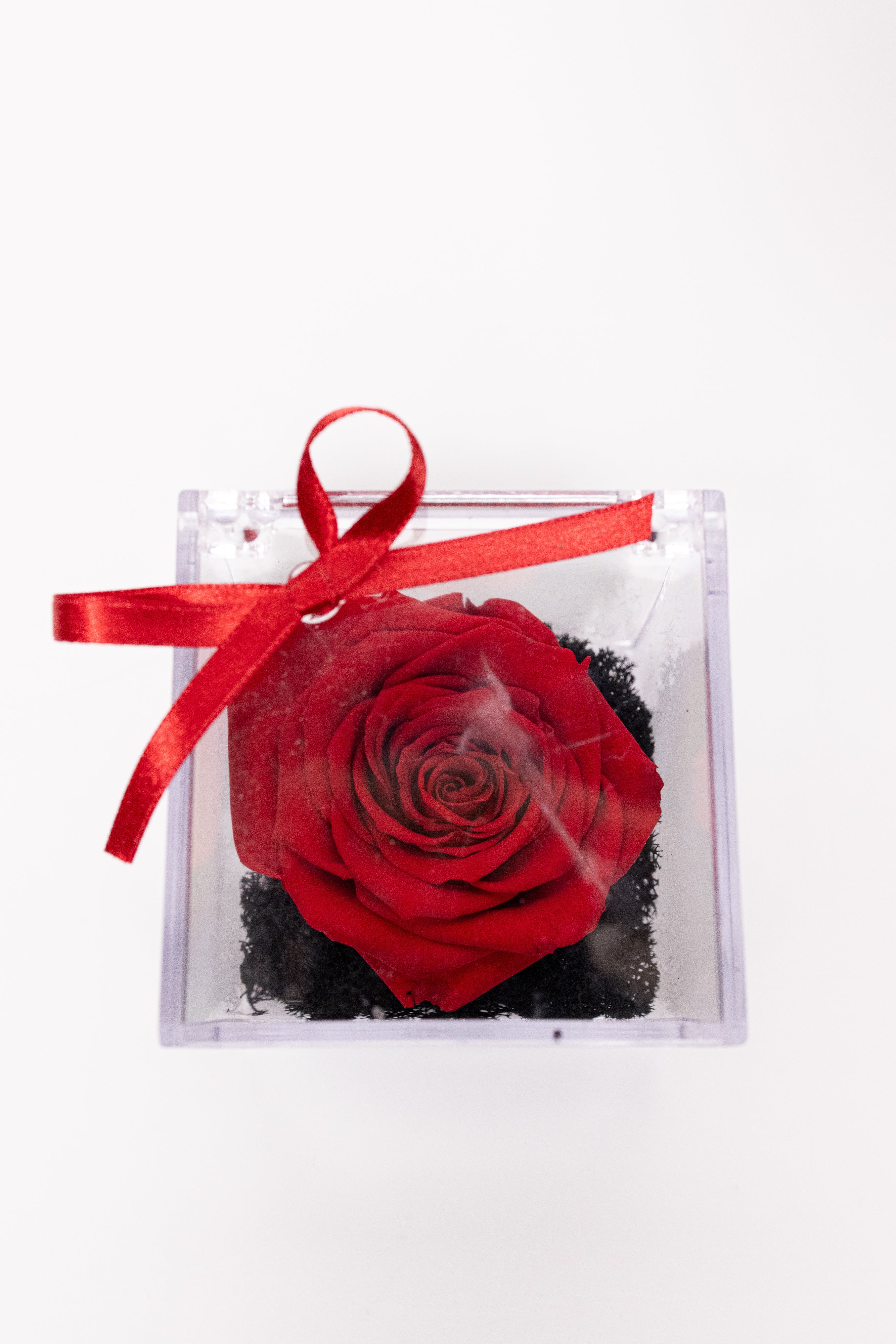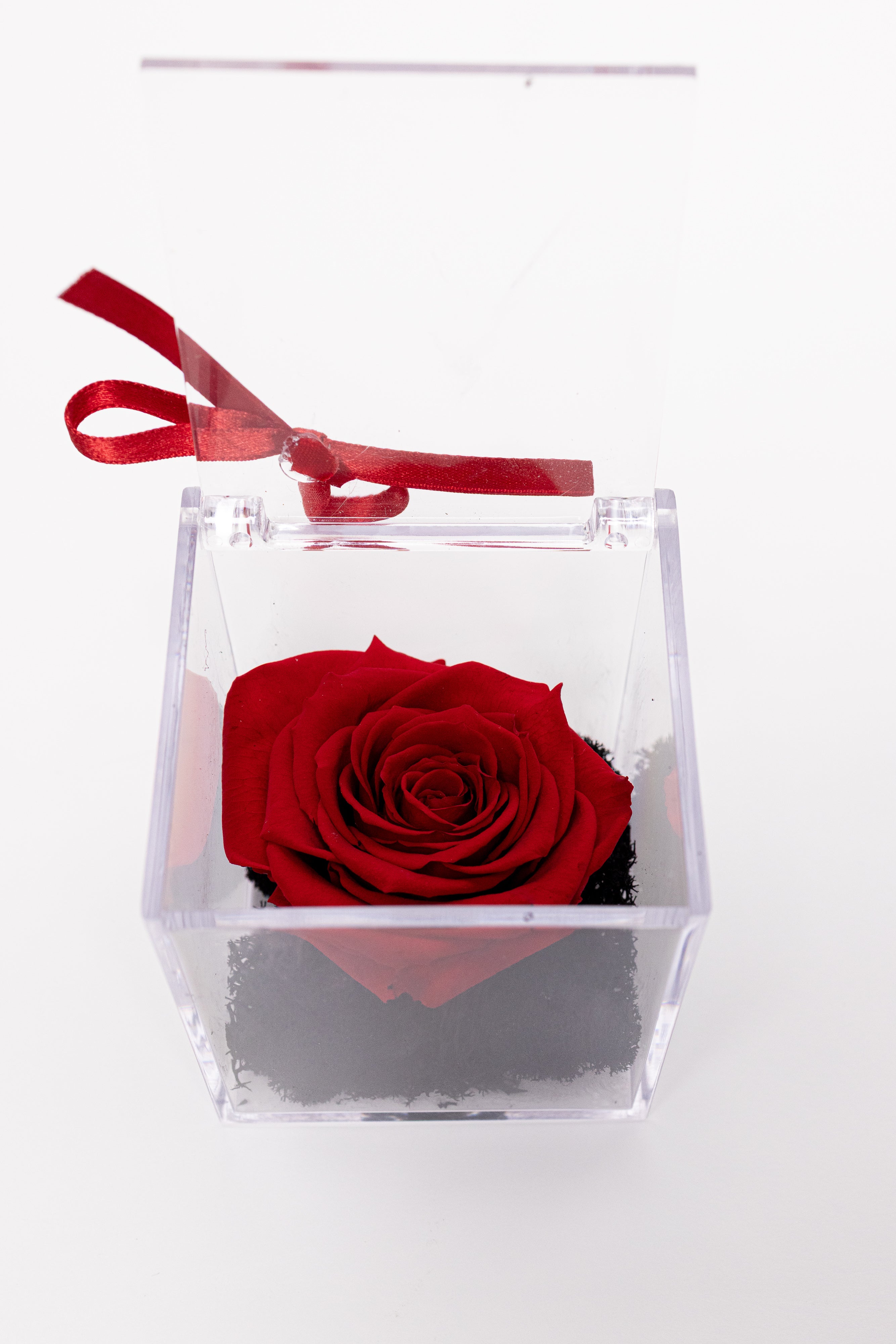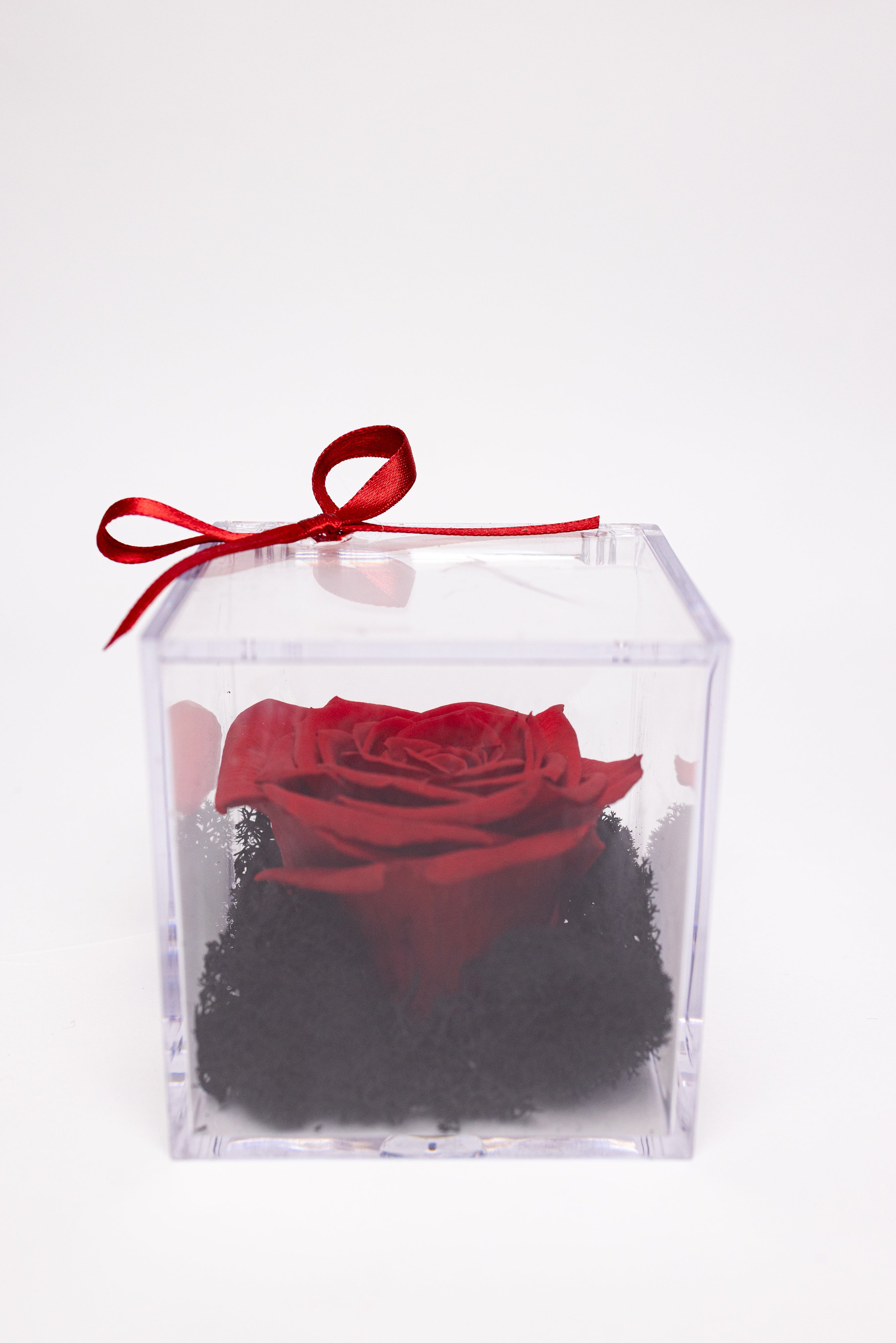 O piesă minimalistă și rafinată ce pune în valoare frumusețea naturală. Un trandafir criogenat roșu vibrant este așezat pe un pat contrastant de mușchi natural negru, protejat de o cutie pătrată transparentă din acril. Capacul este accesorizat discret cu o fundiță roșie subțire. Este definiția eleganței simple, un cadou modern și discret.